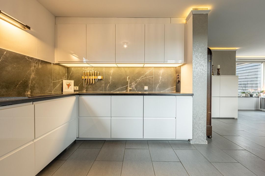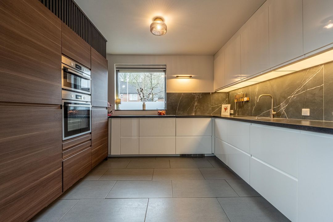 De keuken is voorzien van een inductiekookplaat met geïntegreerde afzuiging, oven, magnetron, vaatwasser, koelkast en vriezer. De keukenopstelling is in 2024 uitgebreid en de vaatwasser en inductiekookplaat zijn in 2025 vernieuwd. De keuken is uitgevoerd in een L -opstelling, waarbij de hoge kasten zijn afgewerkt met houtaccenten en de overige fronten zijn in een lichte kleurstelling uitgevoerd.