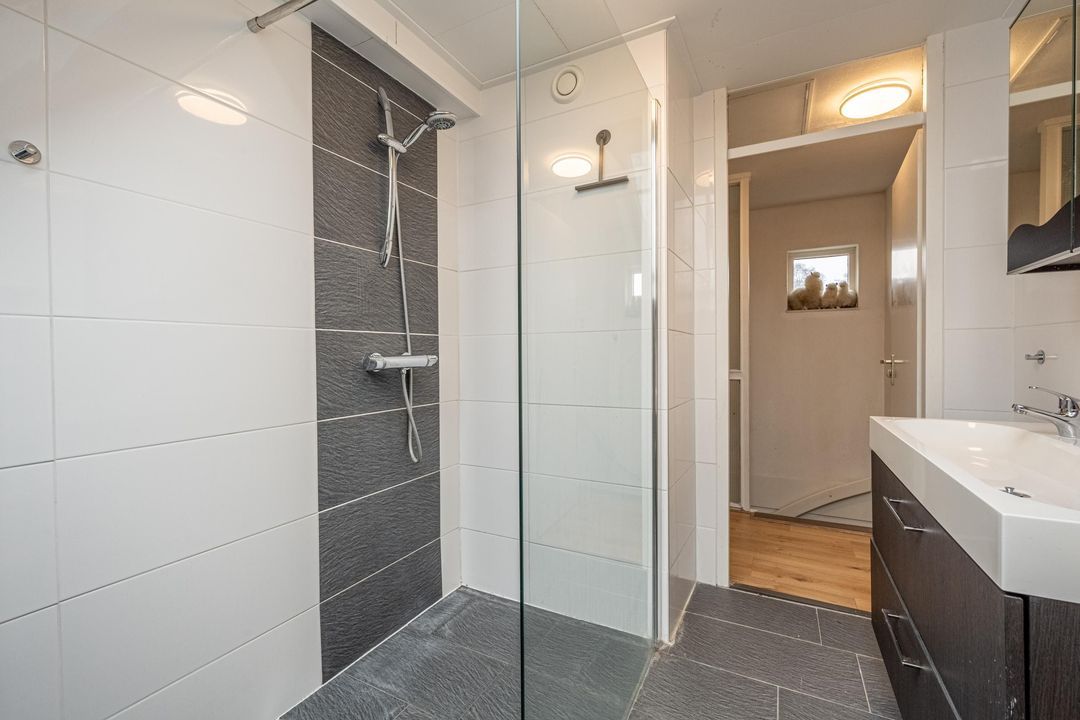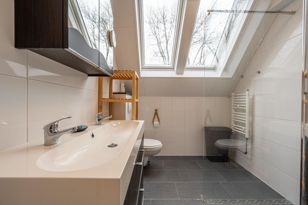 De badkamer is ingericht met inloopdouche, dubbele wastafel met meubel, spiegelkast en hangtoilet en is afgewerkt met grijs- en witgekleurde tegels. De badkamer beschikt over twee dakramen, wat zorgt voor extra daglicht en natuurlijke ventilatie.