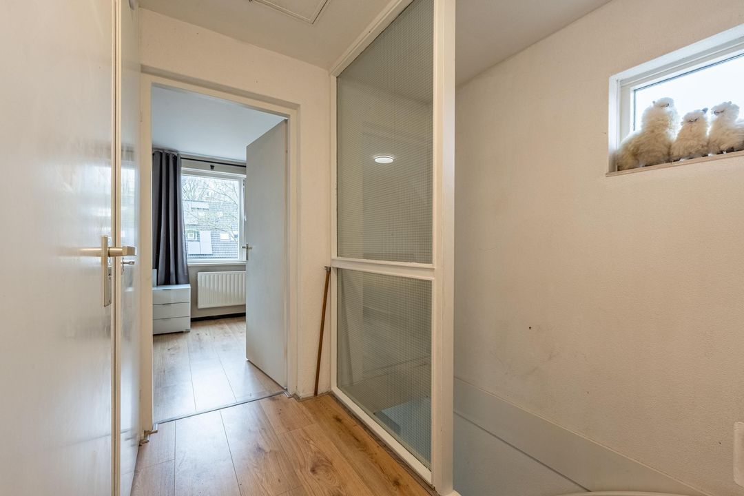 Daarnaast is vanuit de hal een ruime slaapkamer bereikbaar. Vanuit deze slaapkamer is er toegang tot een extra berging met aansluitingen voor wasmachine en droger. Vanuit deze berging is er de mogelijkheid om opnieuw een deur naar buiten te realiseren.