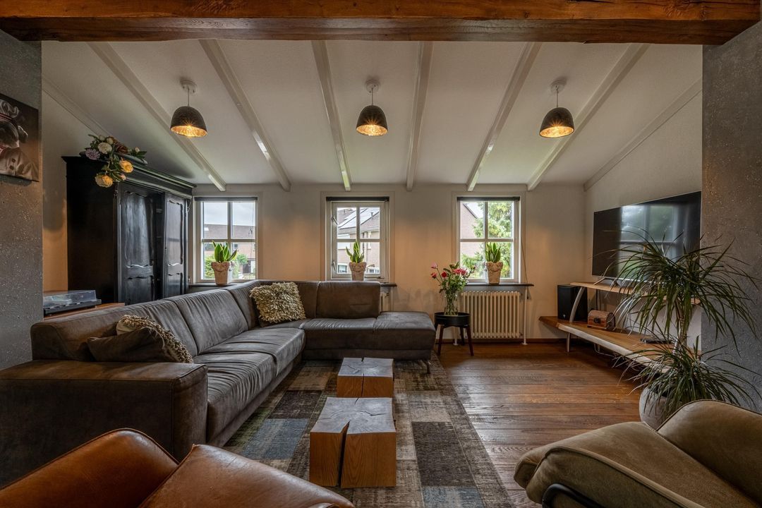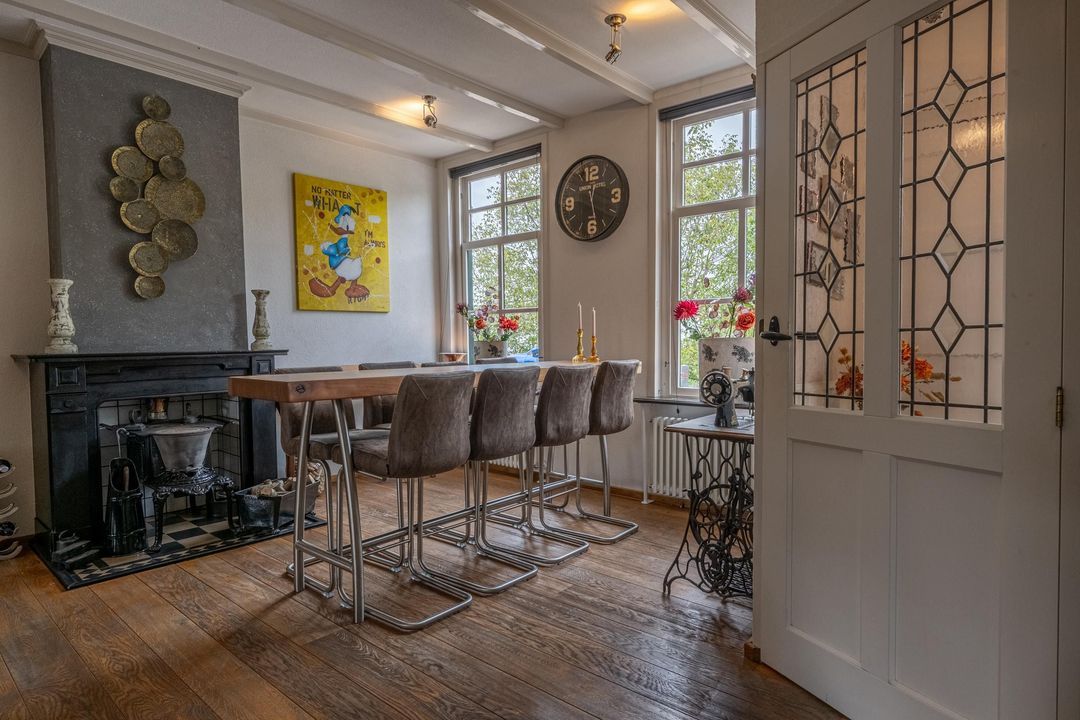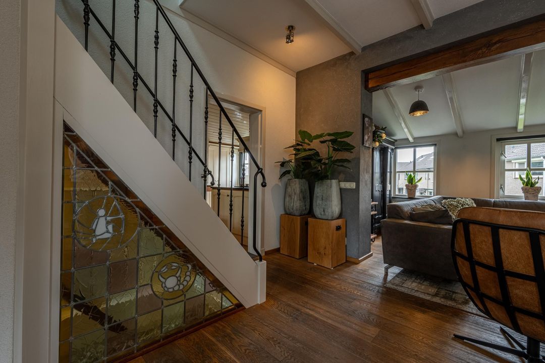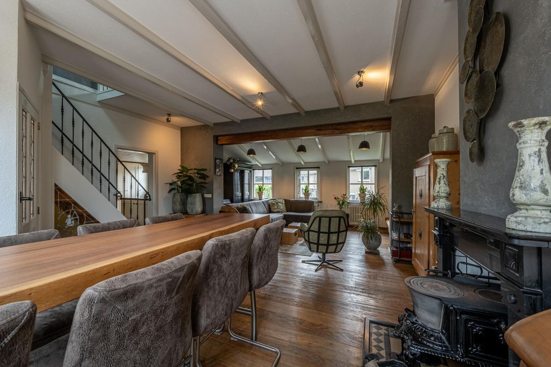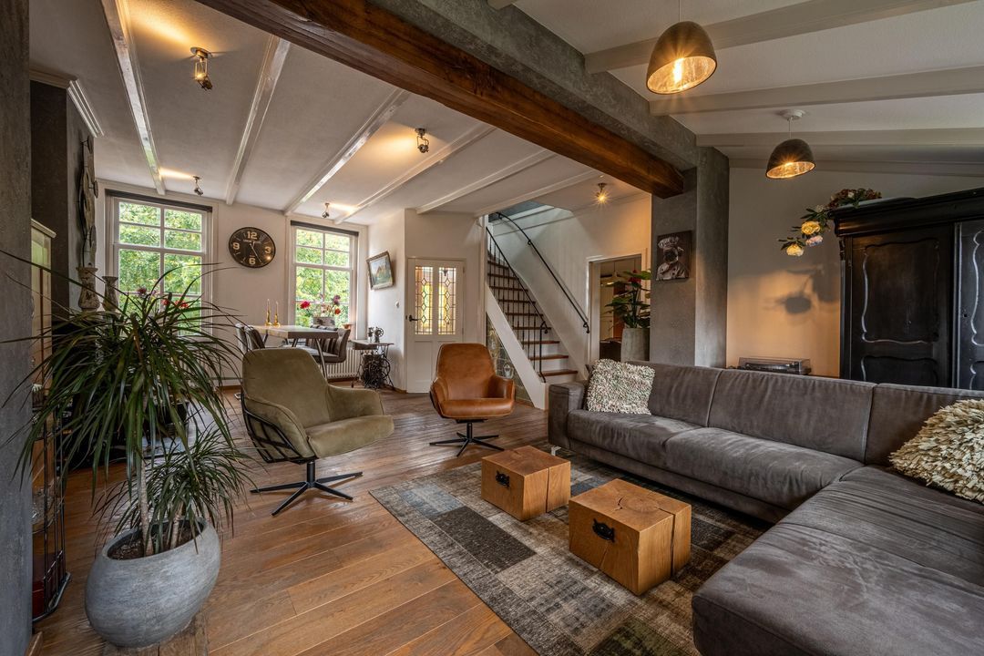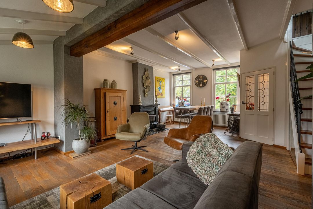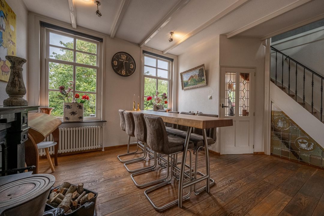 De woonkamer heeft een hoog balkenplafond, fraaie roedeverdeling in de ramen en een zwart marmeren schouw met werkende Belgische platte buis kachel, gestookt op hout en kolen. De massief eiken vloer, de Merbau trap met smeedijzeren leuning en de designradiatoren in klassieke stijl maken het geheel compleet. Dankzij de vele ramen is er volop lichtinval en een warme, uitnodigende sfeer. Een sfeervol detail is de voordeur met glas-in-lood en de oude trekbel bij de entree.