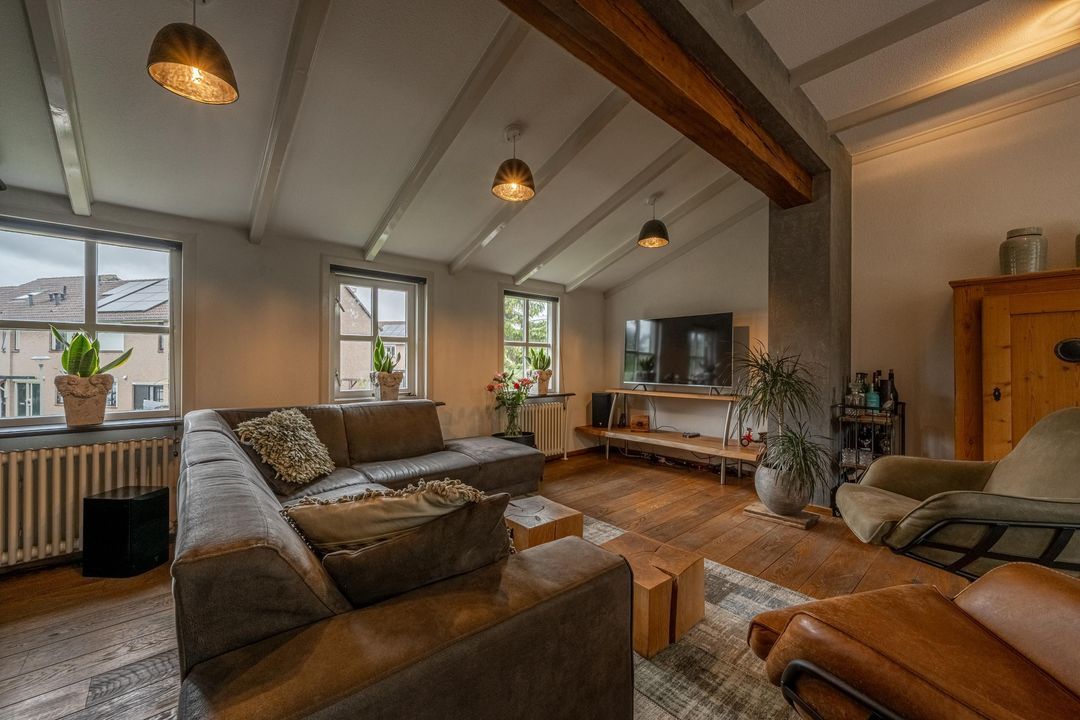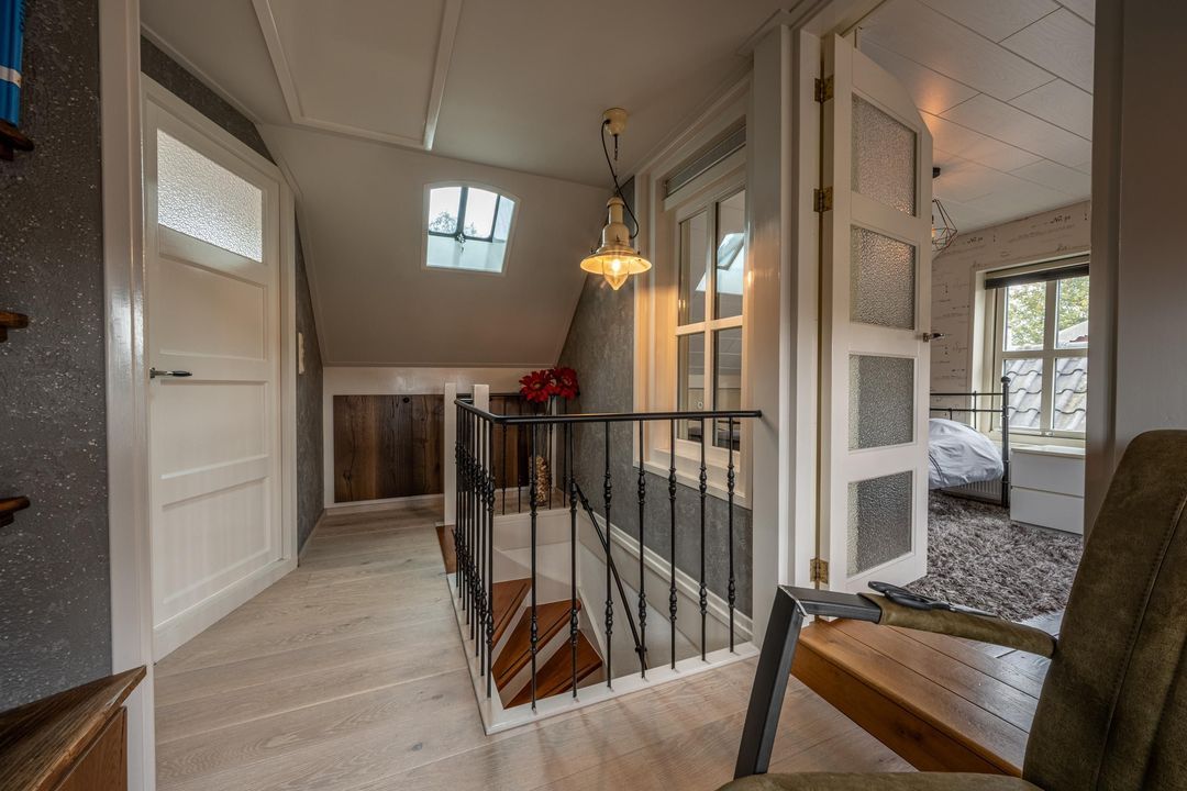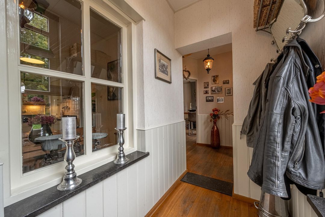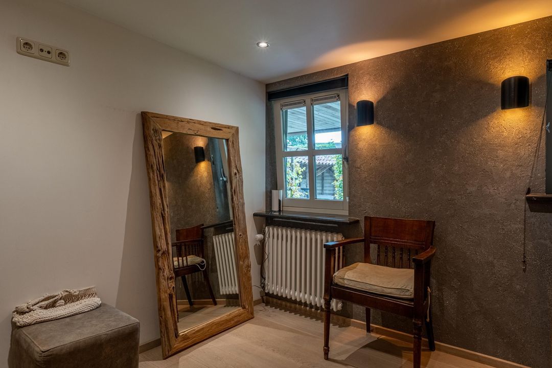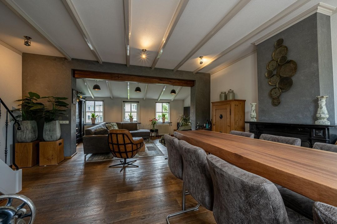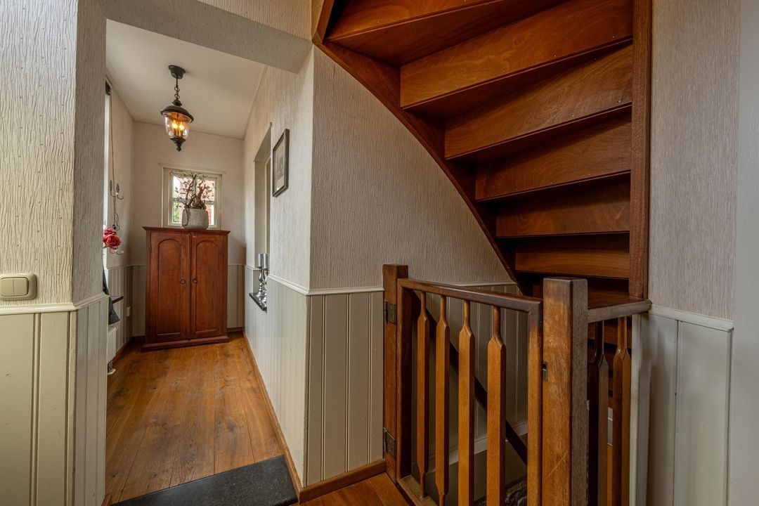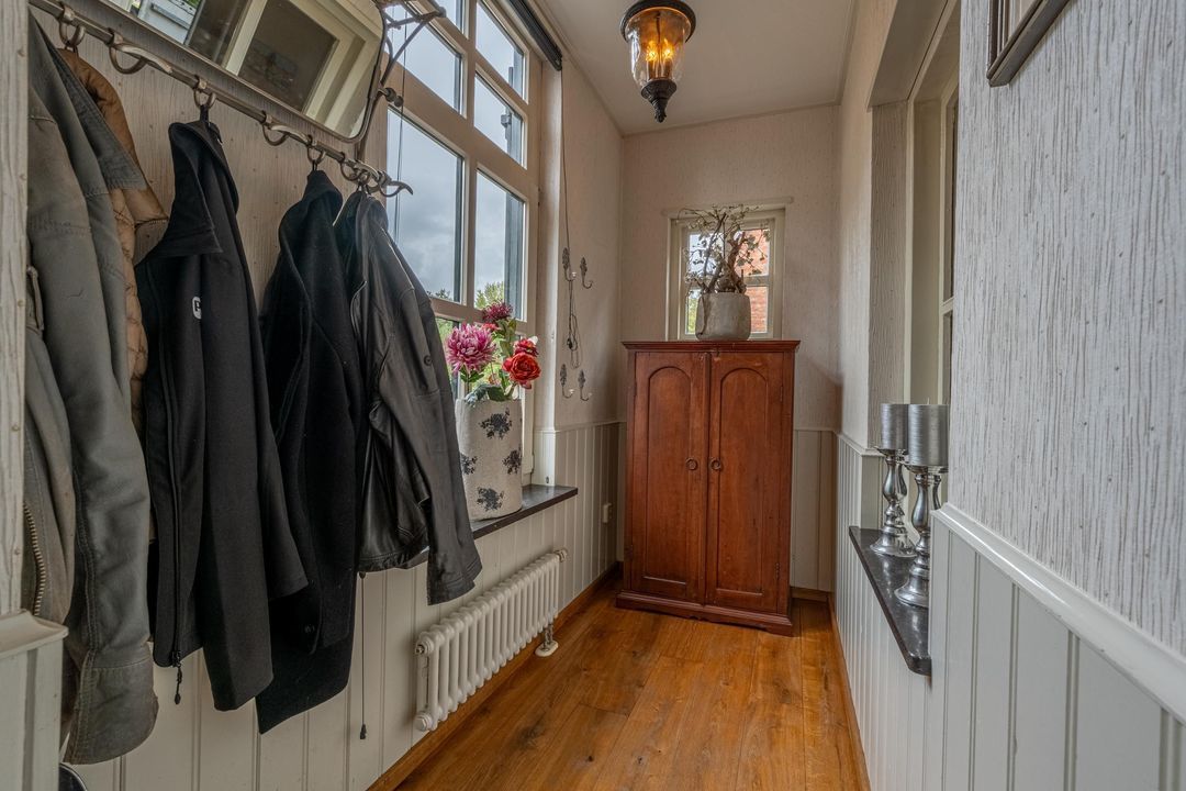 De woonkamer heeft een hoog balkenplafond, fraaie roedeverdeling in de ramen en een zwart marmeren schouw met werkende Belgische platte buis kachel, gestookt op hout en kolen. De massief eiken vloer, de Merbau trap met smeedijzeren leuning en de designradiatoren in klassieke stijl maken het geheel compleet. Dankzij de vele ramen is er volop lichtinval en een warme, uitnodigende sfeer. Een sfeervol detail is de voordeur met glas-in-lood en de oude trekbel bij de entree.