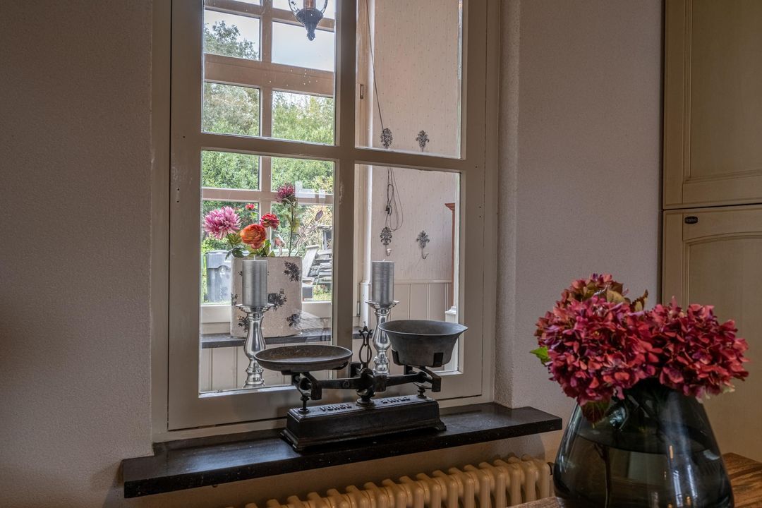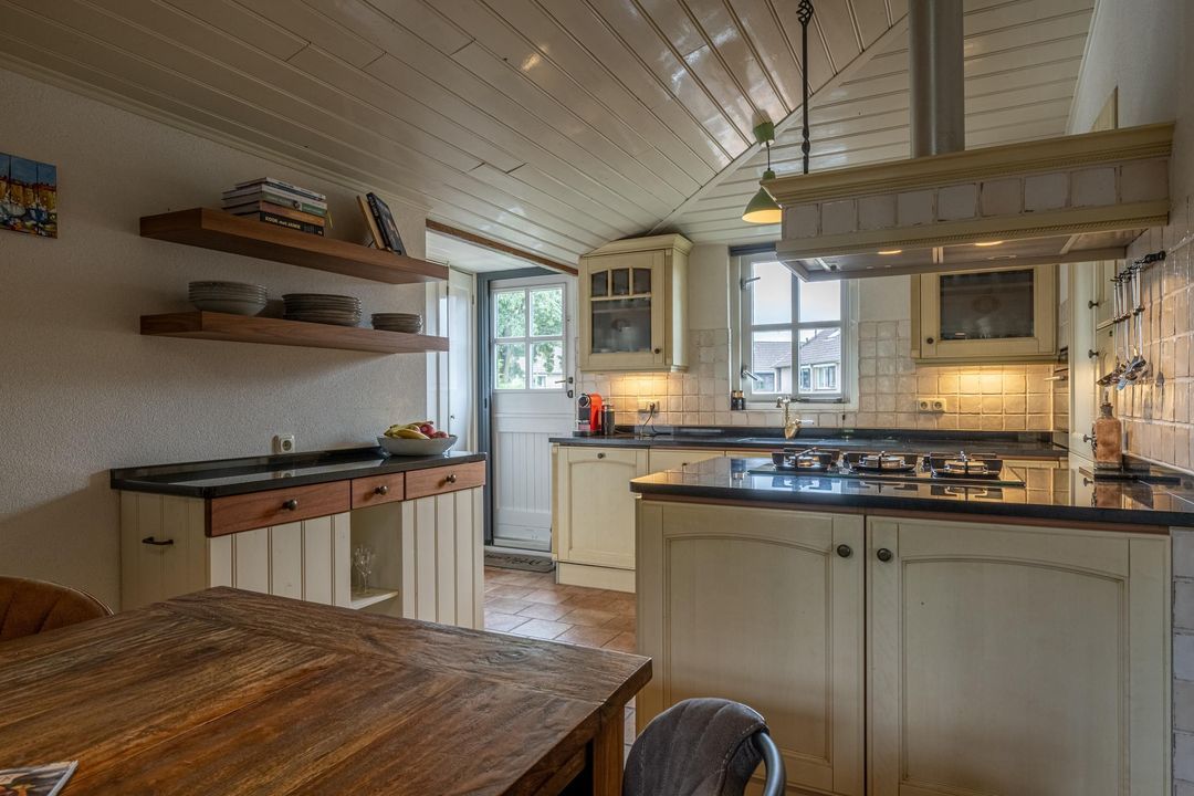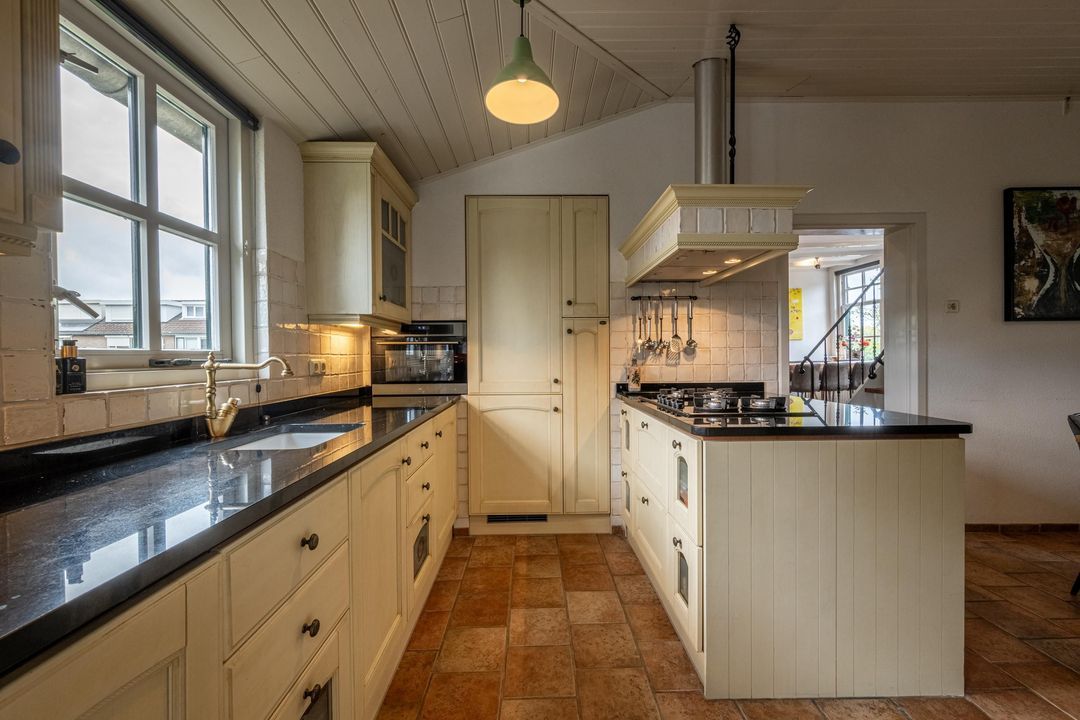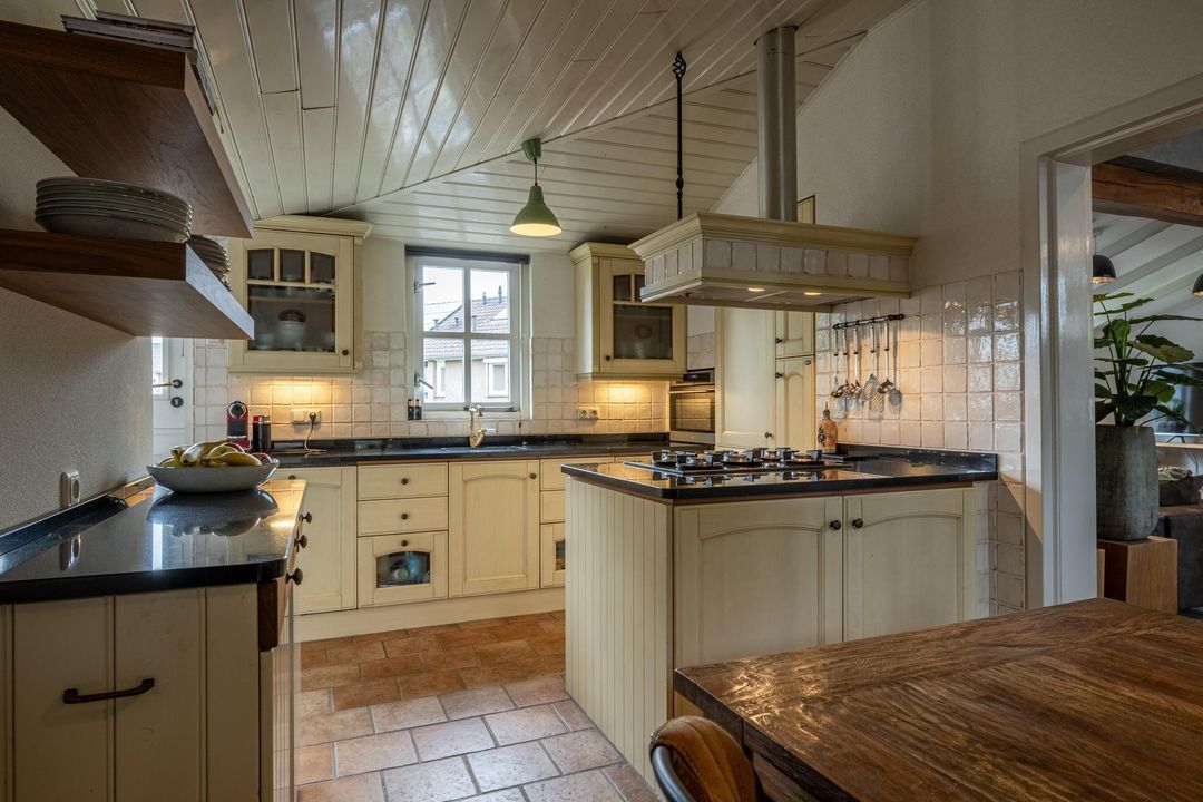 De keuken is uitgevoerd in oud-Hollandse stijl, met kasten in gebroken wit / zachtgeel, een massief granieten werkblad en terracotta plavuizen met vloerverwarming. Hier vind je veel kastruimte en plaats voor een royale eettafel. De openslaande deur leidt naar het balkon met stalen spiltrap naar de tuin, waardoor binnen en buiten mooi met elkaar verbonden zijn. Ook praktisch is de kast met de recent vernieuwde Remeha cv-ketel (2025). De keuken combineert nostalgische charme met hedendaags gebruiksgemak en vormt zo een belangrijk deel van de woning.