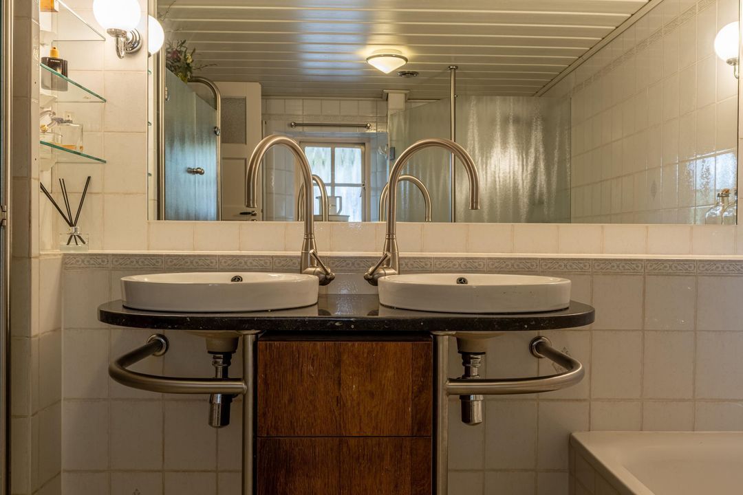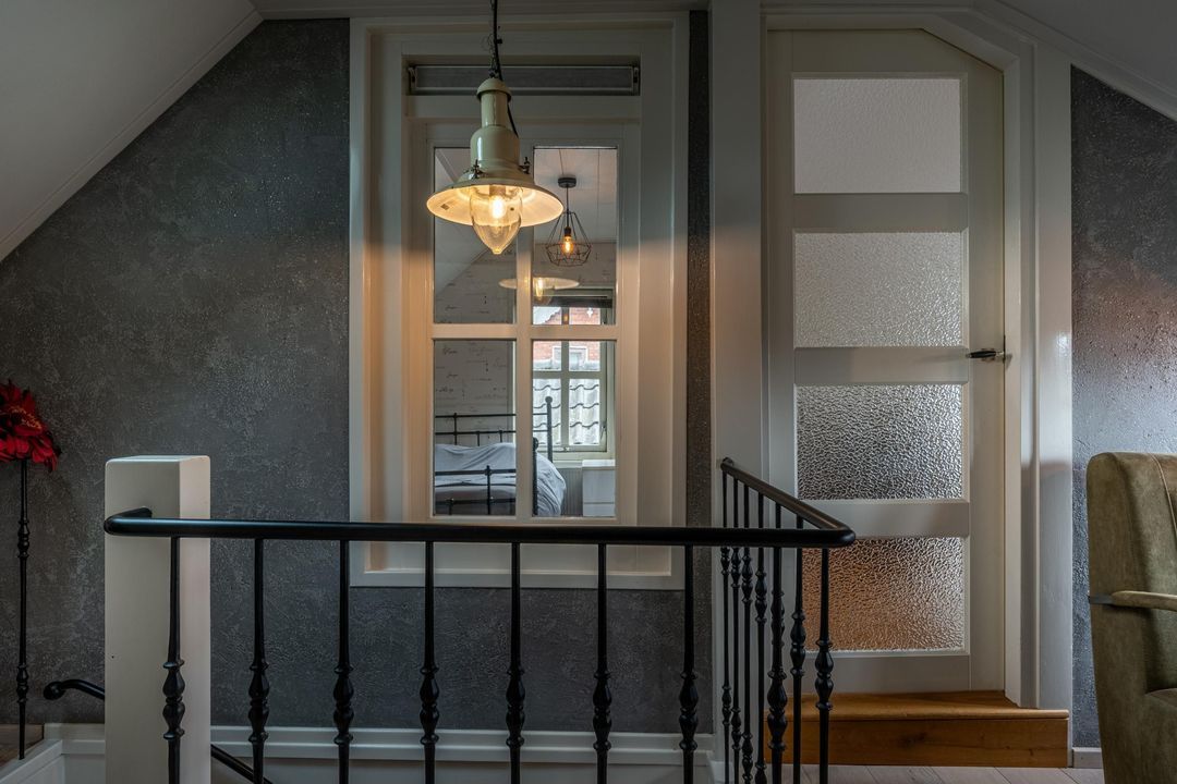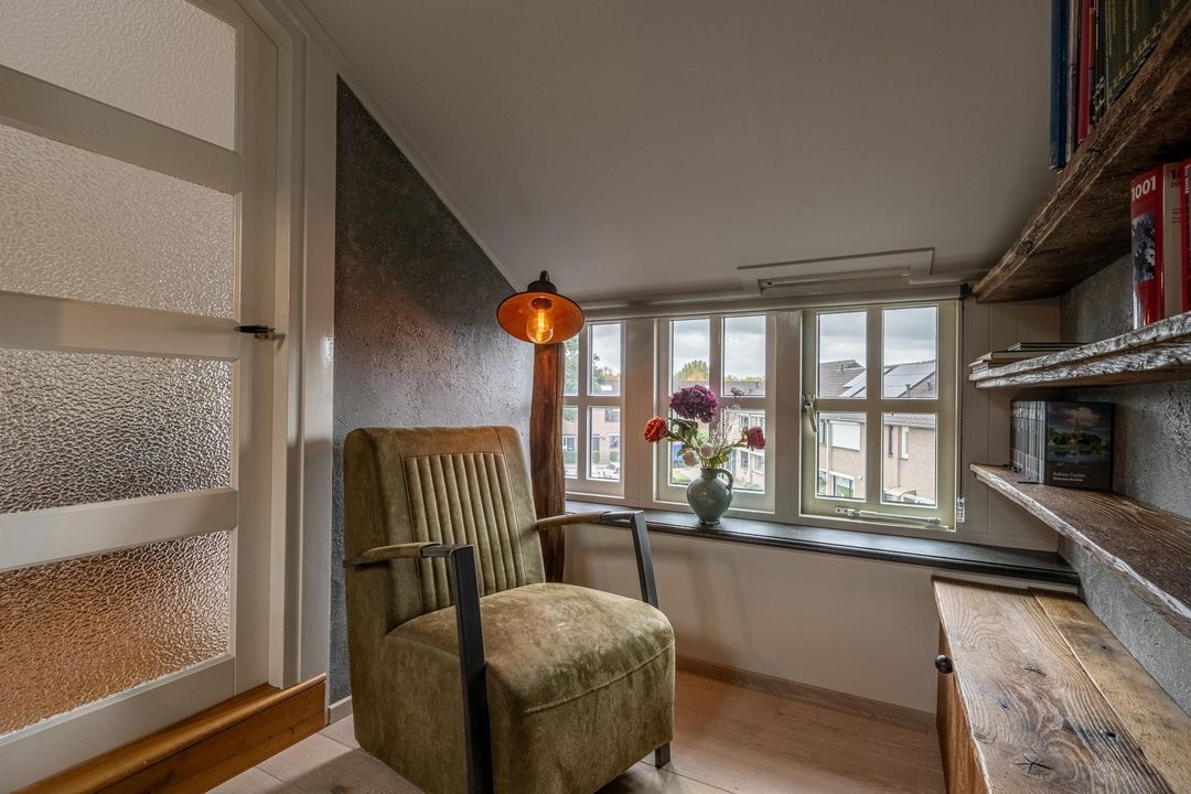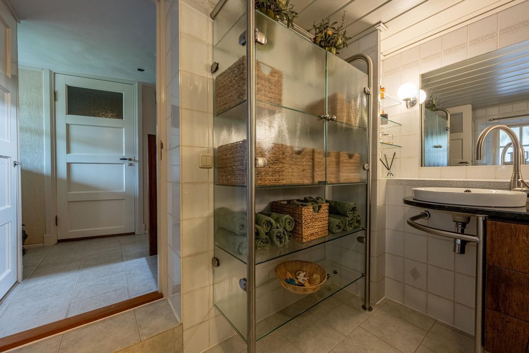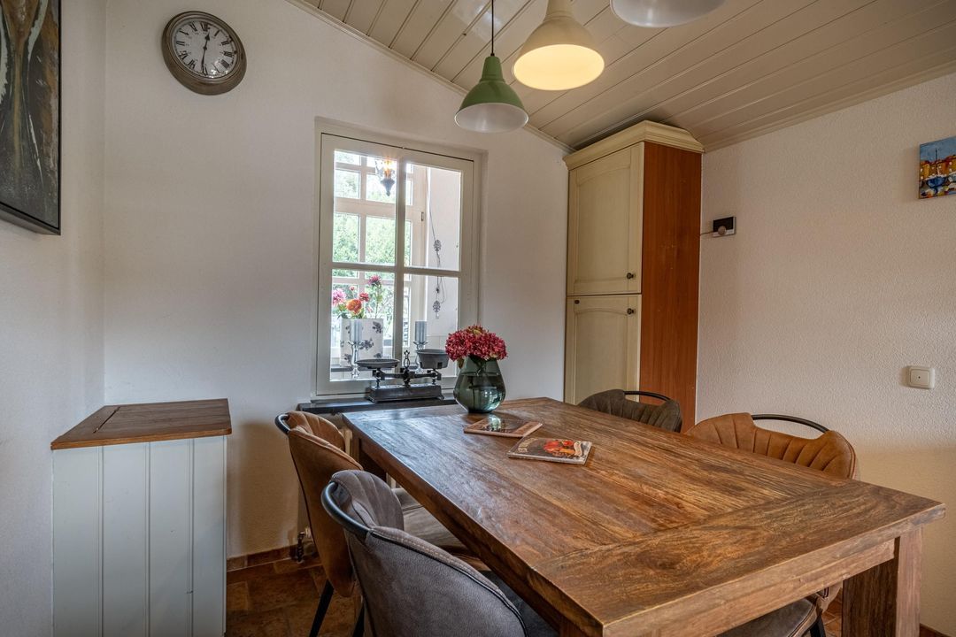 De keuken is uitgevoerd in oud-Hollandse stijl, met kasten in gebroken wit / zachtgeel, een massief granieten werkblad en terracotta plavuizen met vloerverwarming. Hier vind je veel kastruimte en plaats voor een royale eettafel. De openslaande deur leidt naar het balkon met stalen spiltrap naar de tuin, waardoor binnen en buiten mooi met elkaar verbonden zijn. Ook praktisch is de kast met de recent vernieuwde Remeha cv-ketel (2025). De keuken combineert nostalgische charme met hedendaags gebruiksgemak en vormt zo een belangrijk deel van de woning.