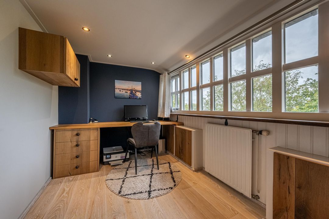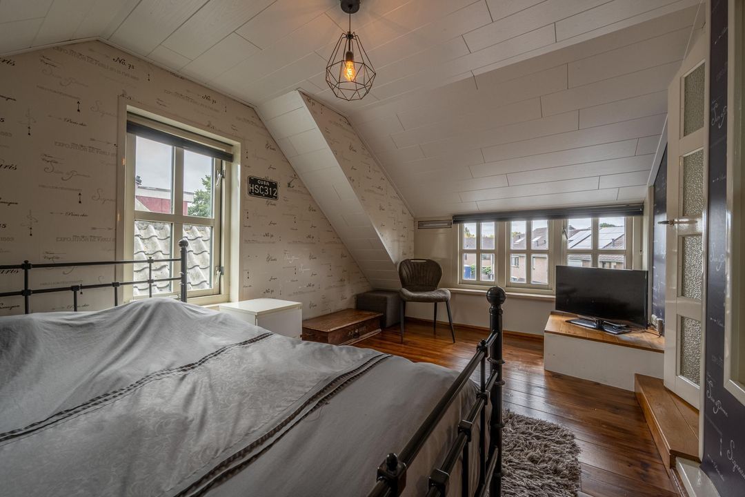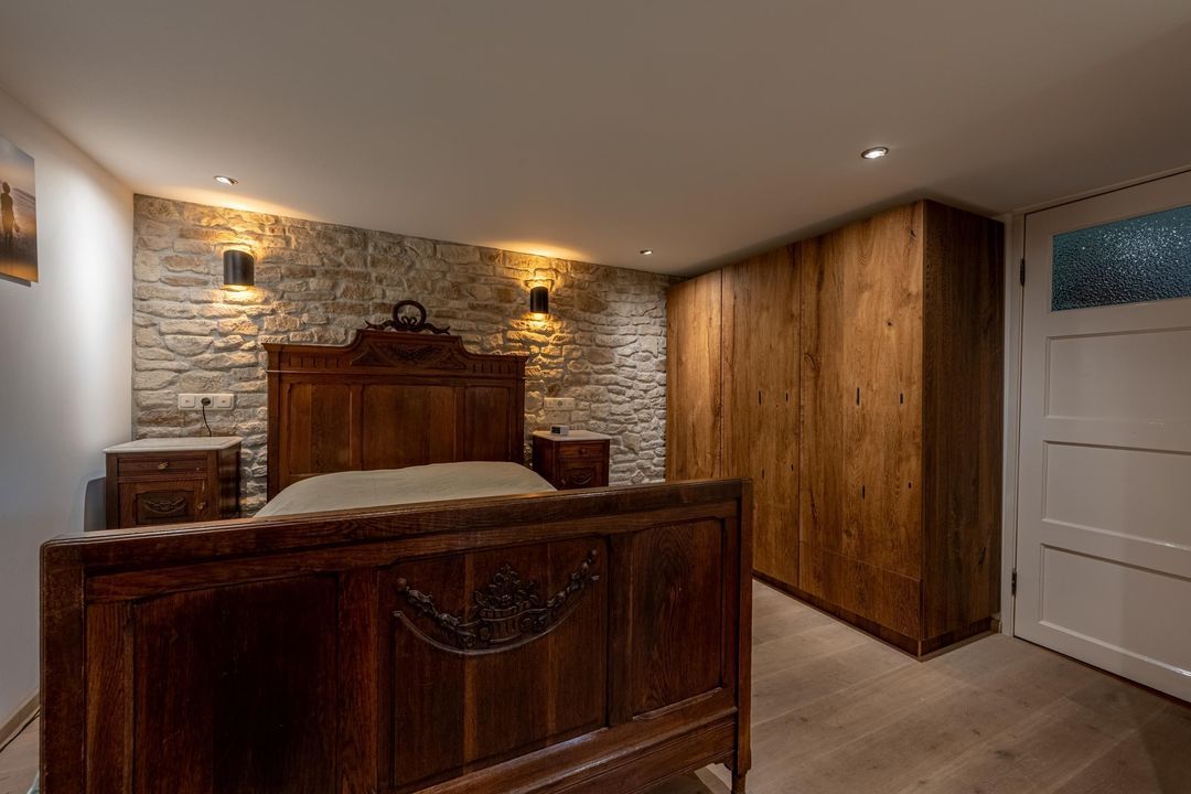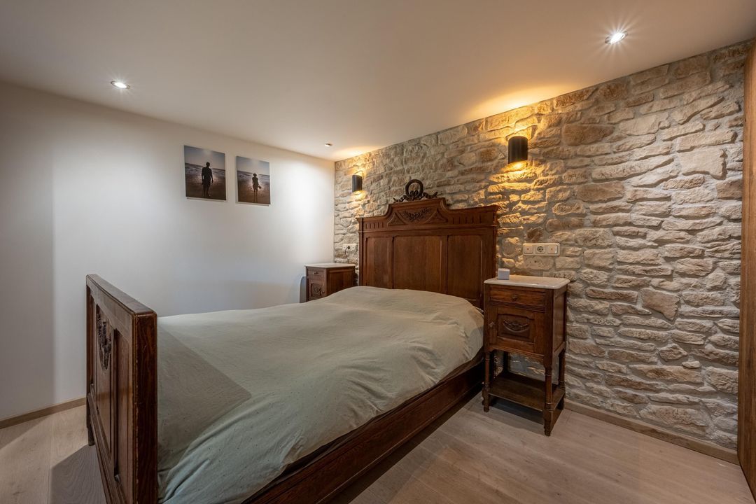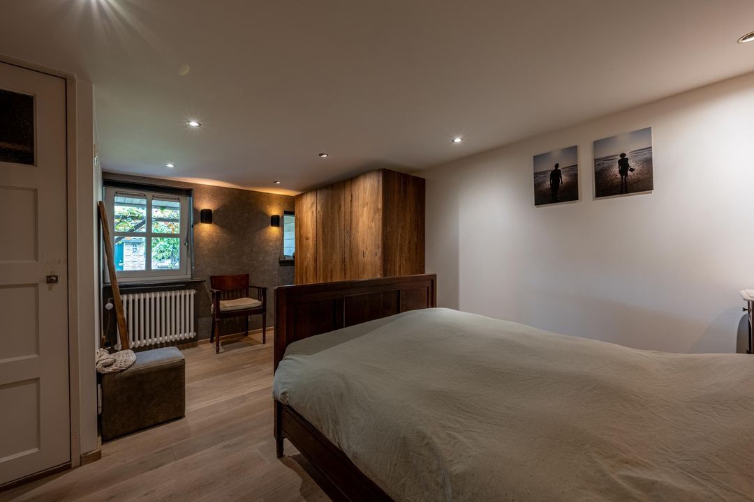 De woning telt vier slaapkamers, waarvan drie op de eerste verdieping, één met vast bureau. De verdieping is afgewerkt met lamelparket of grenen vloerdelen, glad gestucte wanden, roedeverdeling in de ramen en een klassieke balustrade om het trapgat. In het onderhuis bevindt zich een sfeervolle slaapkamer met fraaie stenen wand, spots en vaste kast. Hier vind je ook de badkamer met vloerverwarming, douchehoek, ligbad en dubbele wastafel, evenals een tweede toilet, bergkast en wasruimte.