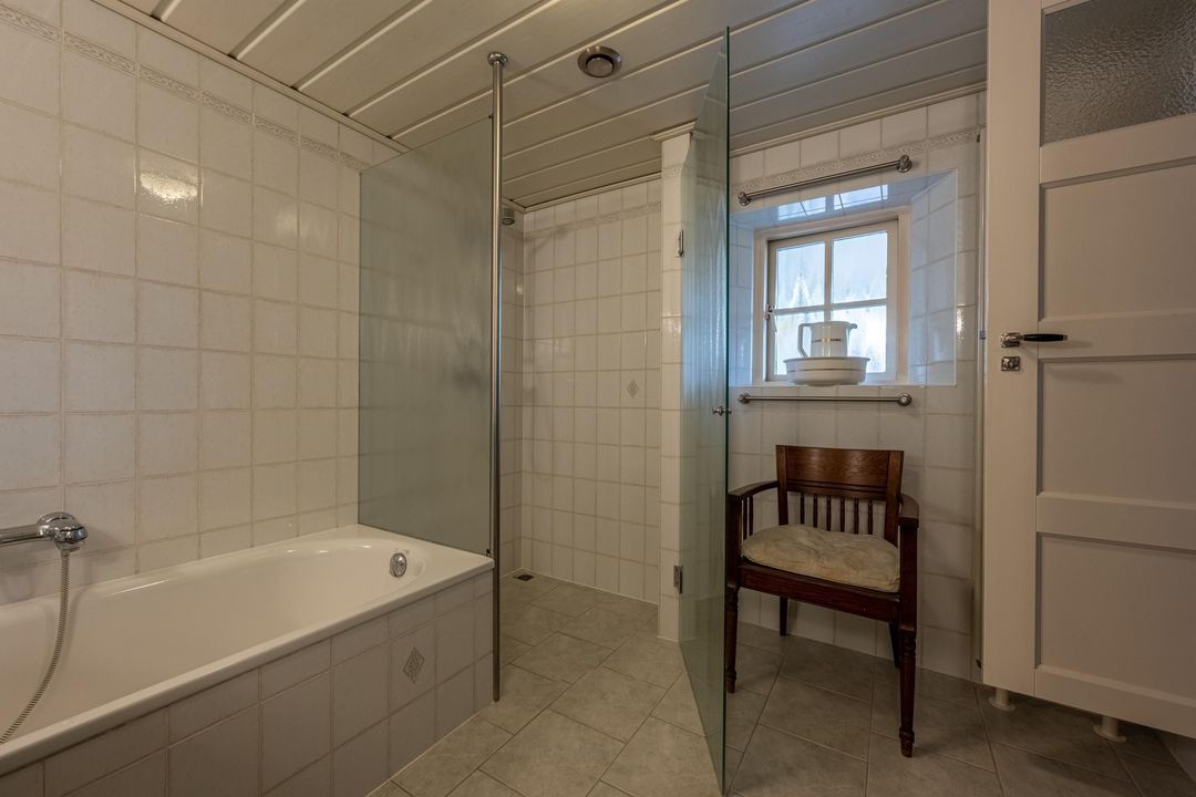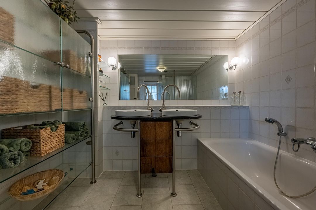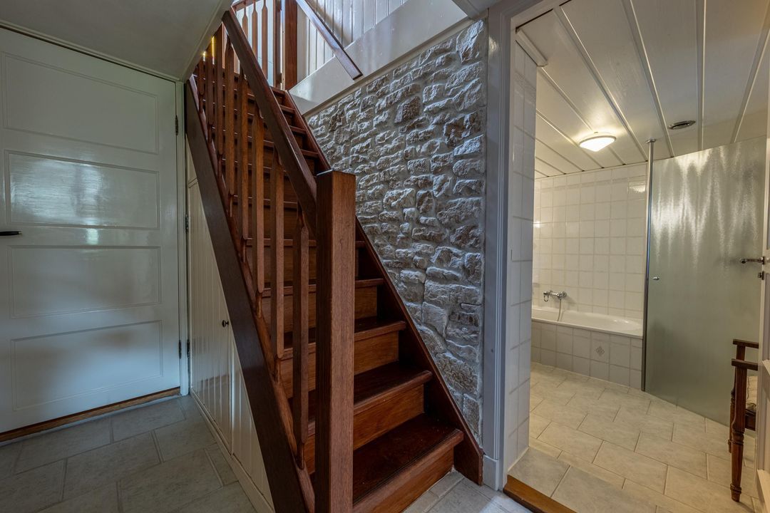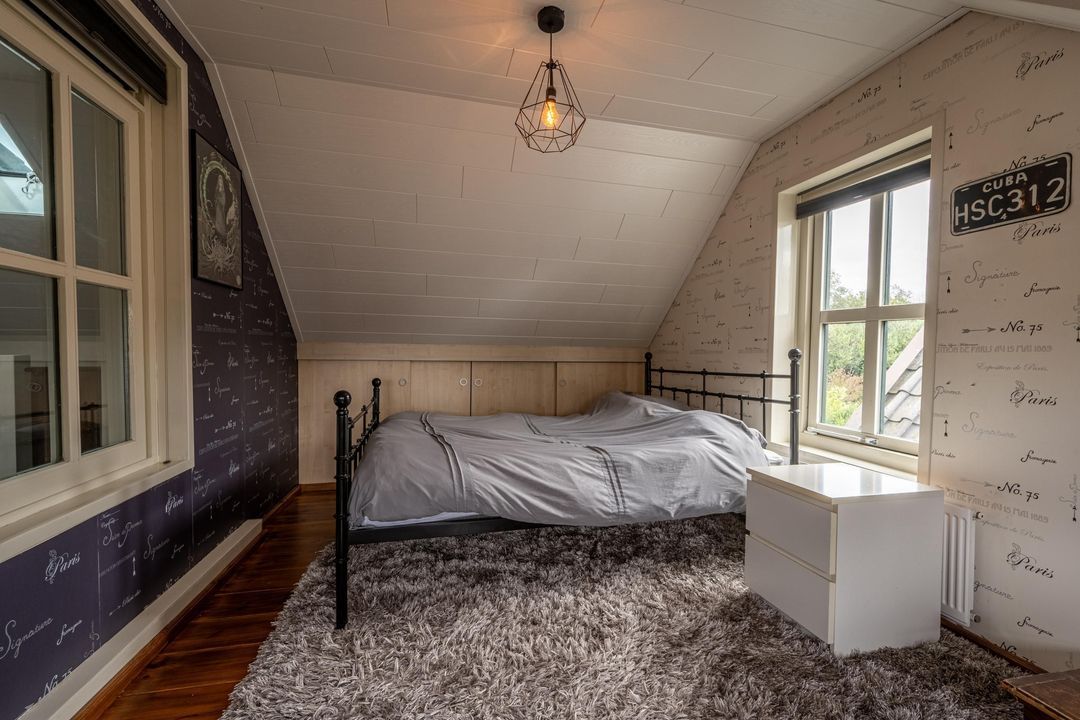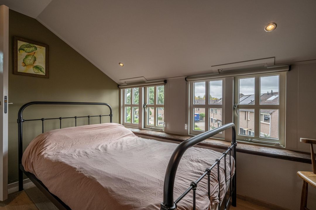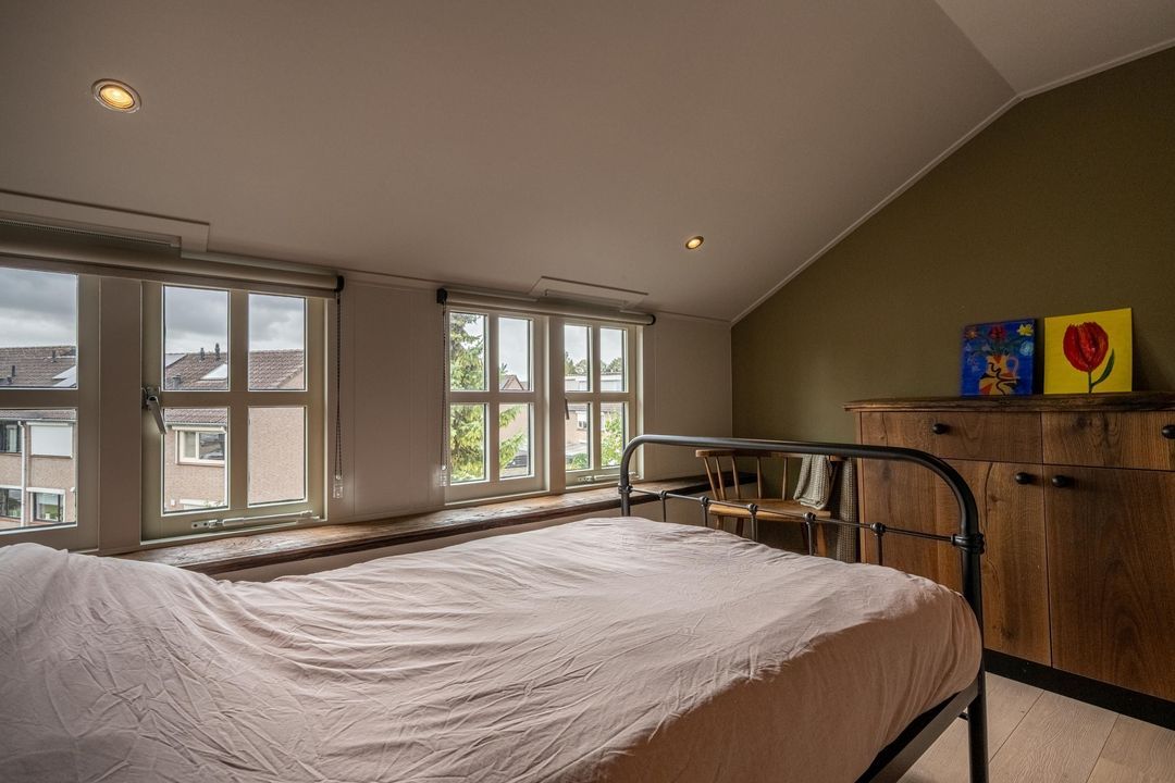 De woning telt vier slaapkamers, waarvan drie op de eerste verdieping, één met vast bureau. De verdieping is afgewerkt met lamelparket of grenen vloerdelen, glad gestucte wanden, roedeverdeling in de ramen en een klassieke balustrade om het trapgat. In het onderhuis bevindt zich een sfeervolle slaapkamer met fraaie stenen wand, spots en vaste kast. Hier vind je ook de badkamer met vloerverwarming, douchehoek, ligbad en dubbele wastafel, evenals een tweede toilet, bergkast en wasruimte.