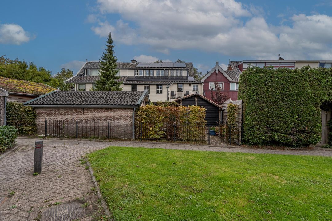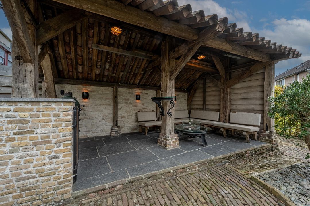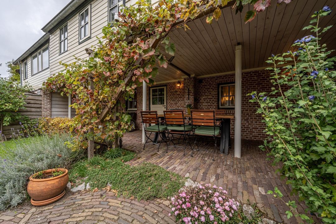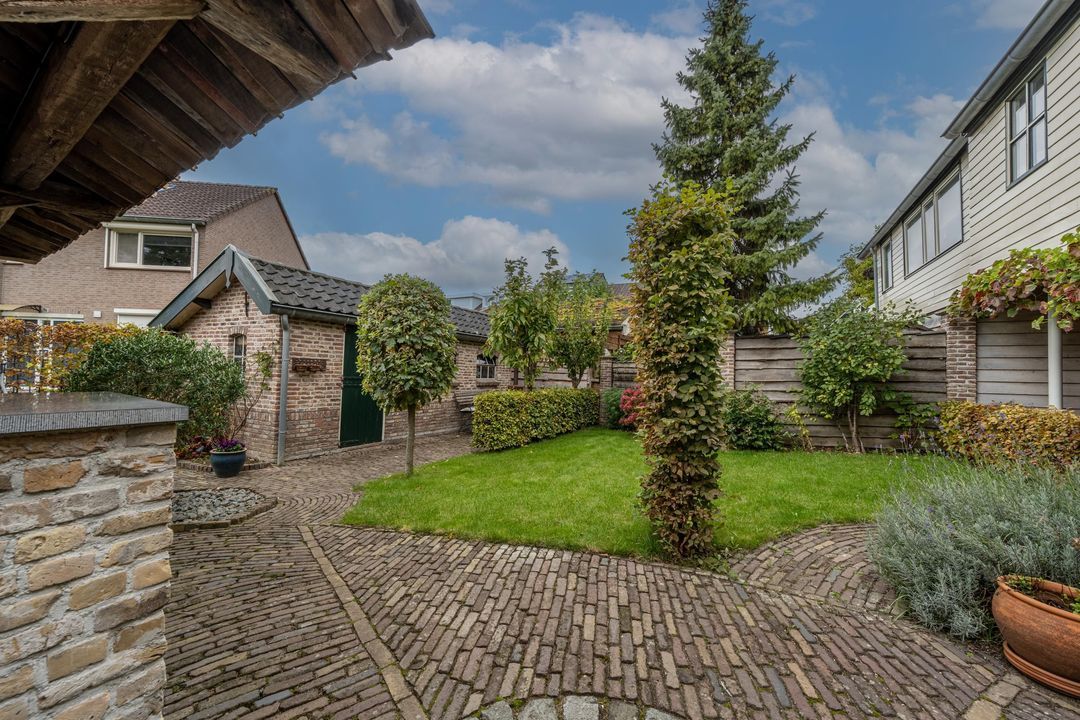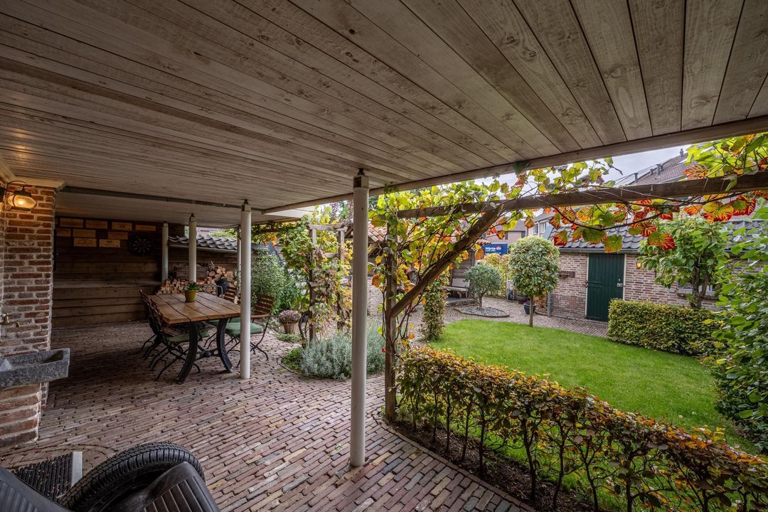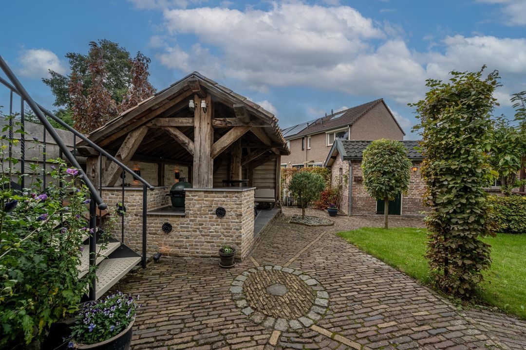 De achtertuin is breed, zonnig en keurig onderhouden. Je kunt zowel achterom als voorom de tuin bereiken. De kapschuur (2021) van oud eiken heeft een Italiaanse hardstenen vloer, fraaie stenen wanden (Franse keien, net als in de slaapkamer) en een gasaansluiting (op fles). Daarnaast is er een stenen schuur (2000) met pannendak en elektra. De tuin is voorzien van tuinverlichting en grenst aan een speelplaatsje met slechts bestemmingsverkeer.