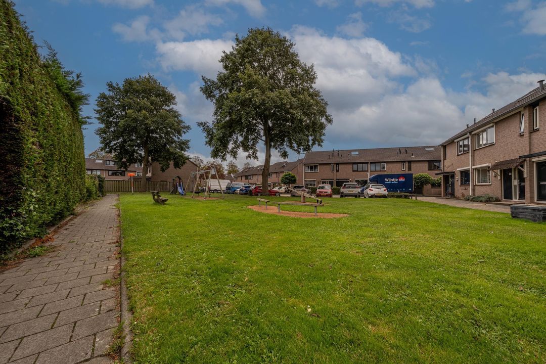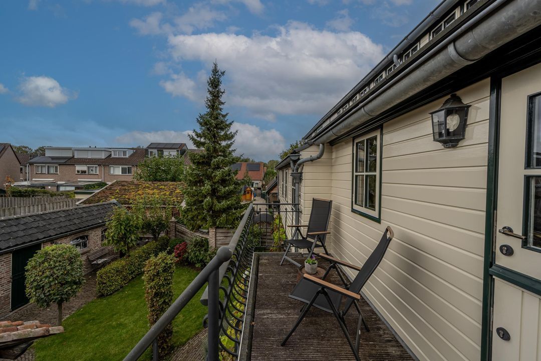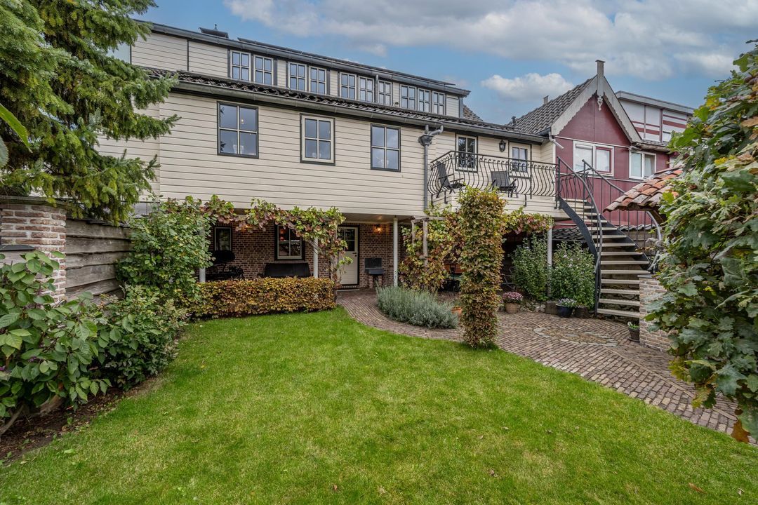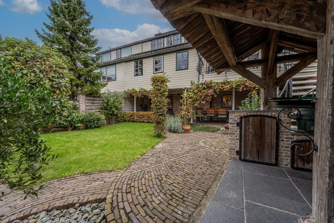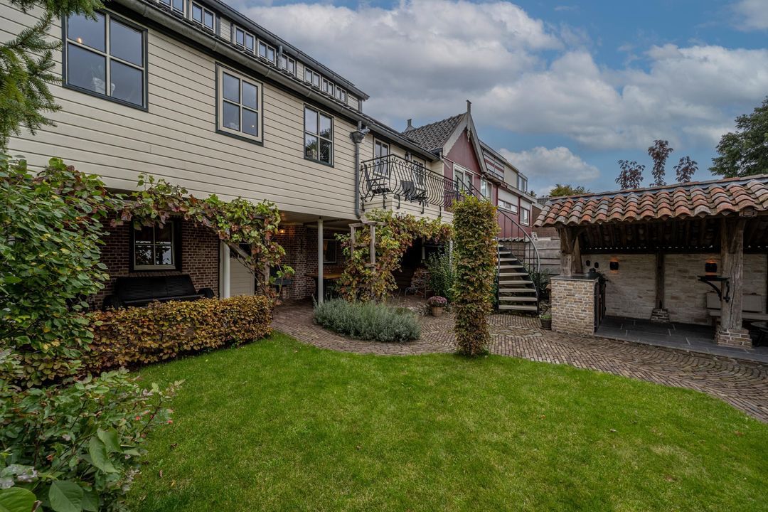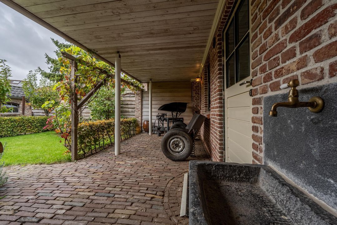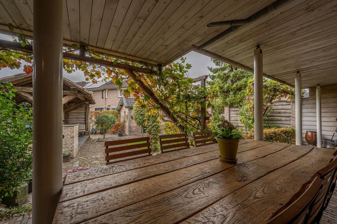 De achtertuin is breed, zonnig en keurig onderhouden. Je kunt zowel achterom als voorom de tuin bereiken. De kapschuur (2021) van oud eiken heeft een Italiaanse hardstenen vloer, fraaie stenen wanden (Franse keien, net als in de slaapkamer) en een gasaansluiting (op fles). Daarnaast is er een stenen schuur (2000) met pannendak en elektra. De tuin is voorzien van tuinverlichting en grenst aan een speelplaatsje met slechts bestemmingsverkeer.