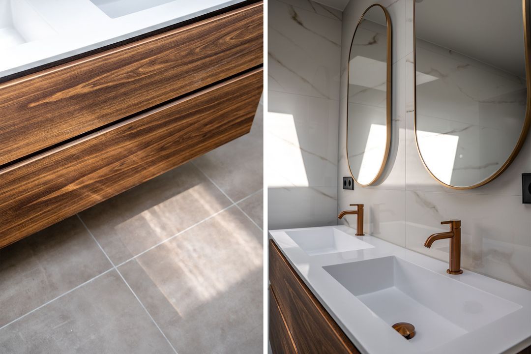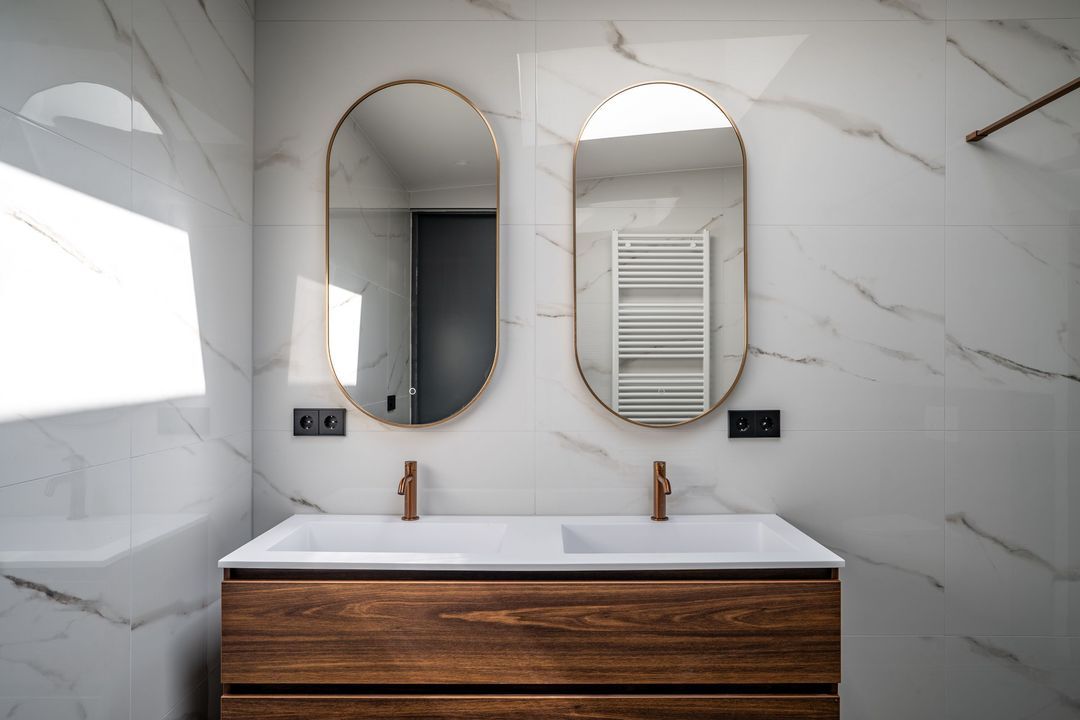 Vanuit de hal bereikt u aan de linkerzijde een royale hoofdslaapkamer met directe toegang tot de luxe badkamer. Deze is voorzien van een koperkleurige regendouche, een tweede toilet, een dubbel wastafelmeubel en een dakraam dat zorgt voor natuurlijk daglicht.