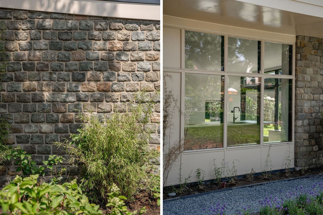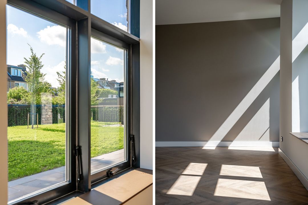 De woonkamer is toegankelijk via stijlvolle zwarte stalen deuren met donker glas, wat zorgt voor een luxe uitstraling en een prachtige lichtinval. De royale living is voorzien van grote raampartijen, een openslaande deur en directe toegang tot de zonnige achtertuin.