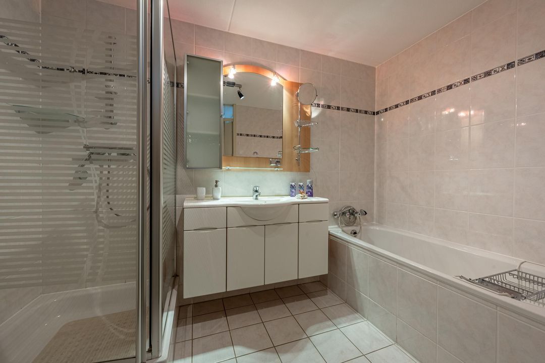 De badkamer is uitgevoerd met lichte, neutrale tegels en voorzien van vloerverwarming, heerlijk tijdens de koudere dagen. Hier vind je een bad, douche en wastafel, keurig onderhouden en met een prettige indeling. Het toilet is separaat en bevindt zich in de hal, voorzien van dezelfde witte betegeling, een hangtoilet en een fonteintje.