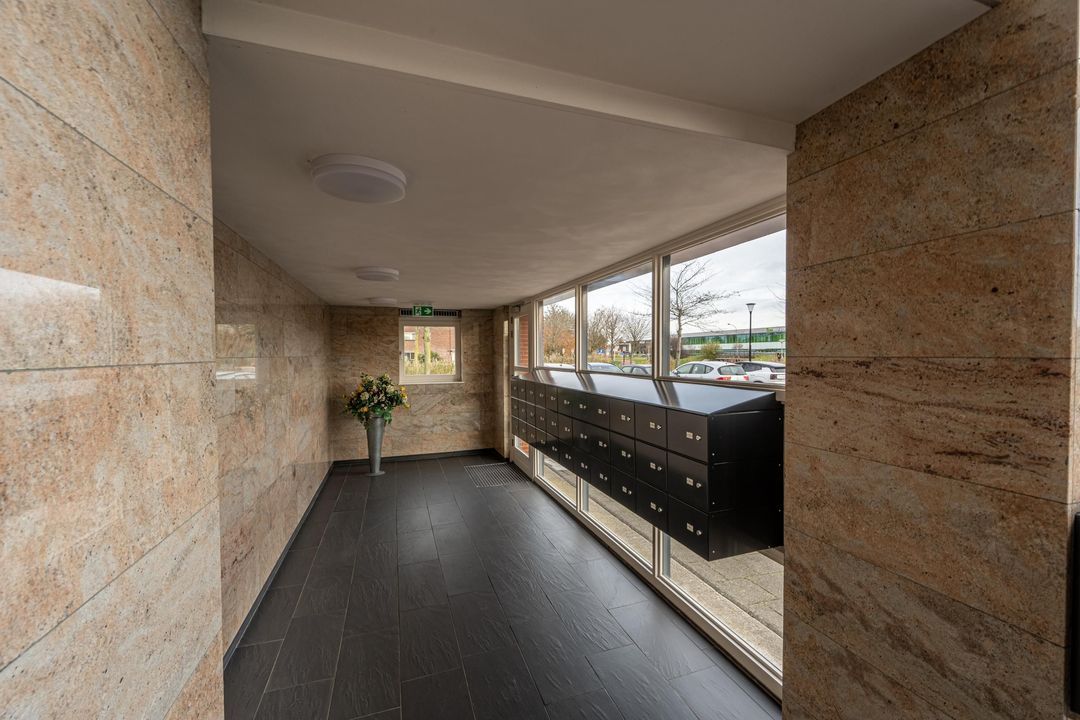 Bij binnenkomst betreed je een ruime, open entree waar zich de brievenbussen bevinden – netjes afgewerkt en uitnodigend. Vanuit hier neem je de lift naar de eerste verdieping. Op deze verdieping kom je uit op de centrale hal die toegang biedt tot meerdere appartementen. Dit appartement beschikt over twee entrees, wat zorgt voor extra gemak en mogelijkheden in de indeling.