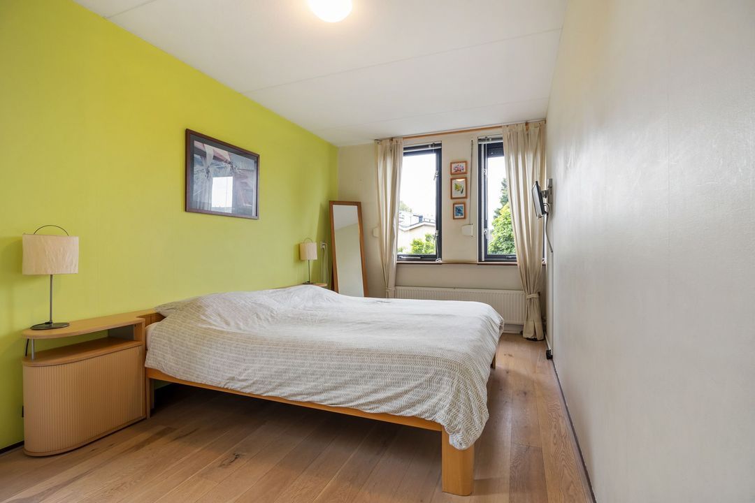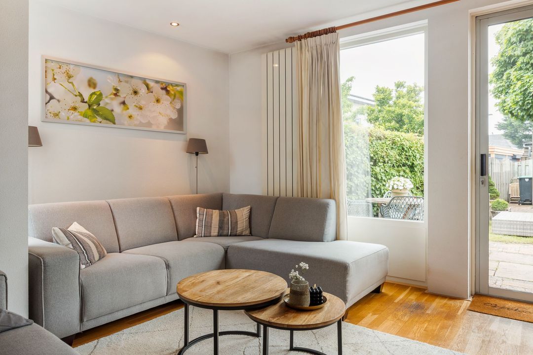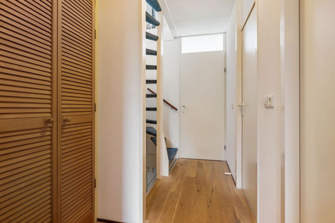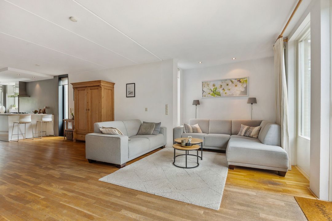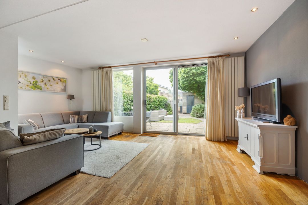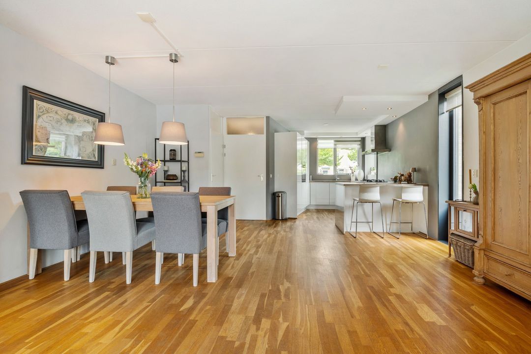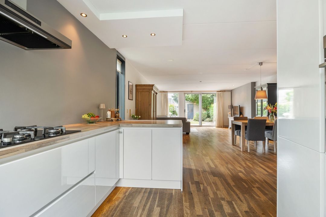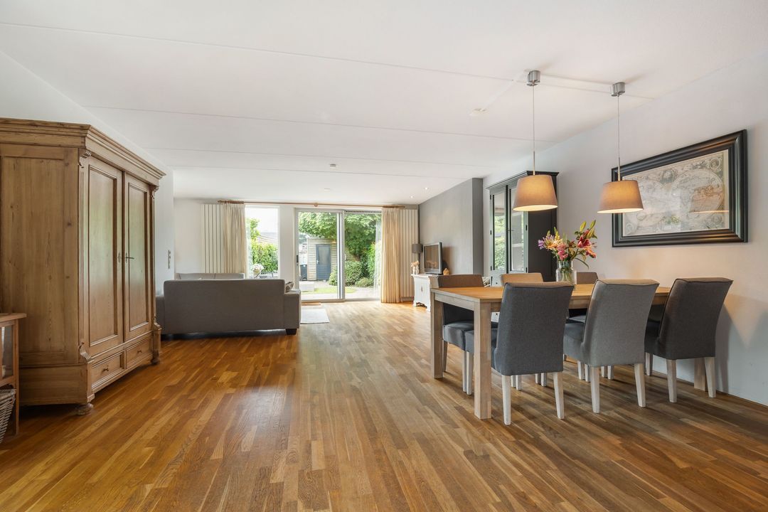 De uitgebouwde woonkamer is echt het hart van het huis. Dankzij de grote raampartijen en de schuifpui naar de tuin voelt het hier heerlijk licht en ruim. Er is meer dan genoeg plek voor een grote eettafel en een gezellige zithoek. De massief eikenhouten vloer zorgt voor een warme uitstraling. Extra handig is de trapkast: perfect voor schoonmaakspullen of een voorraad.
