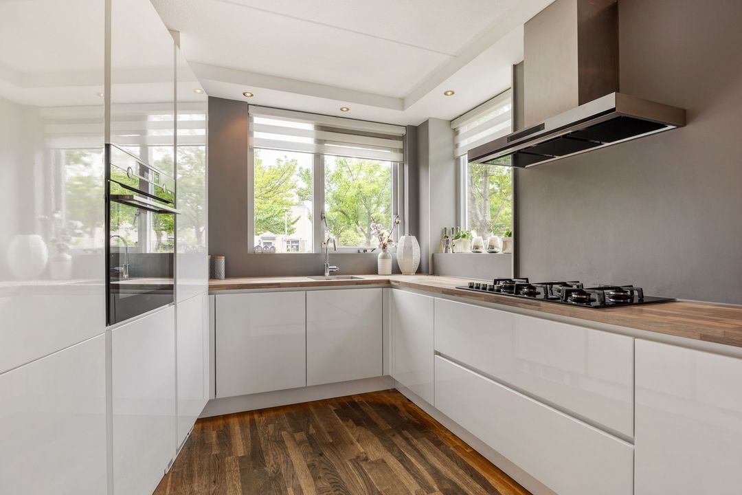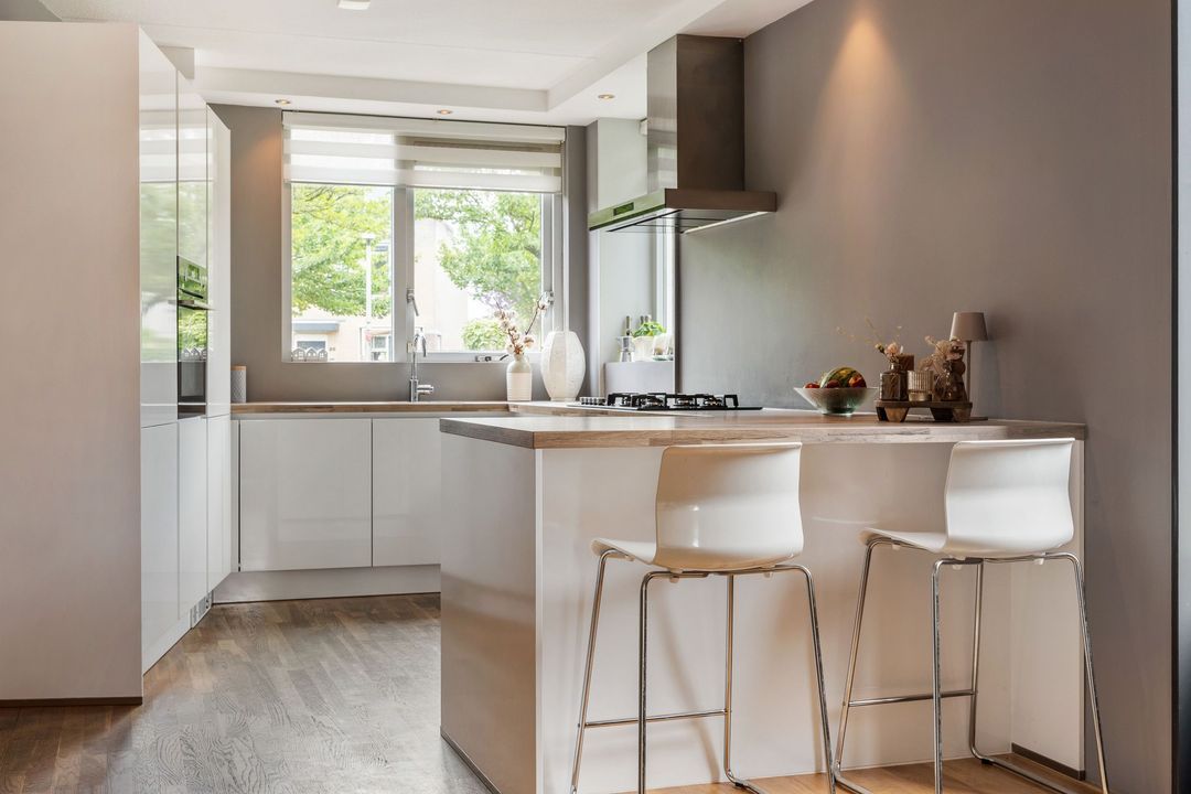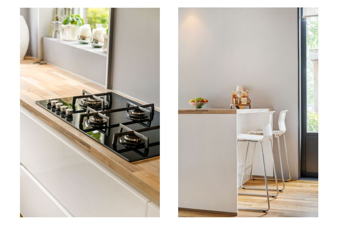 Aan de voorzijde van de woning vind je de keuken (vernieuwd in 2020), compleet met een 4-pits gaskookplaat én aparte wokbrander, afzuigkap, heteluchtoven, koel-vriescombinatie, vaatwasser en een gezellige bar met twee barkrukken. Alles wat je nodig hebt, binnen handbereik.