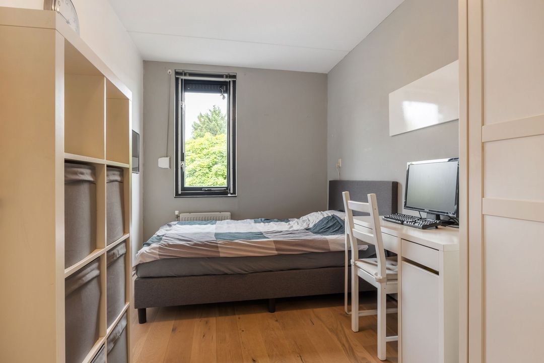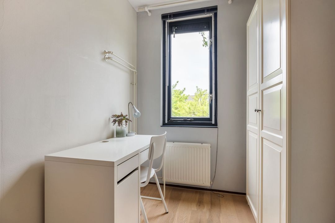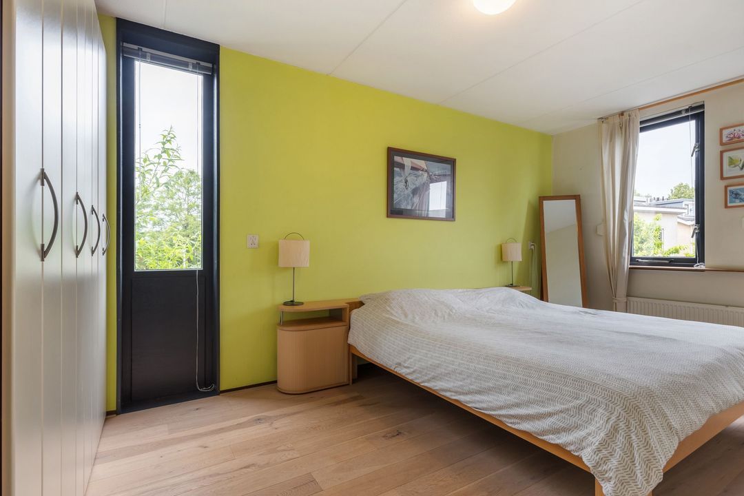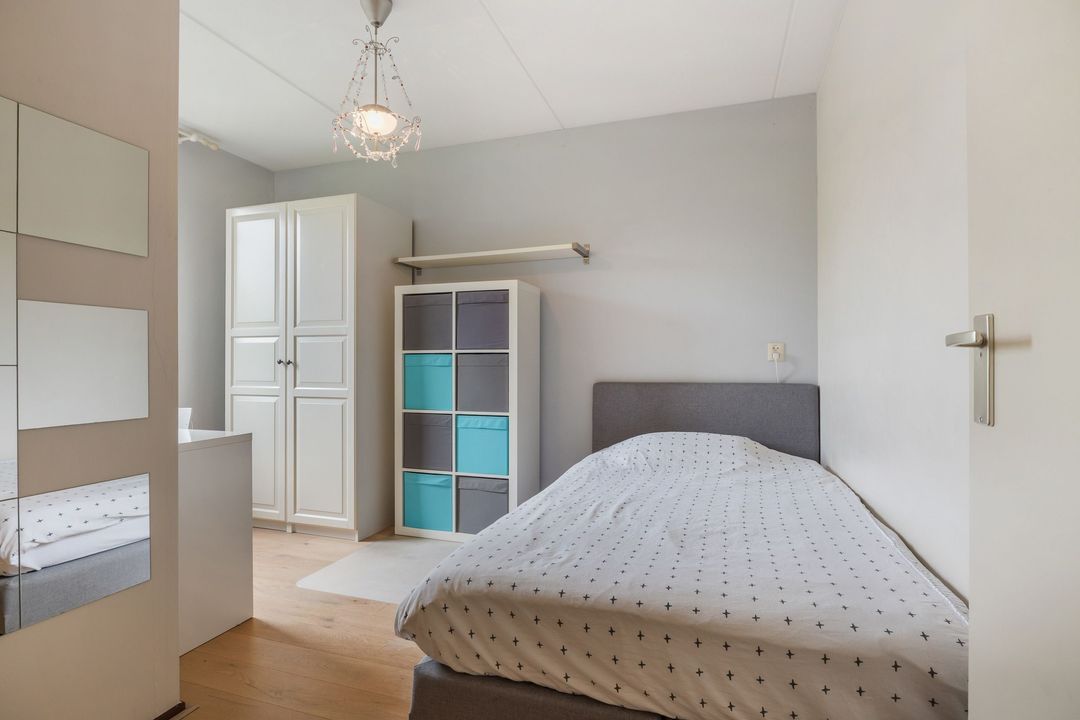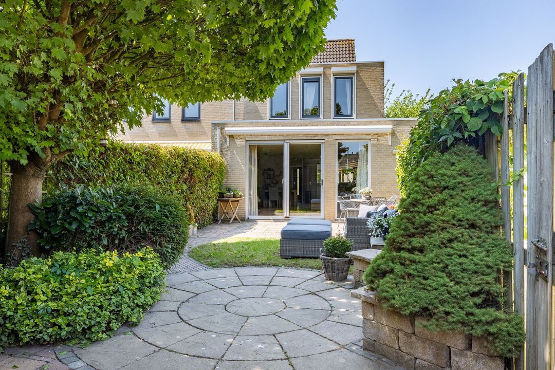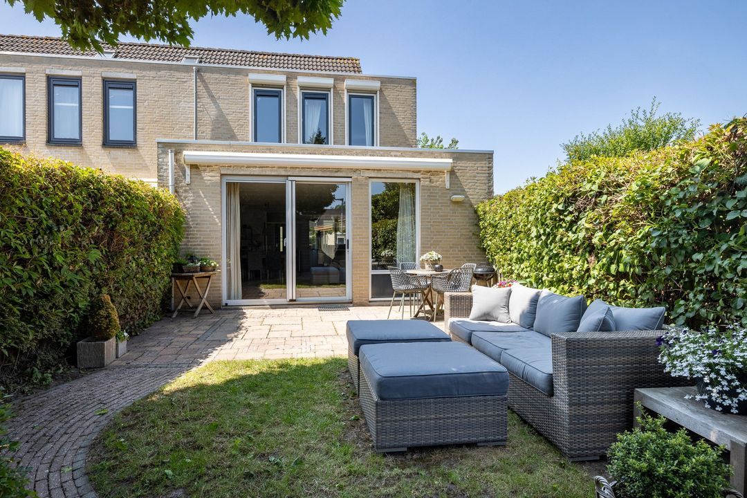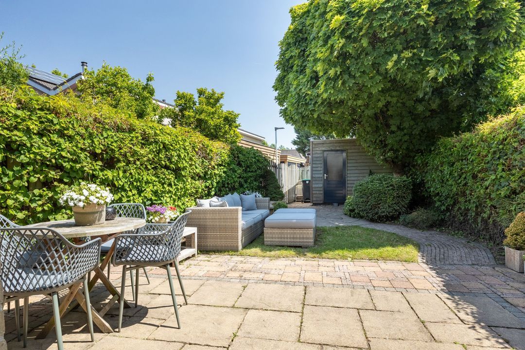 In de achtertuin geniet je volop van rust en privacy. De tuin is netjes aangelegd met gazon, terrastegels en volwassen beplanting. Er is ruimte genoeg voor een grote eettafel én een speeltoestel. Met het elektrisch zonnescherm creëer je makkelijk wat schaduw op warme dagen. De houten berging biedt plek voor fietsen, tuingereedschap en meer. Via de handige zijgang bereik je eenvoudig de tuin.
