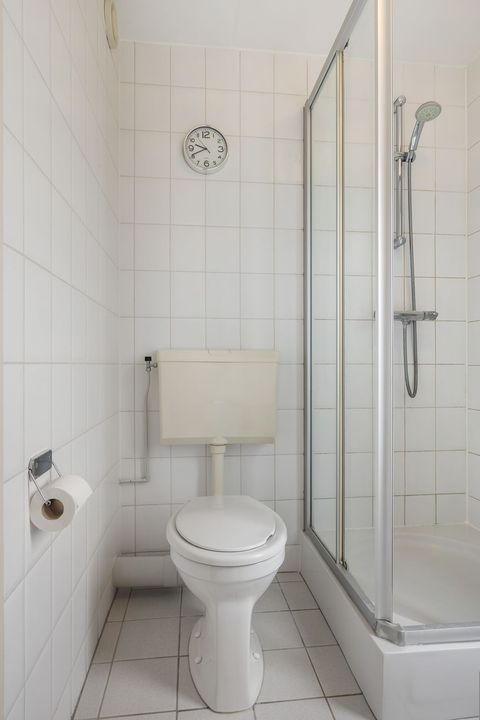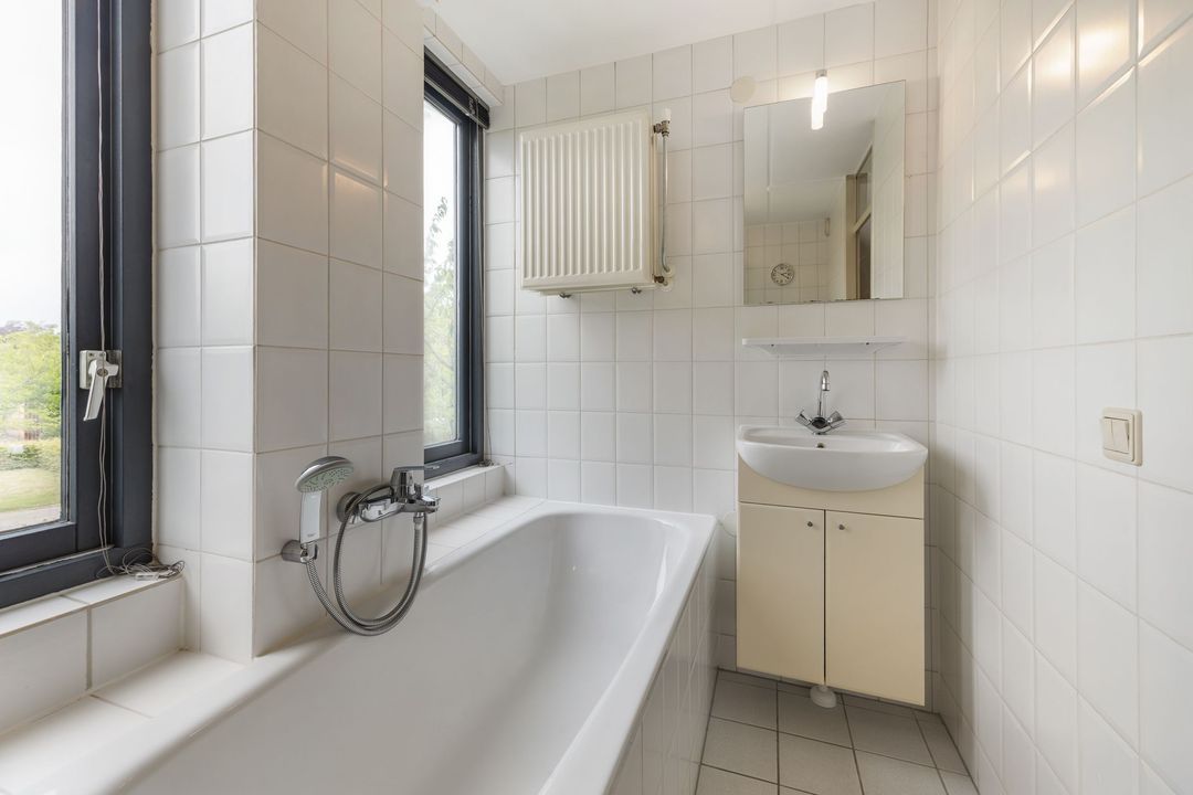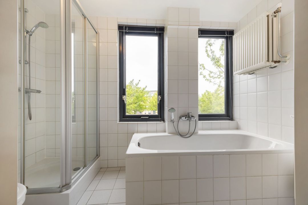 De badkamer is fris en functioneel, met witte wand- en vloertegels, een ligbad, aparte douchecabine, toilet, wastafel en een radiator.