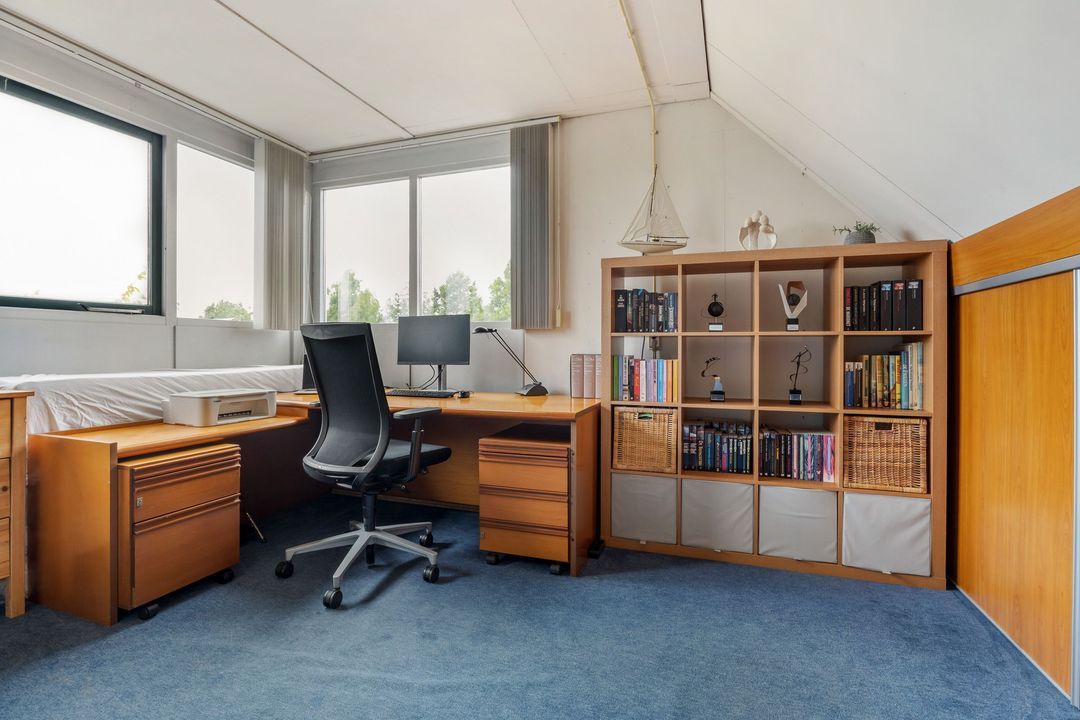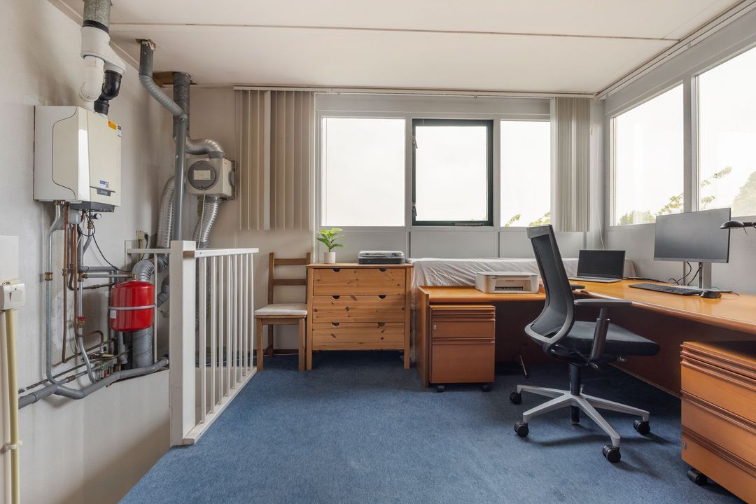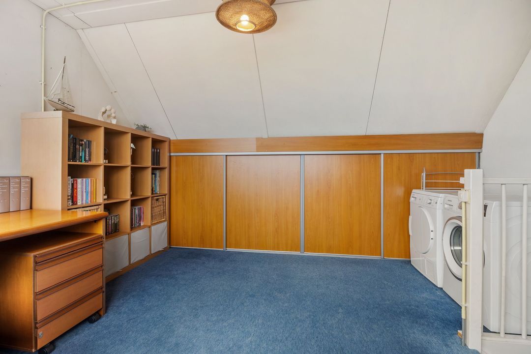De zolder is nu een open ruimte, maar hier kun je heel eenvoudig een vierde slaapkamer realiseren. Dankzij de grote raampartij is het er aangenaam licht. Achter de knieschotten heb je extra bergruimte. Ook vind je hier de aansluitingen voor de wasmachine en droger, de cv-ketel én de mechanische ventilatiebox.