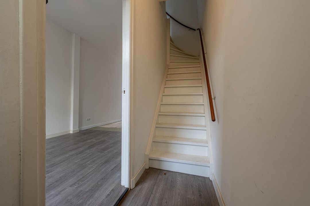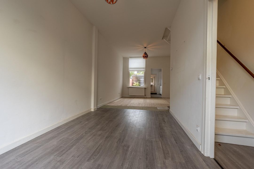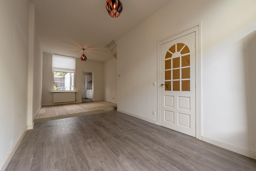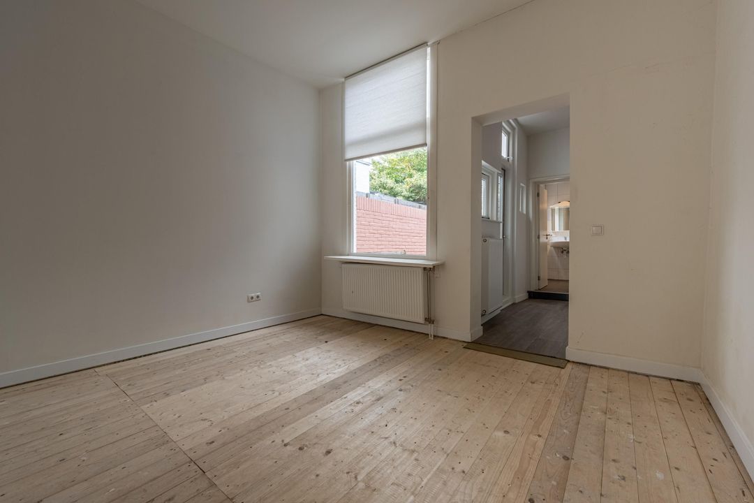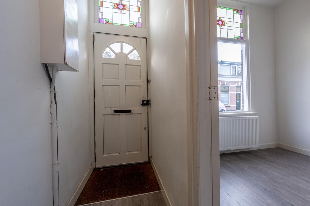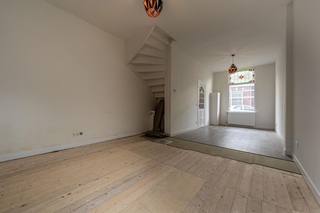 Via de voordeur kom je in de hal met trapopgang naar boven. Vervolgens stap je de woonkamer binnen: een lichte ruimte met hoge plafonds (ca. 3,04 m) en een karakteristiek glas-in-lood raam aan de voorzijde. De kamer biedt plek voor zowel een gezellige zithoek als een werk- of leeshoek. Hier proef je direct de sfeer van een authentiek stadswoning, met volop mogelijkheden om het helemaal naar eigen smaak af te werken.