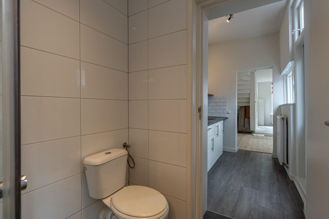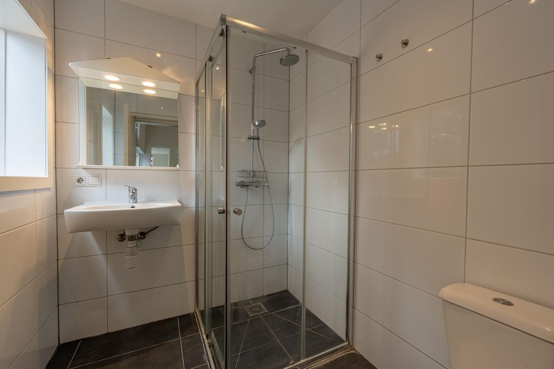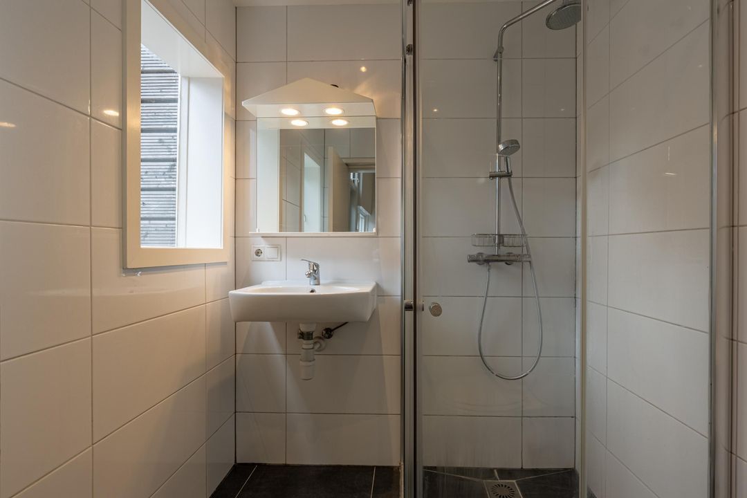 Achter de keuken bevindt zich de moderne badkamer (2018). Deze is volledig betegeld en uitgerust met een douchecabine, wastafel met spiegel en toilet.