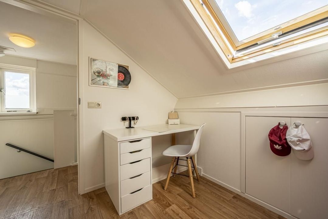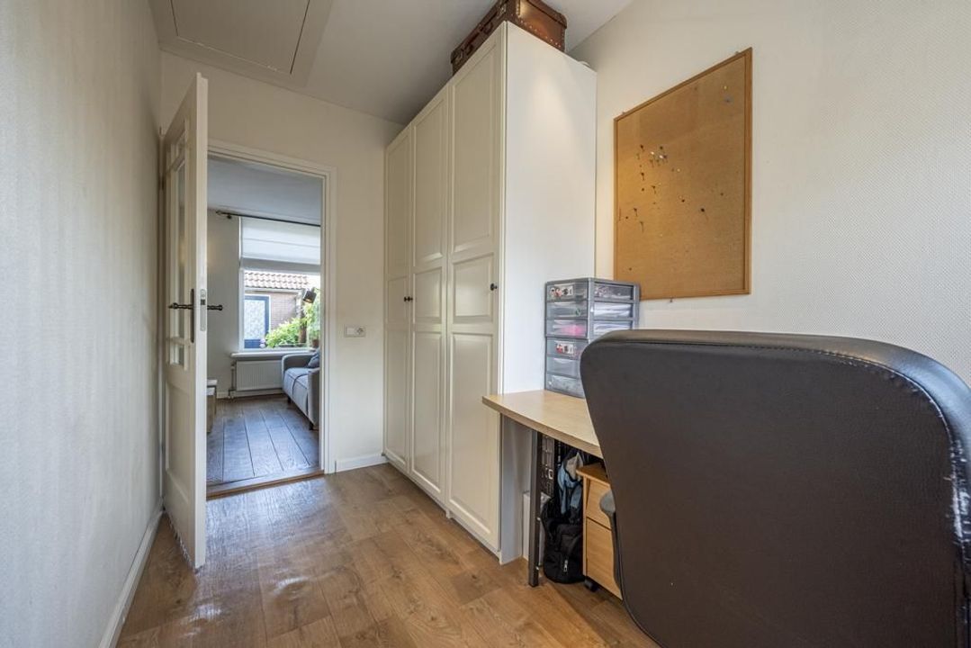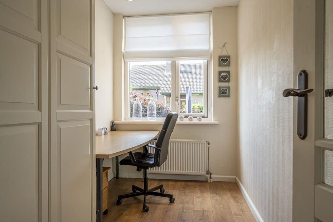 In de zijaanbouw is een kantoorruimte die ook prima gebruikt kan worden als speel- en of hobbyruimte. Boven de zijuitbouw bevindt zich een ruime vliering die ideaal is voor bijvoorbeeld opslag van koffers en tuinspullen. Deze vliering is te bereiken door middel van een vlizotrap in het kantoor. Aan de voorzijde is de L-vormige keuken gelegen.