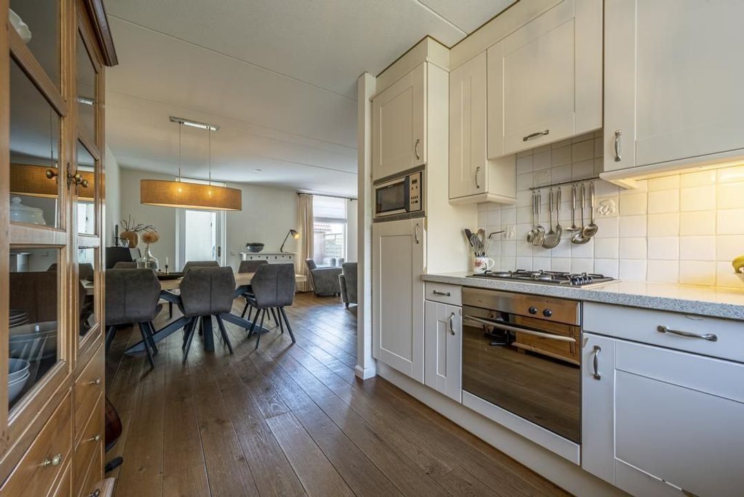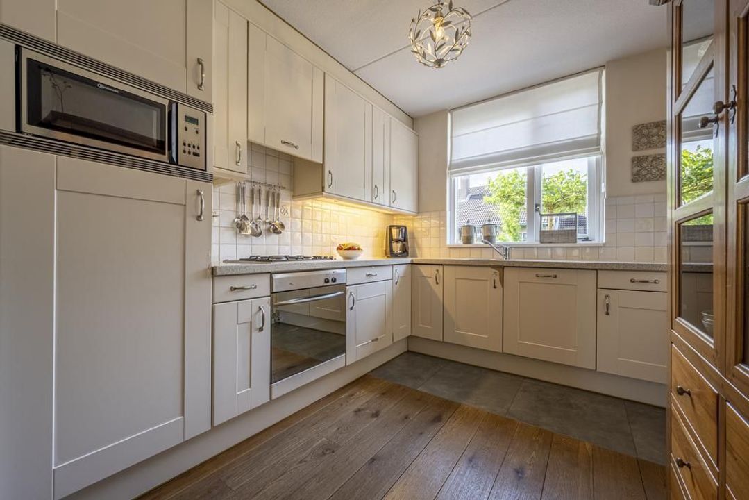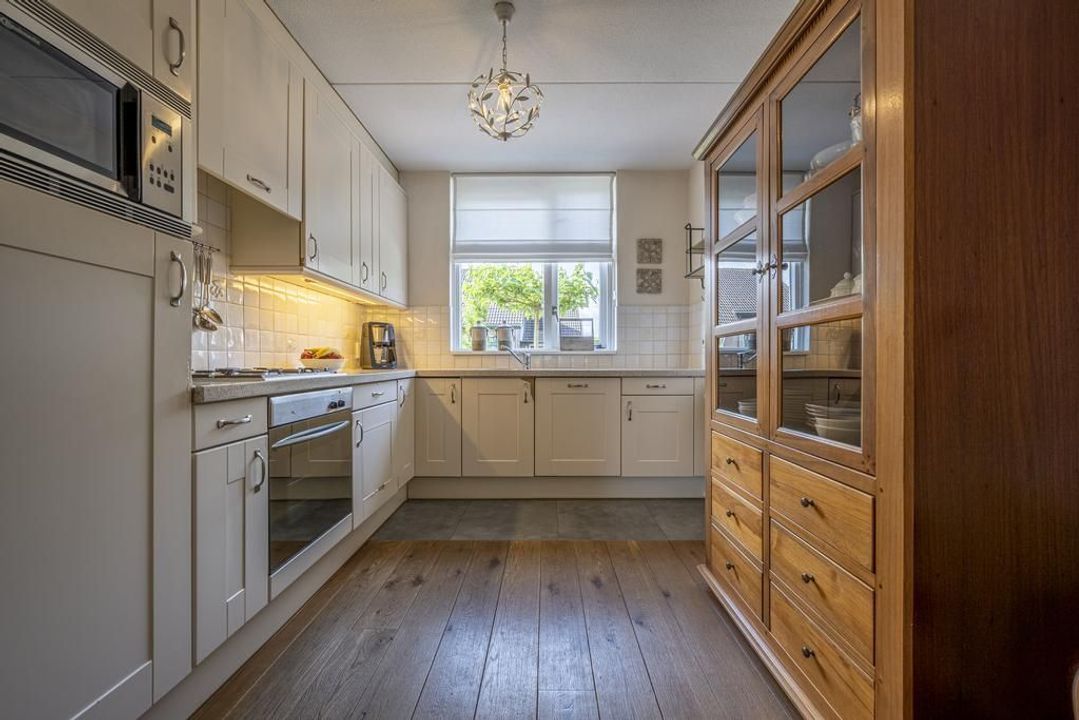De keuken is ingericht met een 4-pitsgasfornuis met afzuigkap, oven, magnetron, koelkast en een vaatwasser. De bijkeuken is vanuit de woonkamer te bereiken. In deze praktische ruimte is een inbouwkast met schuifdeuren waarachter ook plaats is voor de wasmachine en droger.