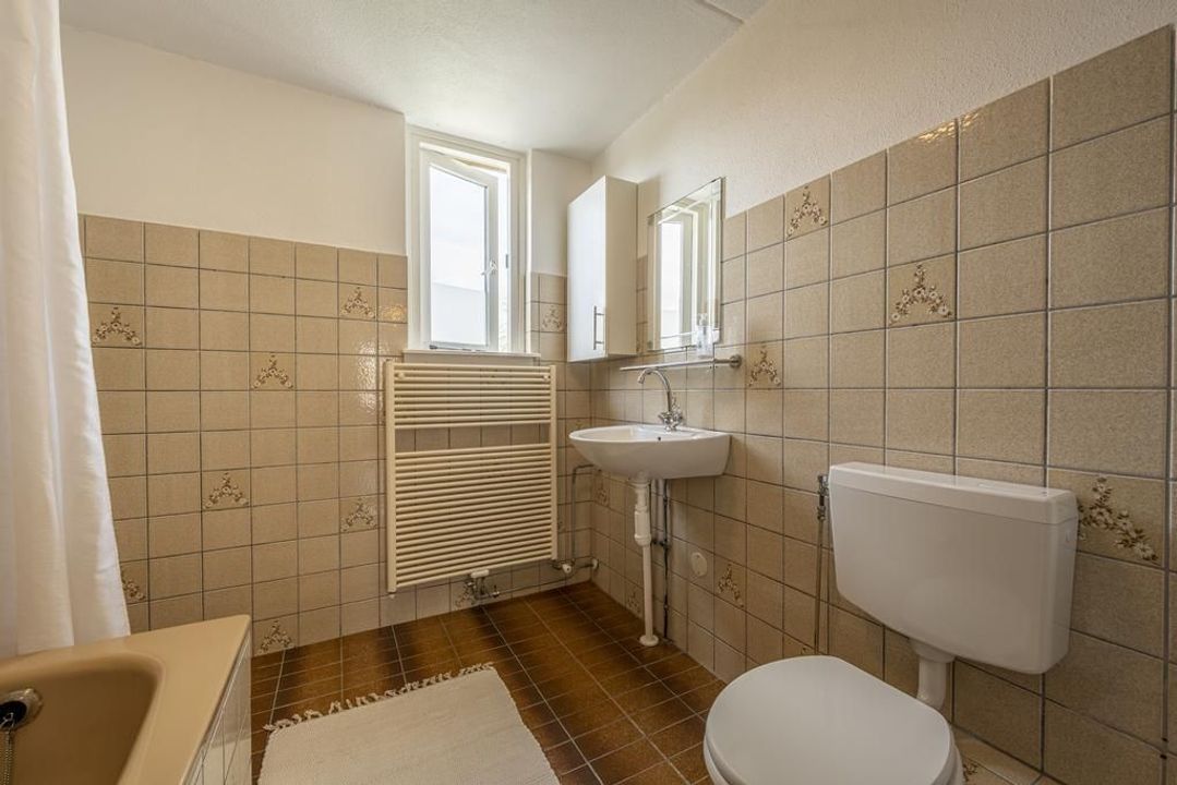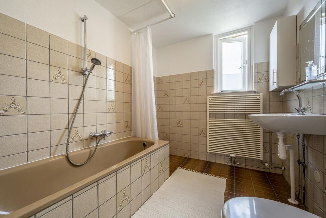 De ruime badkamer is ingericht met een ligbad, wastafel, toilet en een radiator. De badkamer is voorzien van zowel wand- als vloertegels.