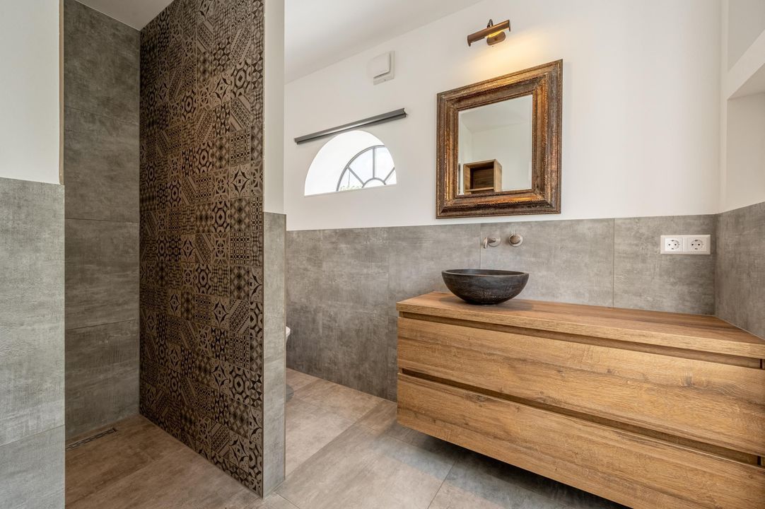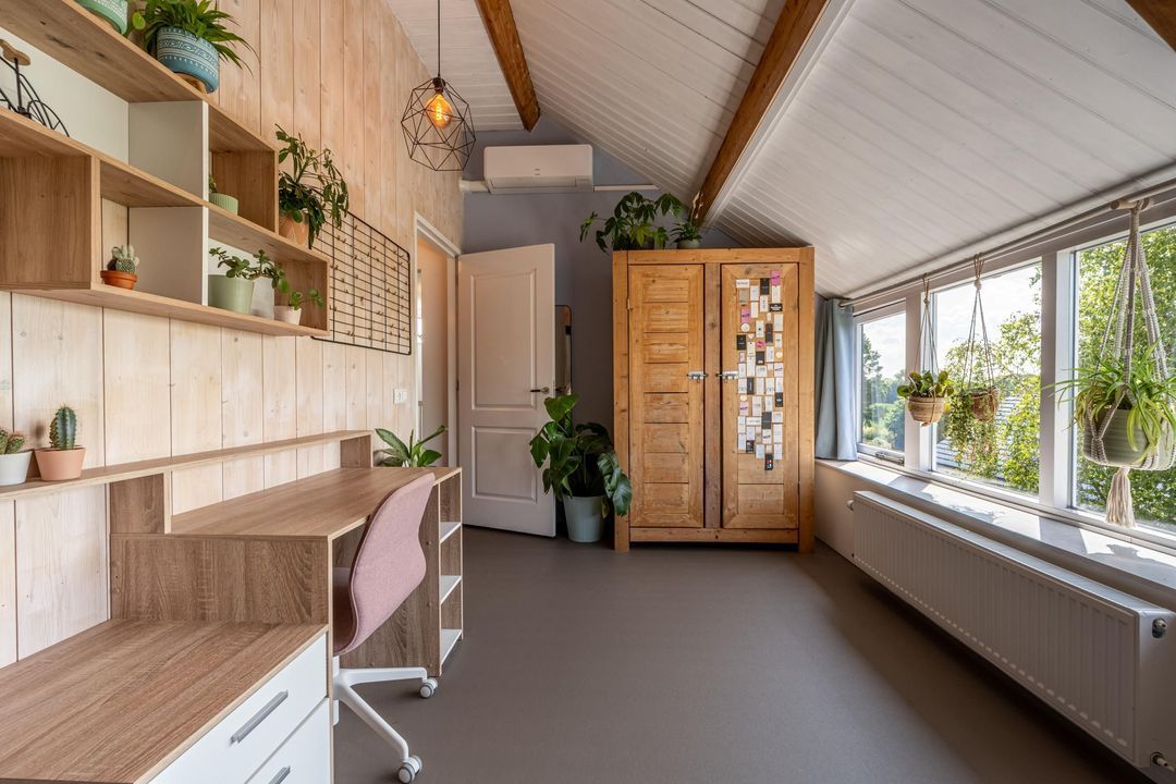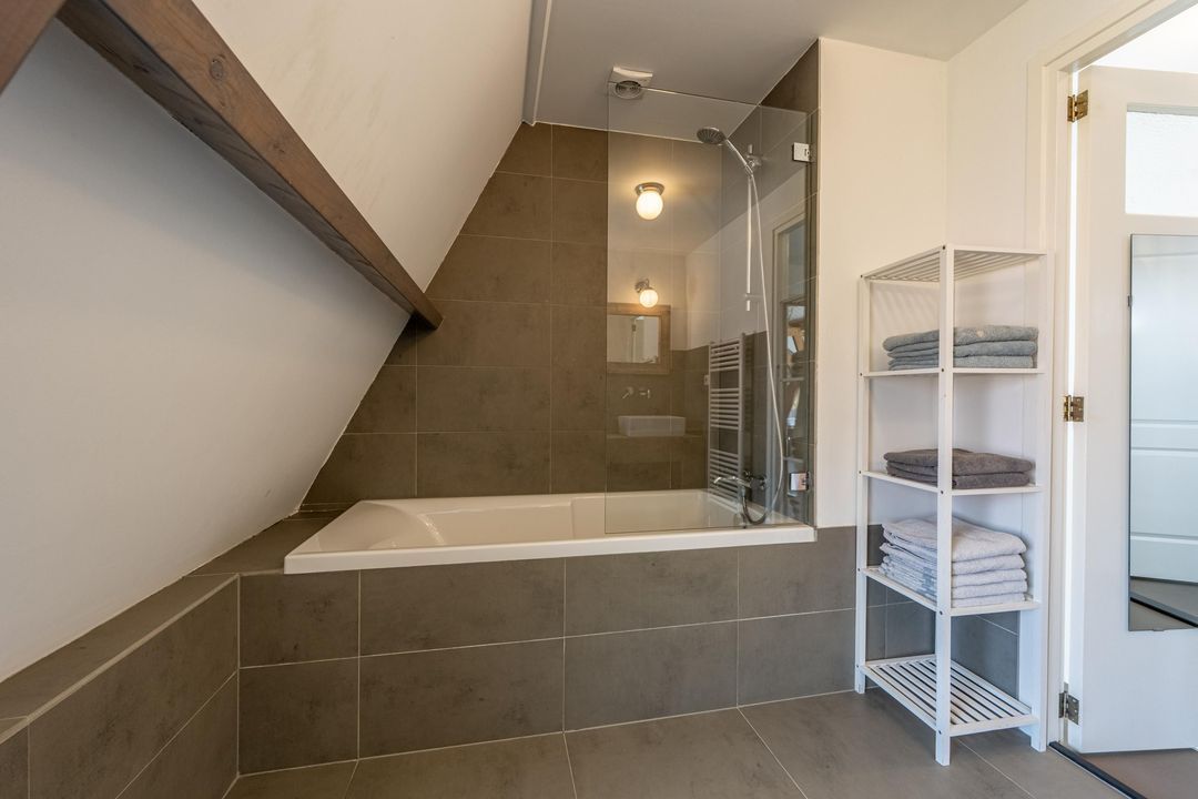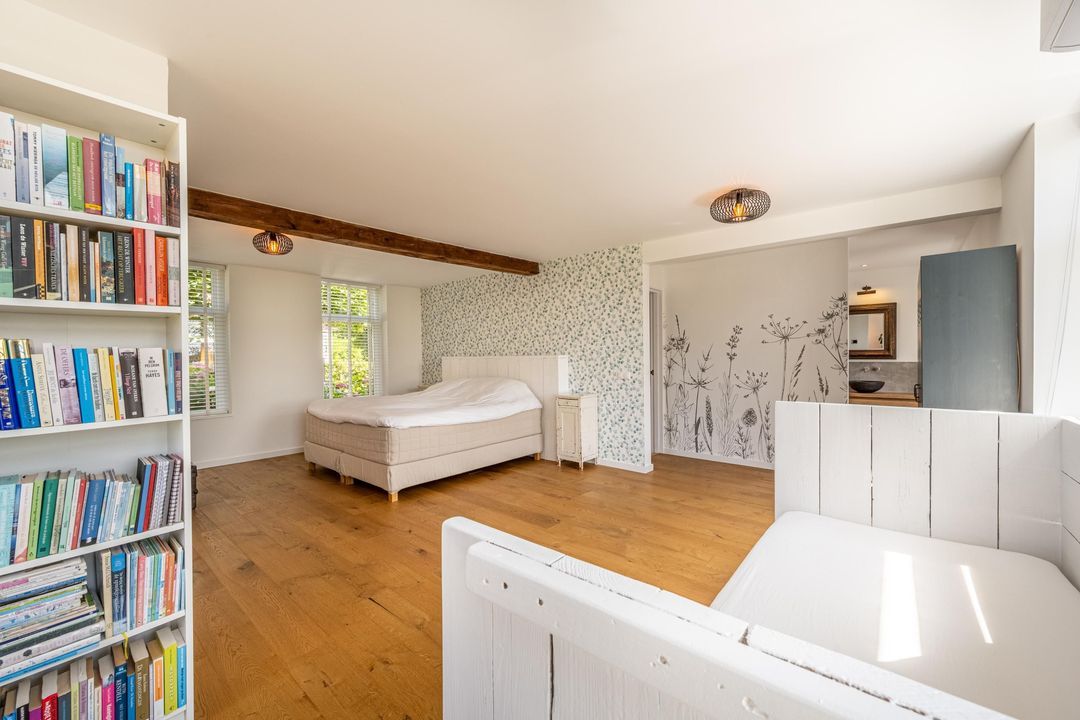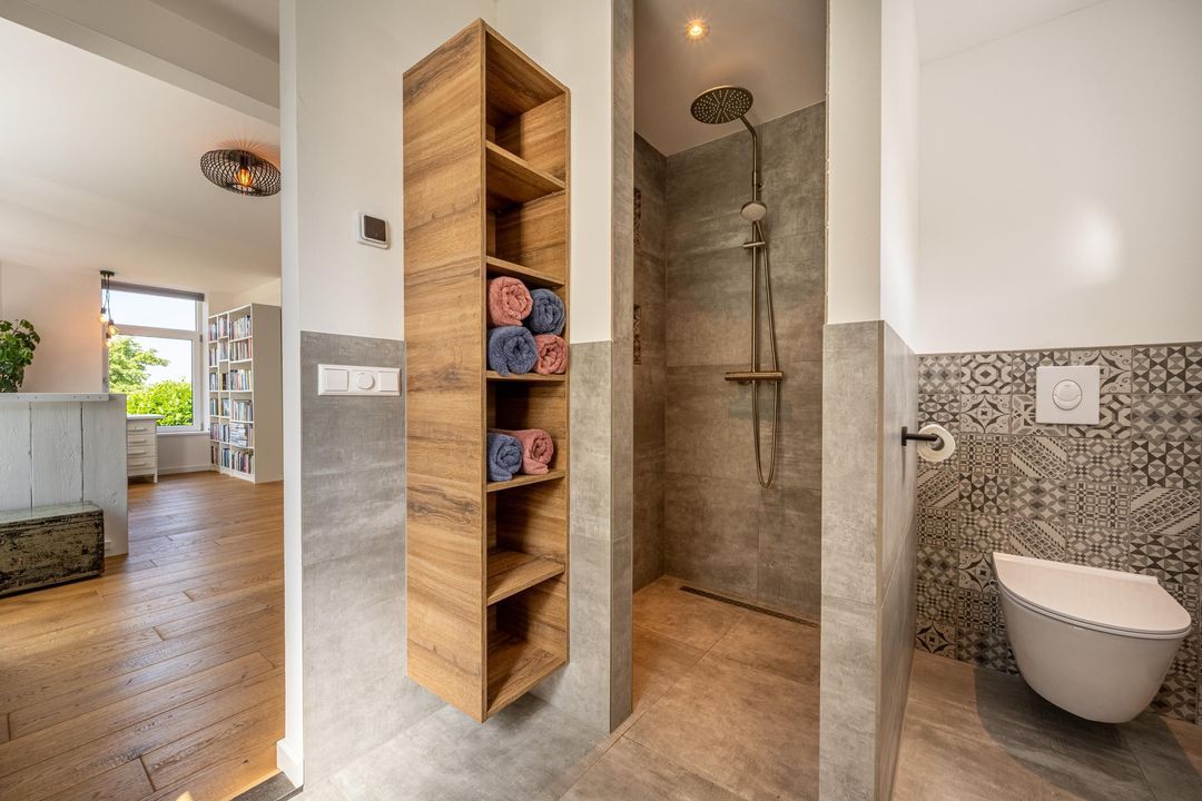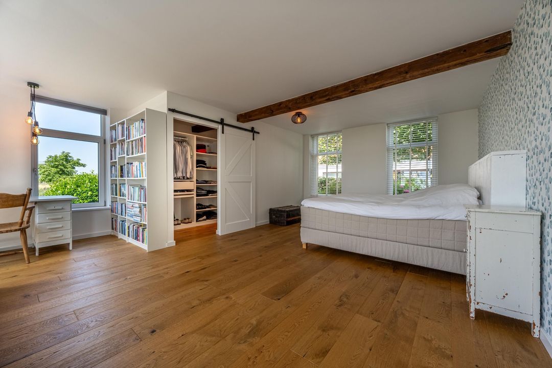 Op dijkniveau ligt de entree met vernieuwde meterkast met krachtstroom en glasvezel. Hier bevindt zich ook extra bergruimte. De riante ouderslaapkamer met eigen zithoek c.q. werkruimte is een bijzonder comfortabele ruimte met glad stucwerk, eiken vloerdelen, inloopkast, airconditioning en directe toegang tot het grote dakterras. Een heerlijke plek om je even terug te trekken. De en-suite badkamer is modern uitgevoerd met inloopdouche, toilet, mooi wastafelmeubel en elektrische vloerverwarming.