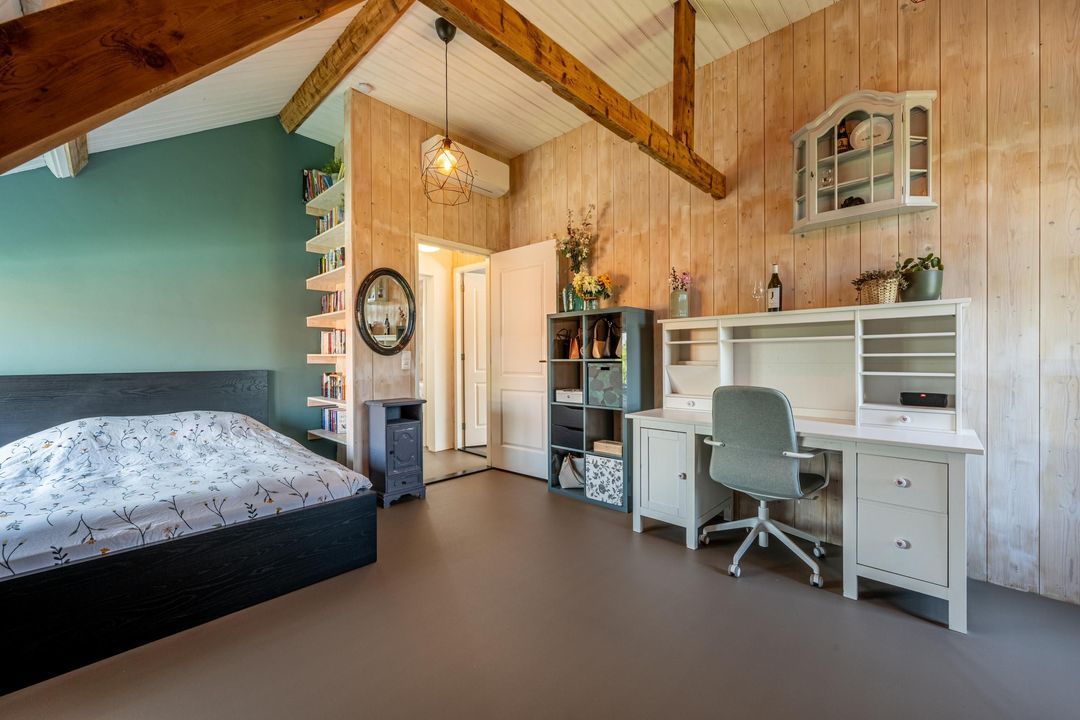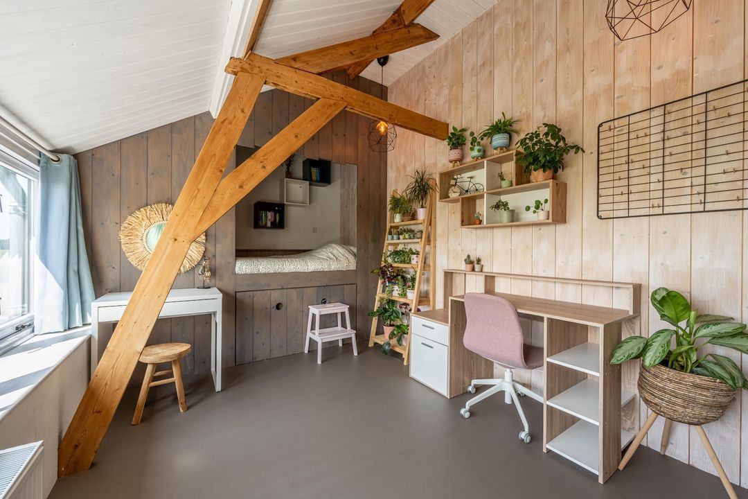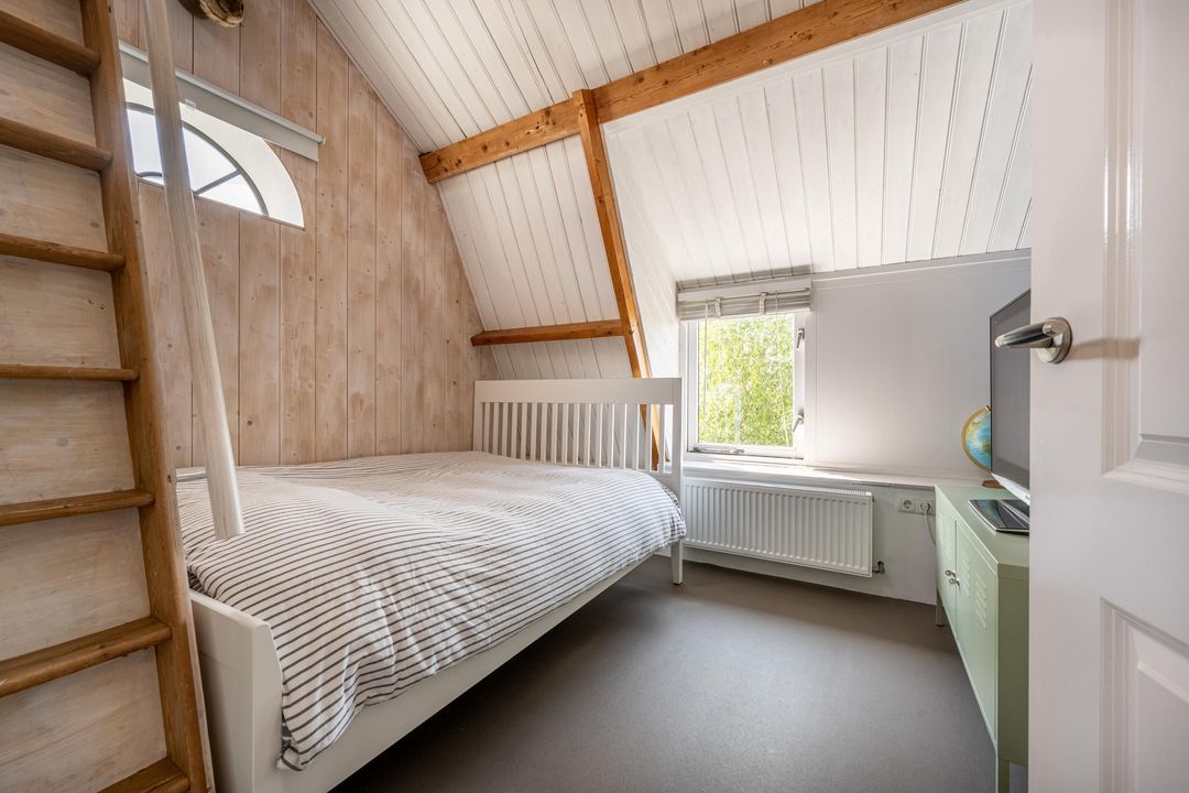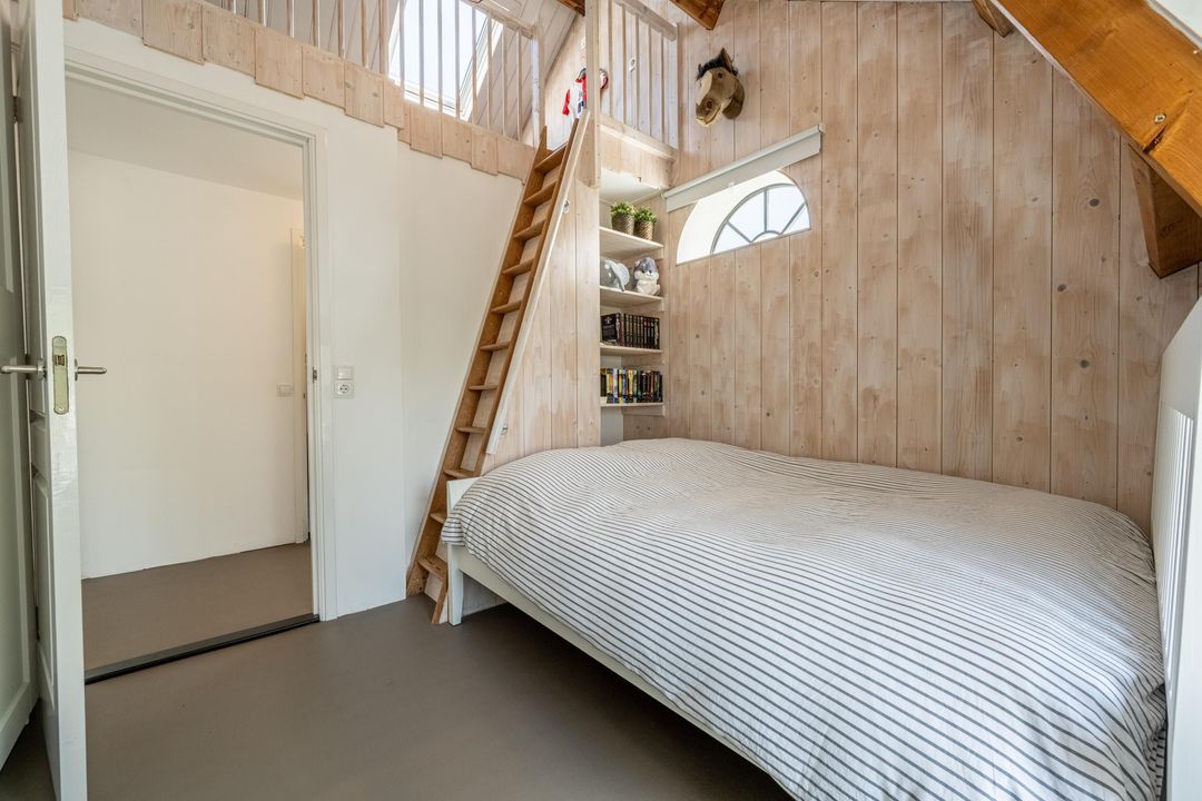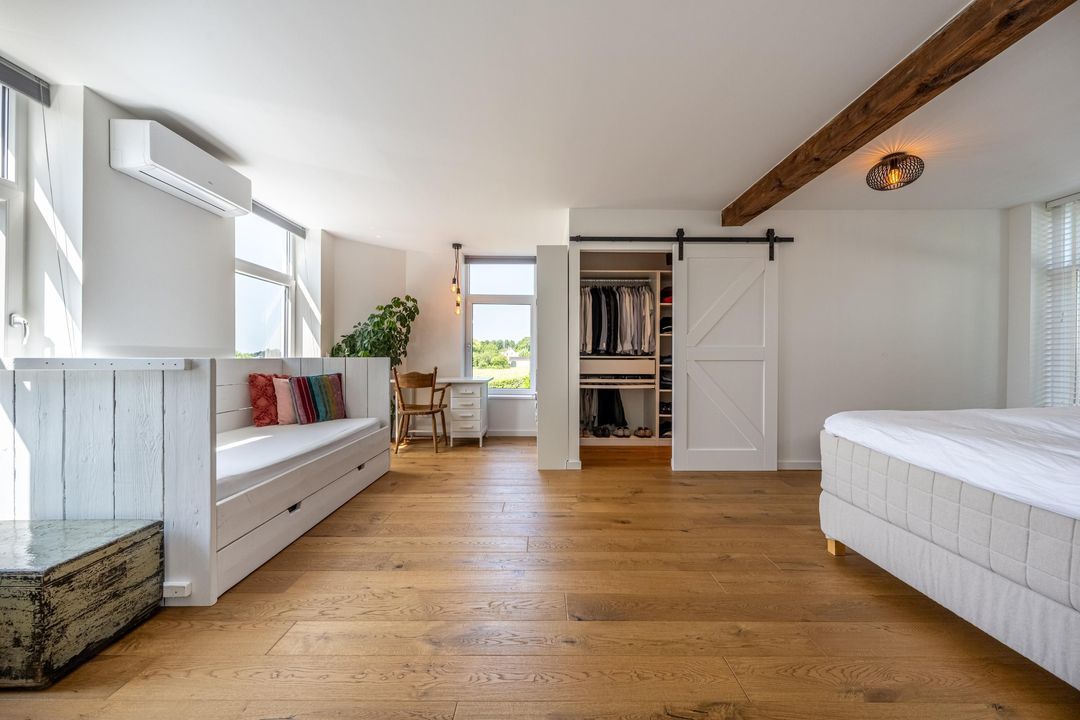 Op de eerste verdieping liggen drie leuke en sfeervolle slaapkamers. De houten spantconstructie is in alle kamers zichtbaar en de ruimtes zijn fraai afgewerkt met kraalschroten, paneeldeuren, houtaccenten en weer een karakteristiek stalraam. Elke kamer heeft zijn eigen identiteit. Een kamer heeft een speelzolder, tevens te gebruiken als hoogslaper, een andere een bedstee en de derde is uitzonderlijk ruim met zicht op de molen en de oude Maas. Alle kamers zijn voorzien van airconditioning. De vloeren zijn uitgevoerd in strak kunststof in een warme grijsbruine tint. De luxe badkamer op deze verdieping beschikt over een ligbad met douche, een toilet en een steigerhouten wastafelmeubel met dubbele waskom.