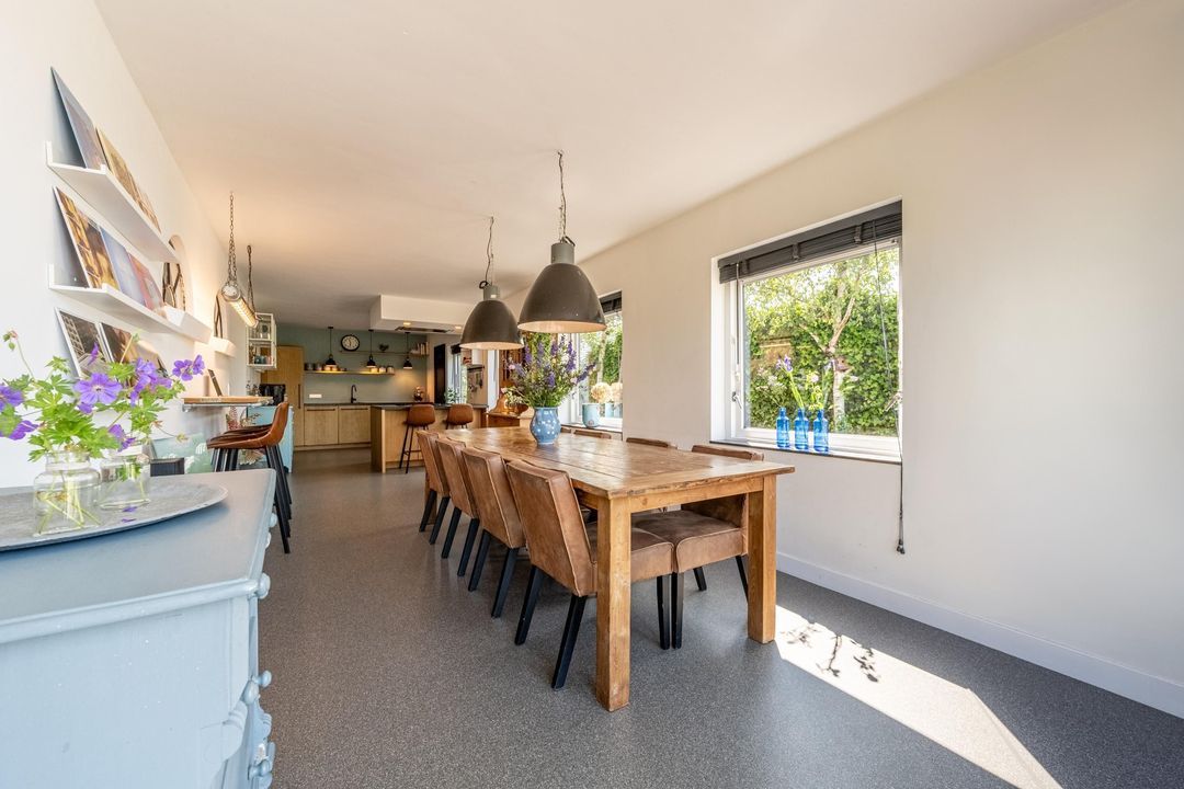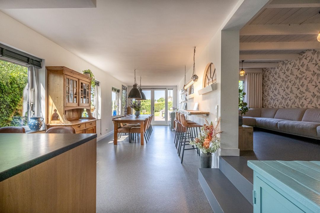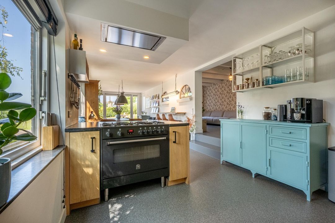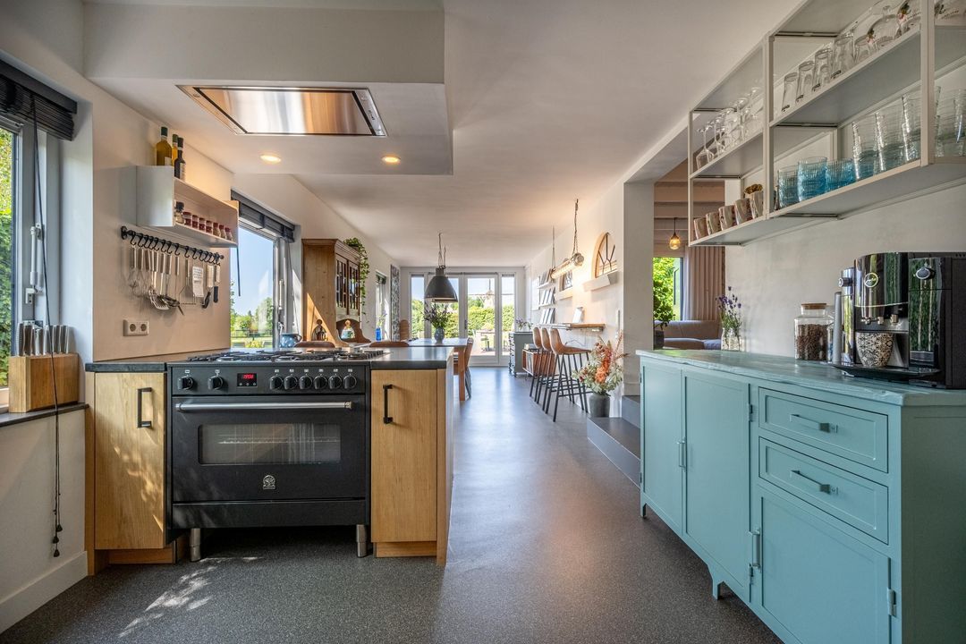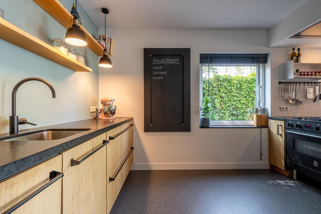 Het benedenhuis verrast door ruimte en sfeer. In de uitbouw uit 2007 bevindt zich de royale woonkeuken van VT Wonen met vloerverwarming, ruimte voor een grote eettafel, een hoge werkplek aan de wand en een sfeervolle keuken met eiken kastwerk, granieten werkblad, kookeiland met plafondafzuiging, vaatwasser en veel bergruimte. Het fornuis met oven is de enige plek in de woning waar nog gas wordt gebruikt. Met twee treden omhoog kom je in de knusse woonkamer met balkenplafond en de karaktervolle stalramen. Vanuit zowel de woonkeuken als woonkamer stap je zo de uitgestrekte tuin in. Op deze verdieping vind je verder een toilet, praktische bergruimte, de ruime opstelplaats voor wasmachine en droger en nog een aparte werkhoek.