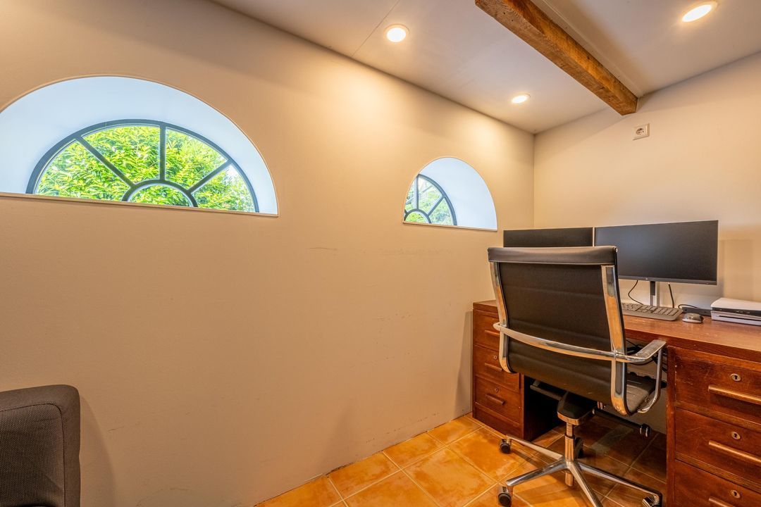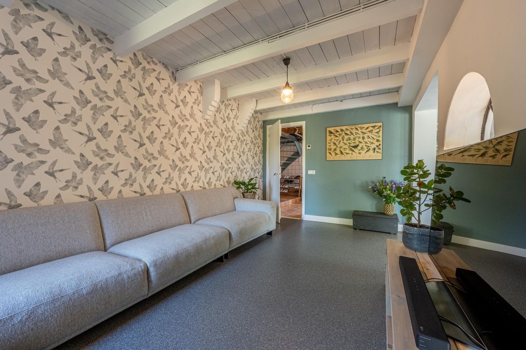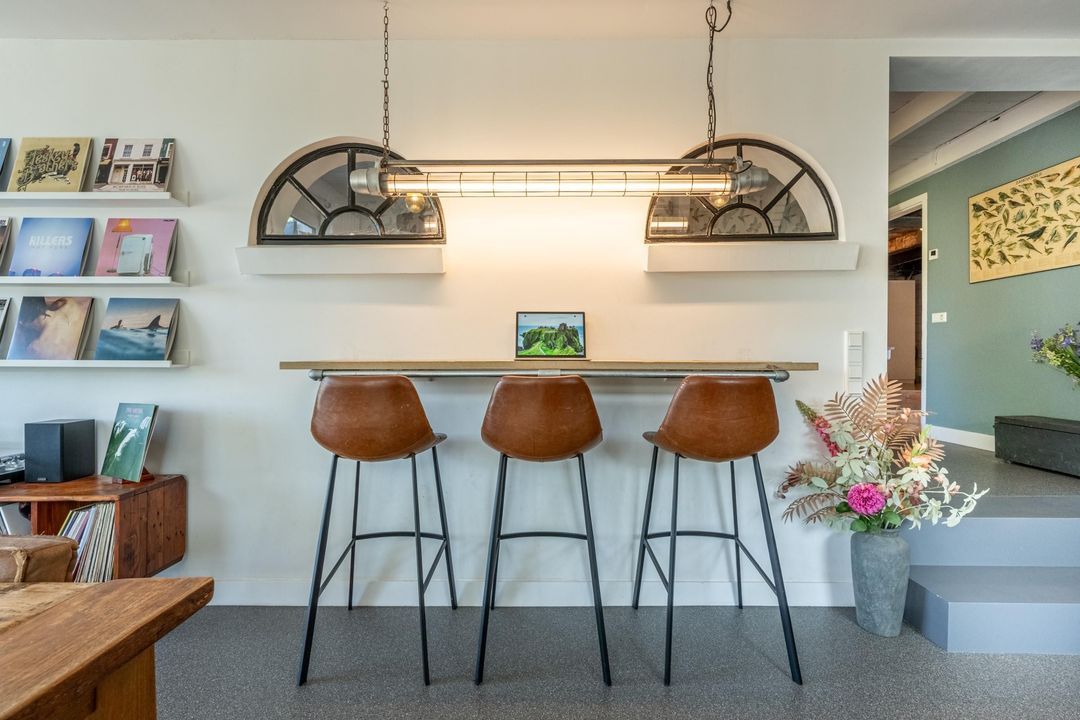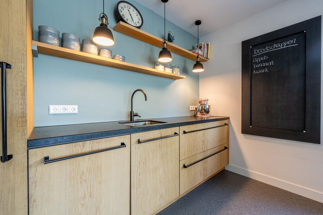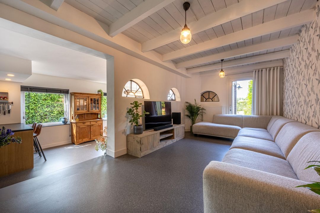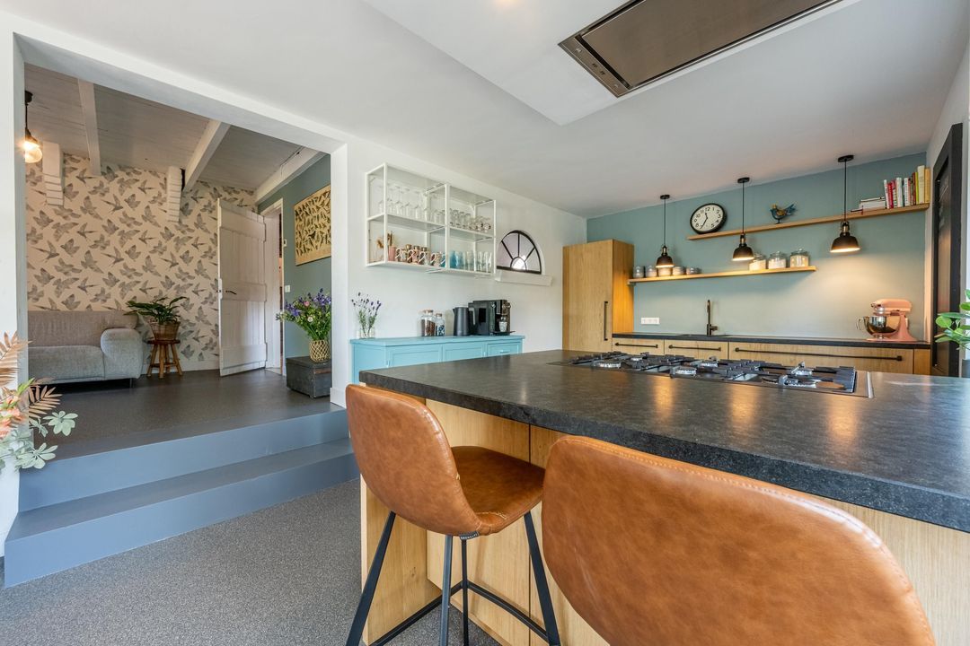 Het benedenhuis verrast door ruimte en sfeer. In de uitbouw uit 2007 bevindt zich de royale woonkeuken van VT Wonen met vloerverwarming, ruimte voor een grote eettafel, een hoge werkplek aan de wand en een sfeervolle keuken met eiken kastwerk, granieten werkblad, kookeiland met plafondafzuiging, vaatwasser en veel bergruimte. Het fornuis met oven is de enige plek in de woning waar nog gas wordt gebruikt. Met twee treden omhoog kom je in de knusse woonkamer met balkenplafond en de karaktervolle stalramen. Vanuit zowel de woonkeuken als woonkamer stap je zo de uitgestrekte tuin in. Op deze verdieping vind je verder een toilet, praktische bergruimte, de ruime opstelplaats voor wasmachine en droger en nog een aparte werkhoek.