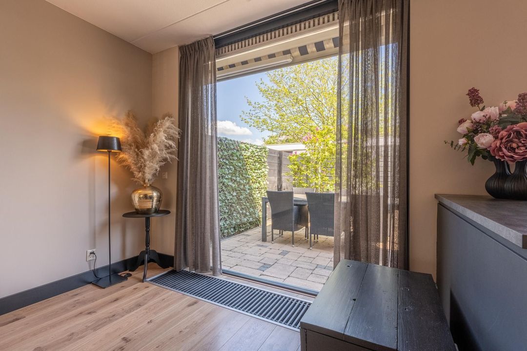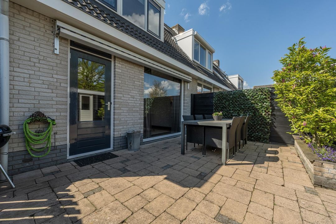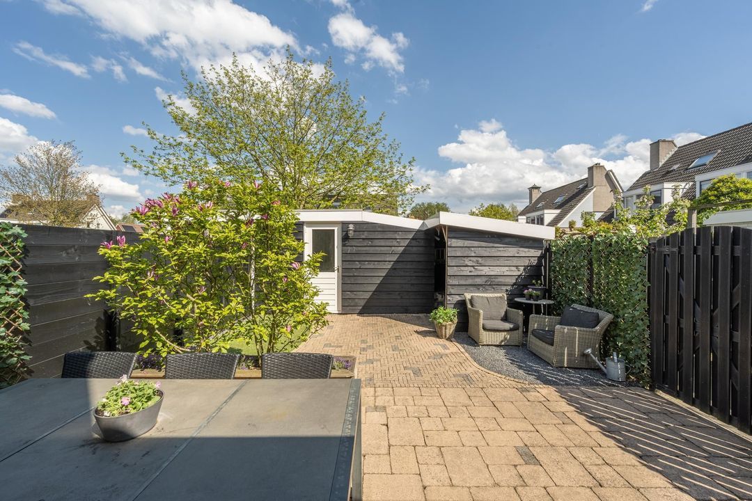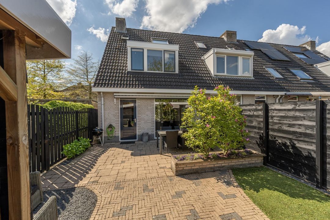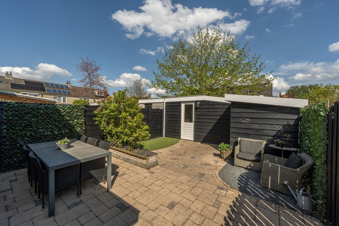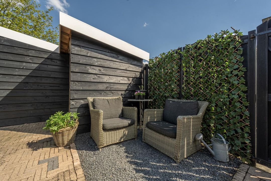 De onderhoudsarme achtertuin is voorzien van een strook kunstgras en beplante borders. Het terras nodigt uit om te ontspannen met vrienden en familie tijdens de warme zomerdagen. Het zonnescherm biedt een plekje in de schaduw en houdt de woning koel. De tuin is tevens uitgerust met een handige achterom en een gepotdekselde stenen berging met extra overkapping, perfect voor het opbergen van tuinkussens en fietsen, de BBQ en andere (tuin) spullen).
