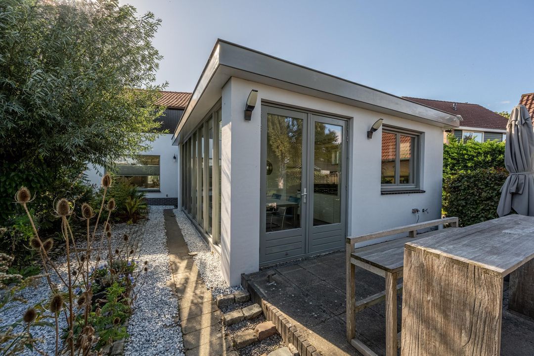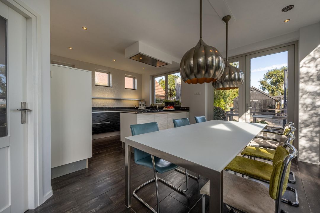 Aan de achterzijde van de woning is in 2010 een aanbouw gerealiseerd, waardoor er aanzienlijk meer leefruimte is ontstaan. Hier bevindt zich het toilet, een praktische bergkast met de verdeler van de vloerverwarming én natuurlijk de moderne keuken. Dankzij de grote raampartijen geniet je hier van veel lichtinval en zicht op de tuin.