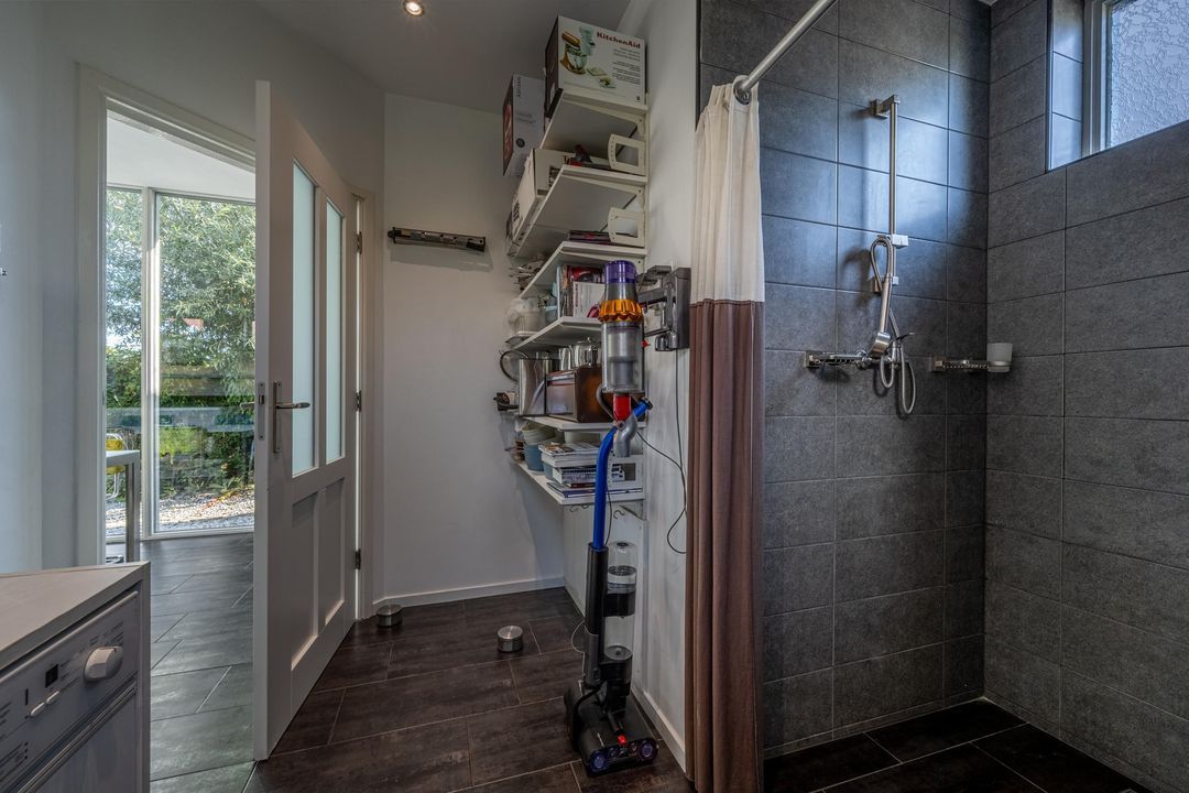 Aangrenzend aan de keuken bevindt zich de bijkeuken. Een praktische ruimte met aansluiting voor wasmachine en droger, extra bergruimte én zelfs een tweede doucheruimte met sunshower.