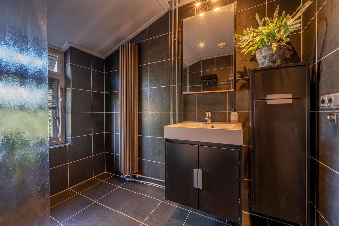 De badkamer is modern afgewerkt met zwarte vloer- en wandtegels en beschikt over een inloopdouche, toilet, wastafel en radiator. De inbouwspots in het plafond zorgen voor een strakke, rustige uitstraling.