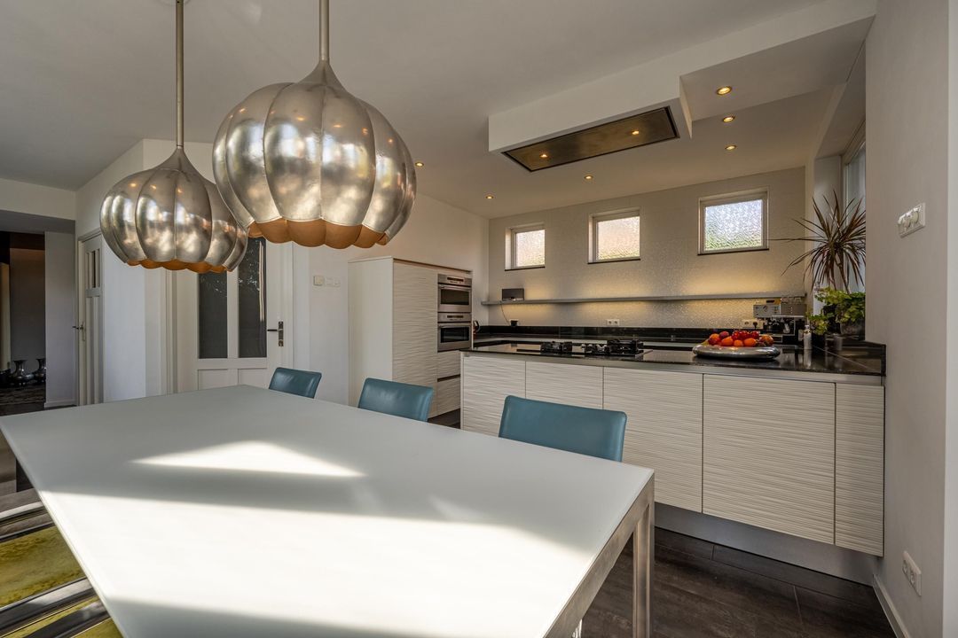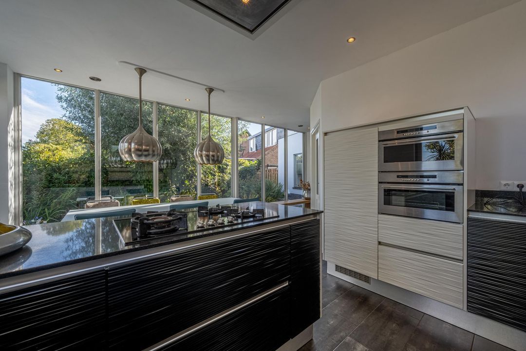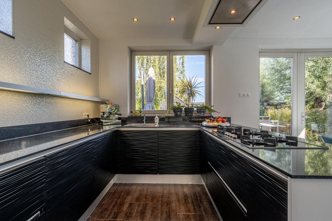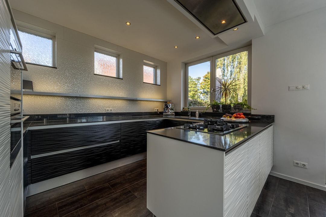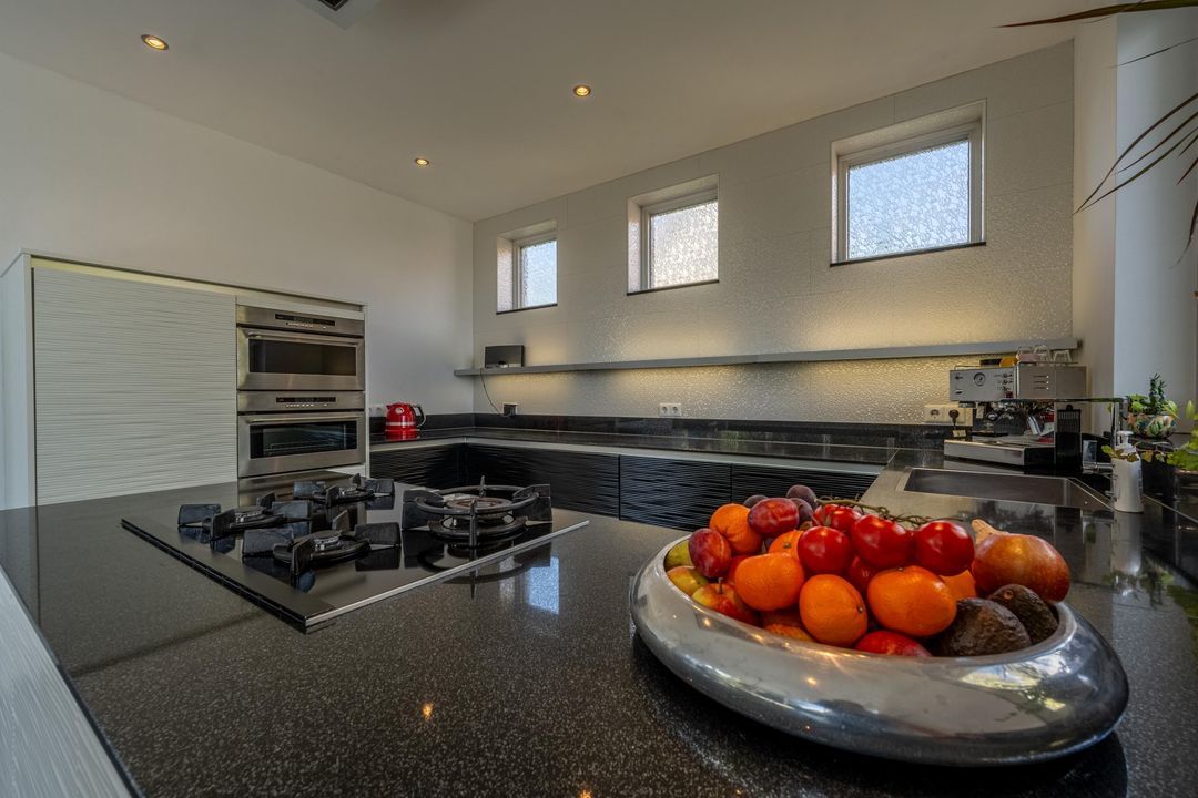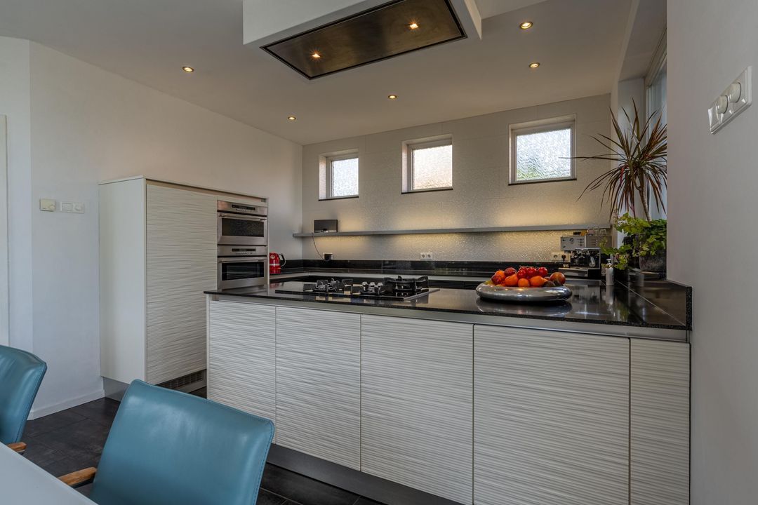 De keuken is strak en eigentijds uitgevoerd, met een zwart natuurstenen werkblad, veel kastruimte (lades en kasten) en hoogwaardige inbouwapparatuur: een fornuis met vier gaspitten, plafondafzuiging, stoomoven, oven, koelkast en vaatwasser. Ook is er een boiler aanwezig voor direct warm water.