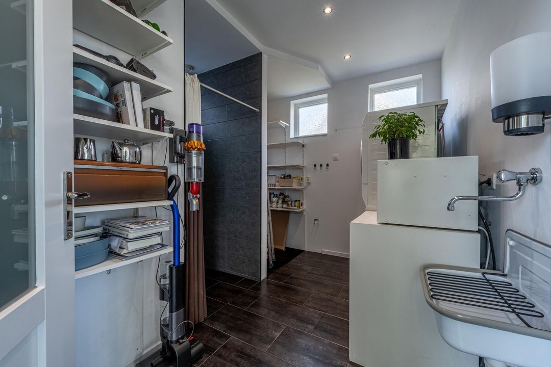 Aangrenzend aan de keuken bevindt zich de bijkeuken. Een praktische ruimte met aansluiting voor wasmachine en droger, extra bergruimte én zelfs een tweede doucheruimte met sunshower.