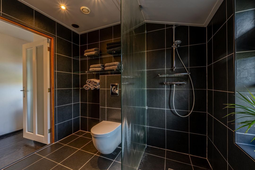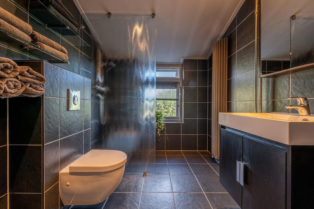 De badkamer is modern afgewerkt met zwarte vloer- en wandtegels en beschikt over een inloopdouche, toilet, wastafel en radiator. De inbouwspots in het plafond zorgen voor een strakke, rustige uitstraling.