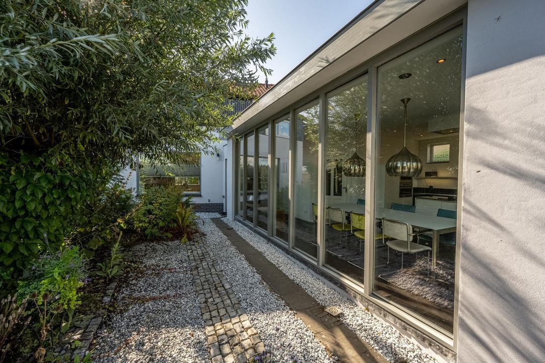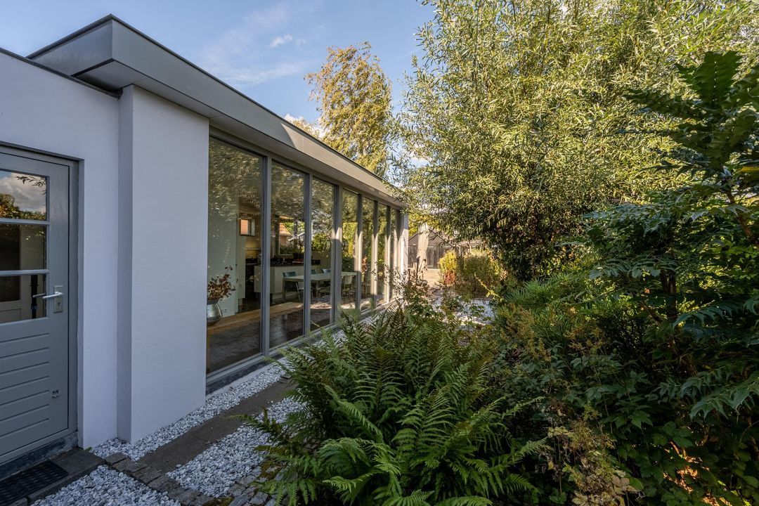Aan de achterzijde van de woning is in 2010 een aanbouw gerealiseerd, waardoor er aanzienlijk meer leefruimte is ontstaan. Hier bevindt zich het toilet, een praktische bergkast met de verdeler van de vloerverwarming én natuurlijk de moderne keuken. Dankzij de grote raampartijen geniet je hier van veel lichtinval en zicht op de tuin.