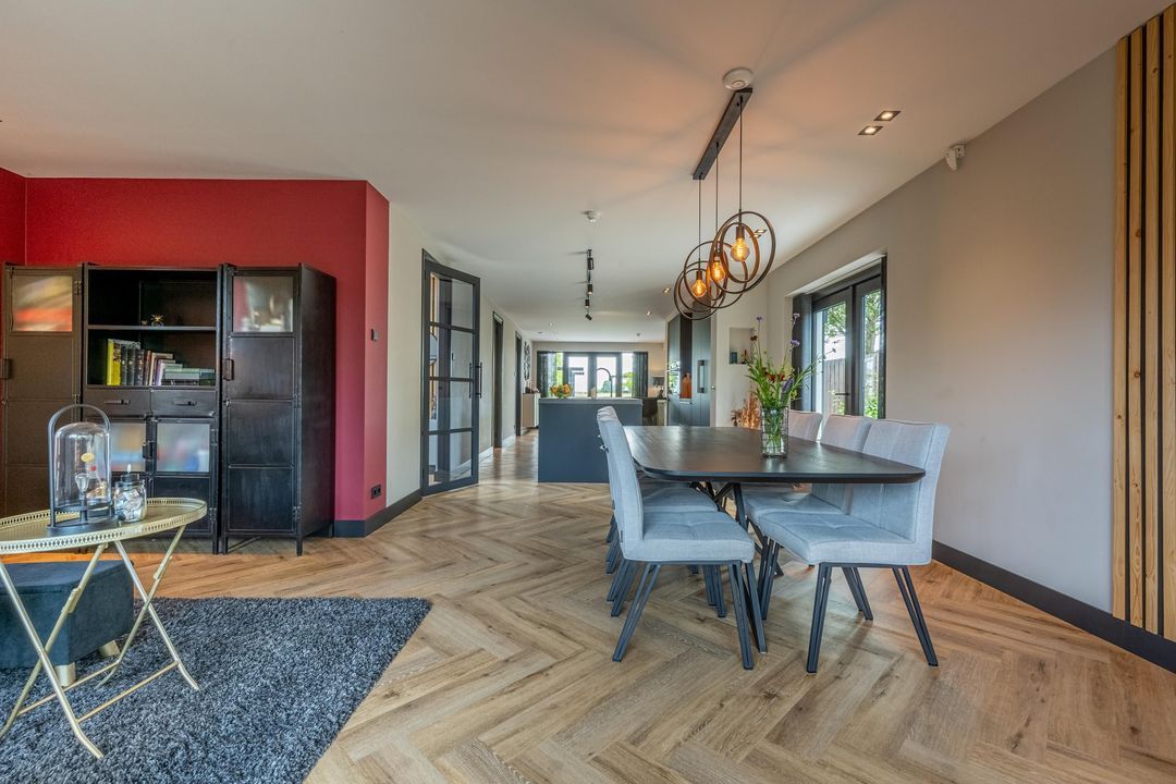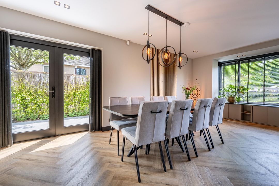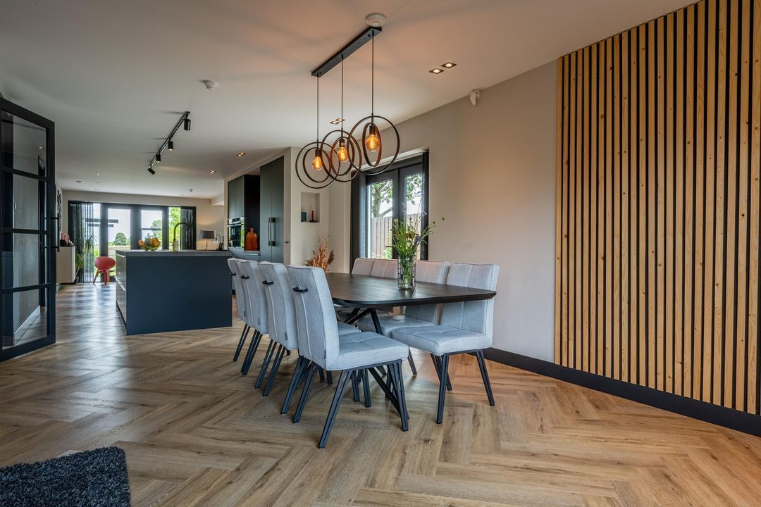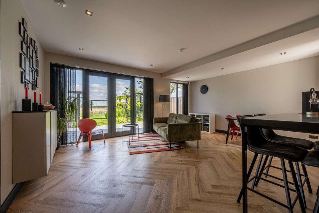 De woonkamer voelt als een oase van rust en ruimte. Aan zowel de voor- als achterzijde is plek gecreëerd voor een gezellige zithoek, zodat ieder gezinslid zijn eigen plekje vindt. De grote eettafel nodigt uit tot gezellige avonden. Via de openslaande deuren aan de achterzijde loopt binnen naadloos over in buiten – met een fenomenaal vrij uitzicht over de landerijen.