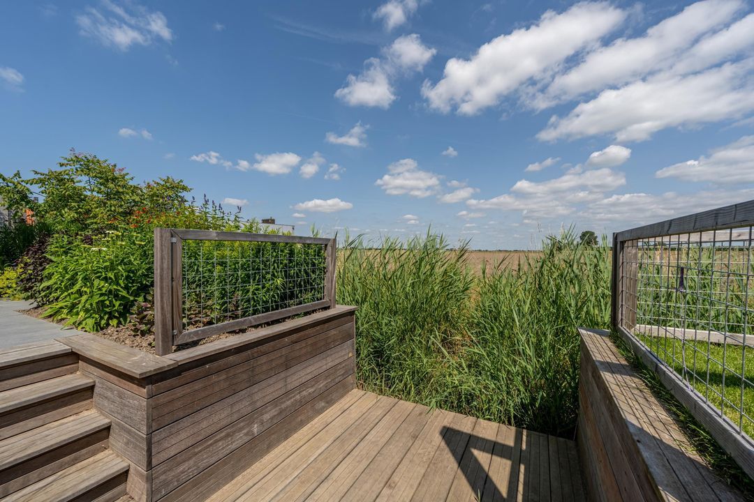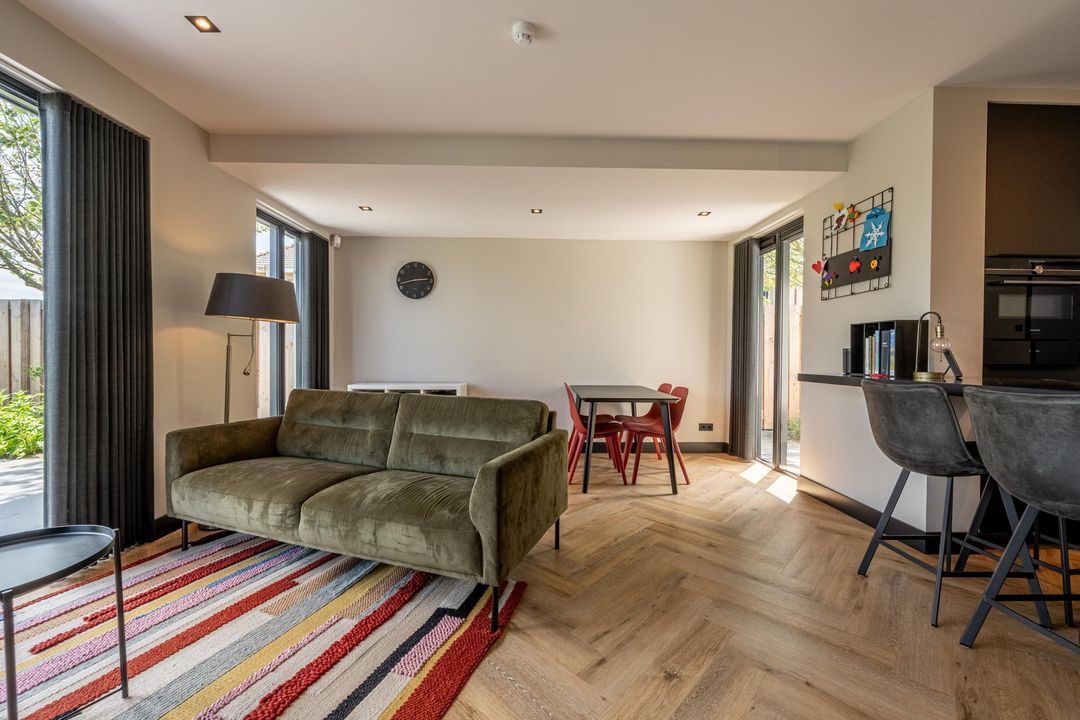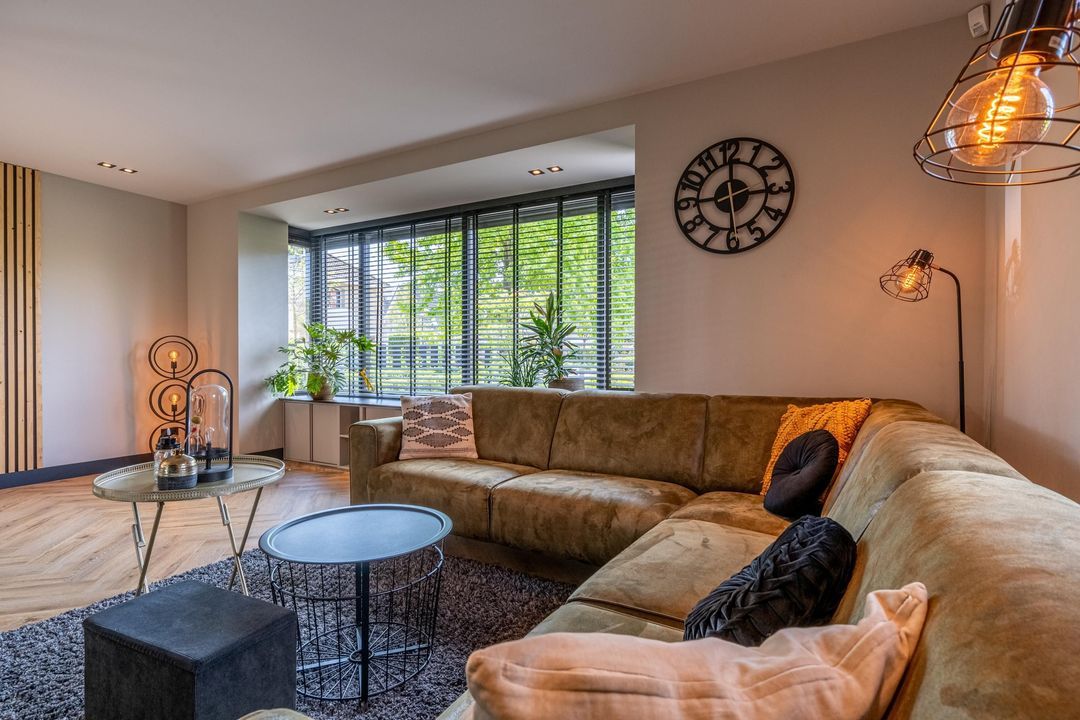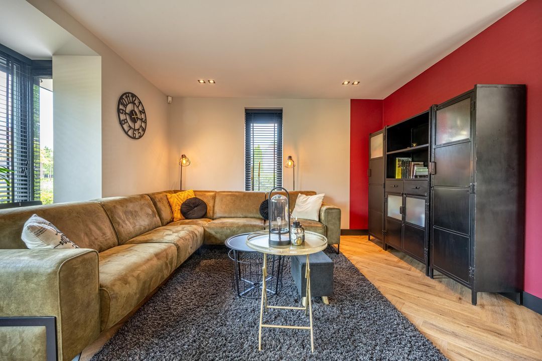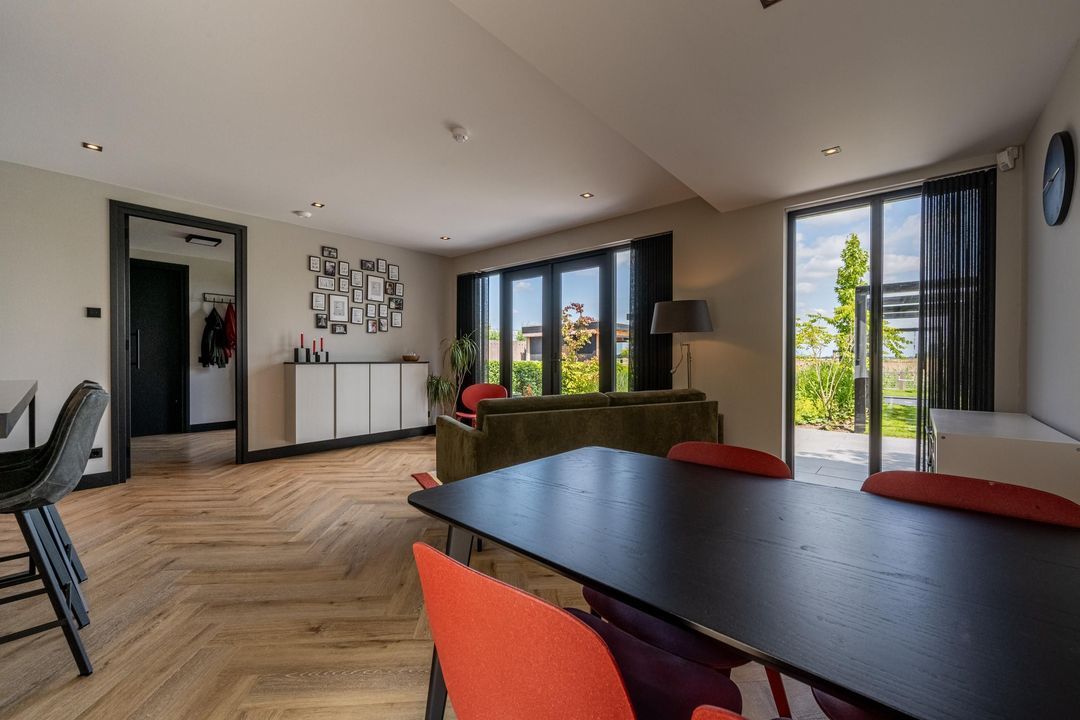 De woonkamer voelt als een oase van rust en ruimte. Aan zowel de voor- als achterzijde is plek gecreëerd voor een gezellige zithoek, zodat ieder gezinslid zijn eigen plekje vindt. De grote eettafel nodigt uit tot gezellige avonden. Via de openslaande deuren aan de achterzijde loopt binnen naadloos over in buiten – met een fenomenaal vrij uitzicht over de landerijen.