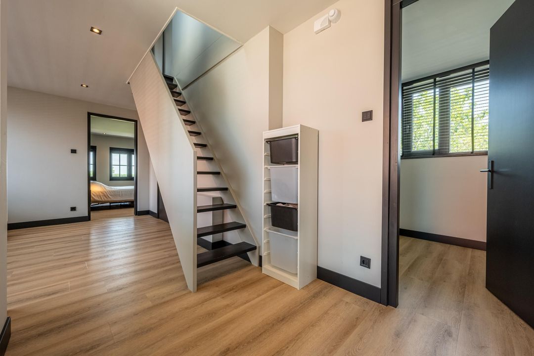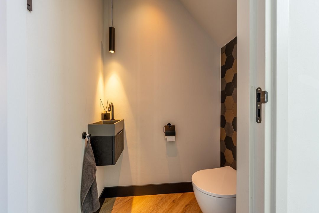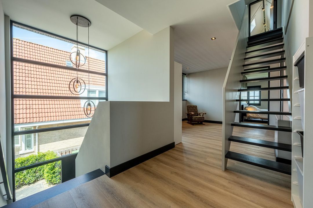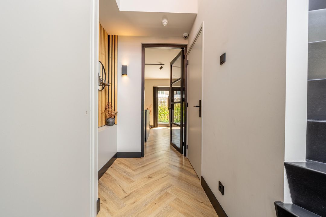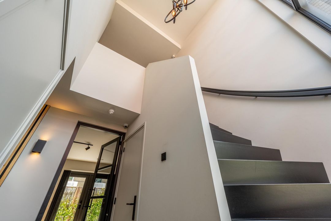 Bij binnenkomst valt meteen het imposante trappenhuis op – een echte eyecatcher die zorgt voor een ruimtelijk gevoel. Vanuit de hal is er toegang tot de trap naar de eerste verdieping, de meterkast, het moderne toilet met fonteintje én de leefruimte.