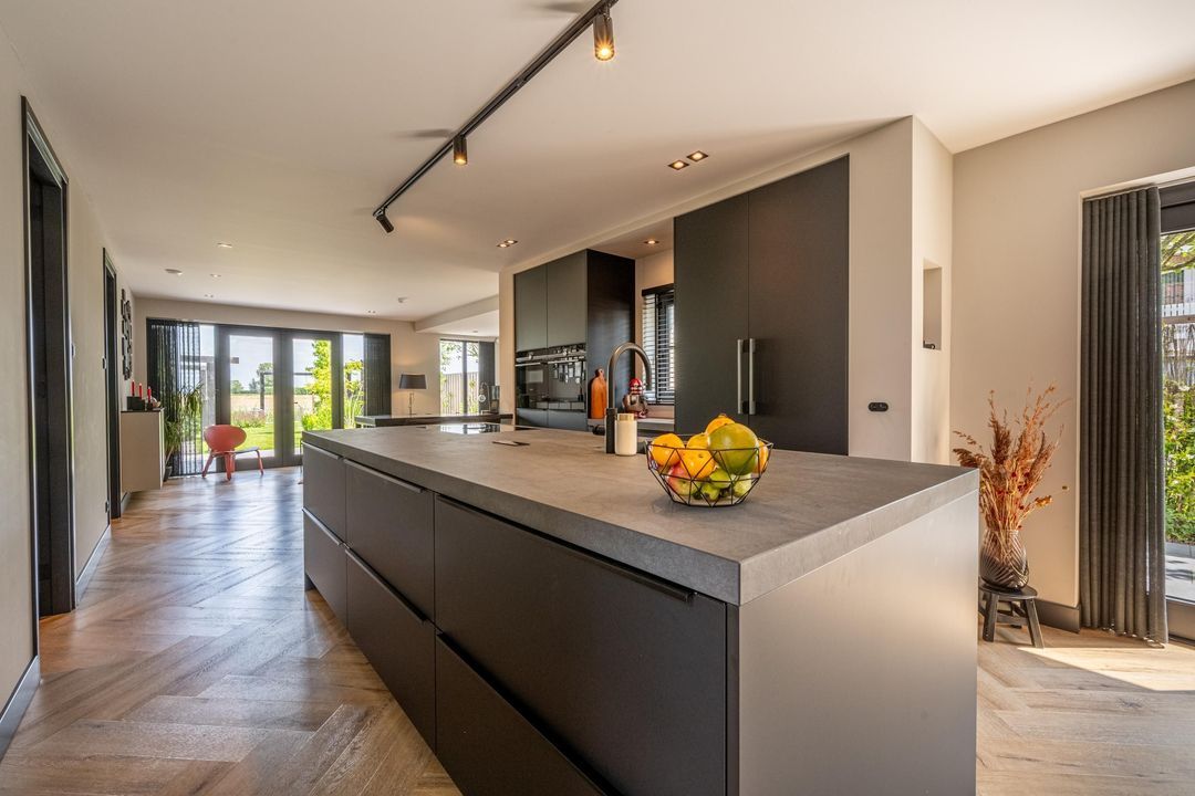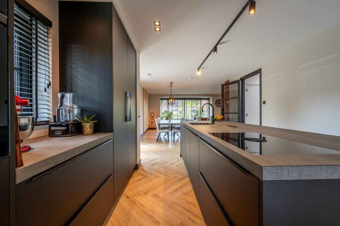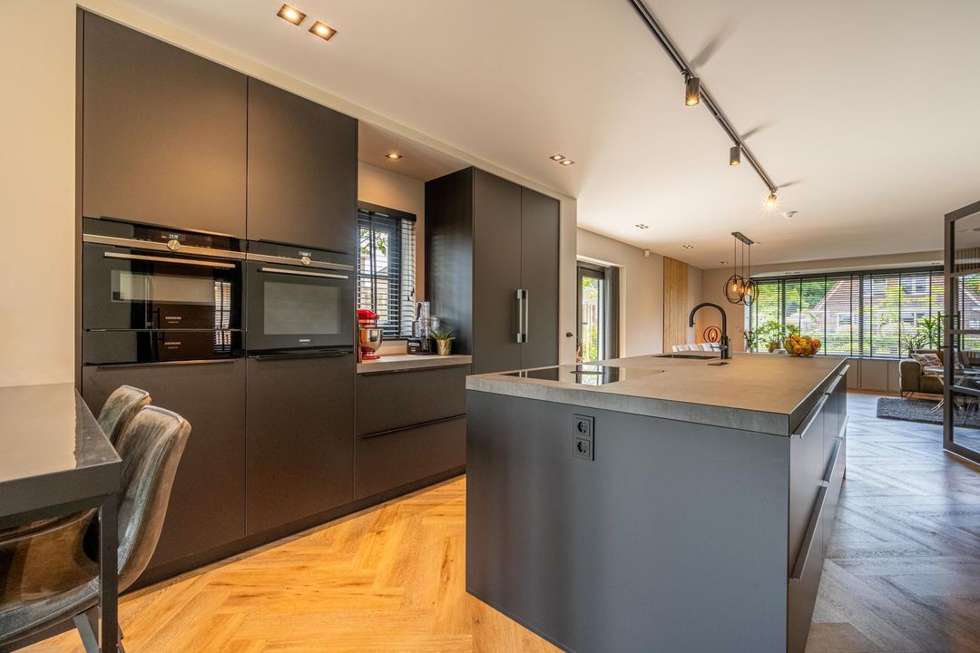 De keuken is zonder twijfel de eyecather van de woning. Deze moderne leefkeuken is uitgerust met hoogwaardige inbouwapparatuur zoals een Bora inductiekookplaat met geïntegreerde afzuiging, combi-oven, koffiemachine, warmhoudlade, vaatwasser en een royale koelkast én vriezer. Aan het barretje schuiven familie of vrienden gezellig aan tijdens het koken.