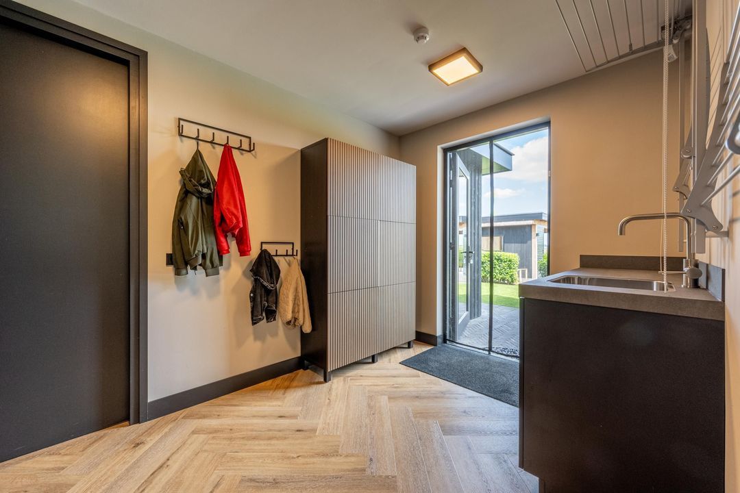 De praktische bijkeuken is ingericht als wasruimte met vaste kasten (inclusief aansluiting voor de wasmachine en wasdroger en volop opbergruimte voor jassen en schoenen. Een extra spoelgelegenheid maakt het plaatje compleet. Vanuit hier is er directe toegang tot zowel de tuin als de ruime garage.