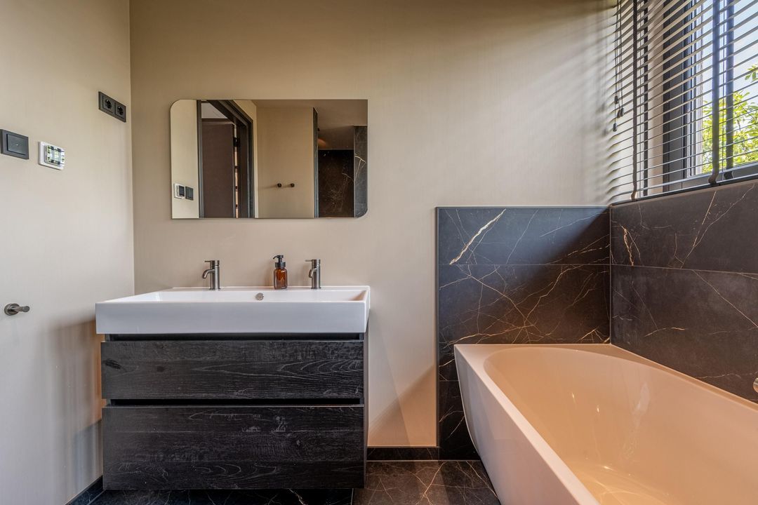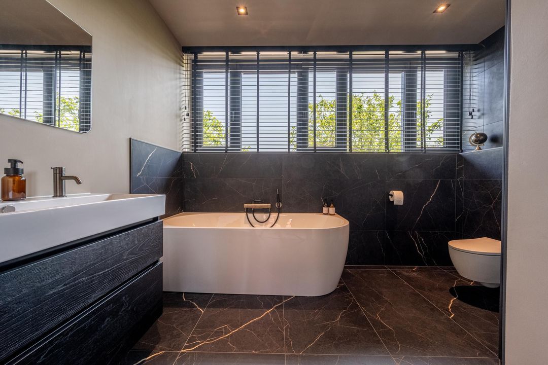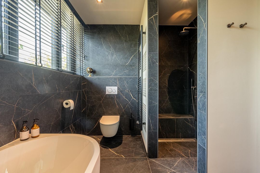 De combinatie van zwarte marmerlook tegels met strak stucwerk geeft het geheel een luxe uitstraling. De ruimte is compleet uitgerust met een inloopdouche met regen- en handdouche, een vrijstaand ligbad, een dubbel wastafelmeubel en een toilet.