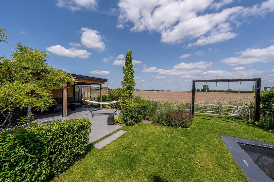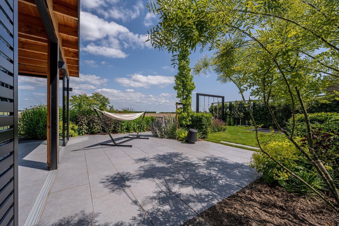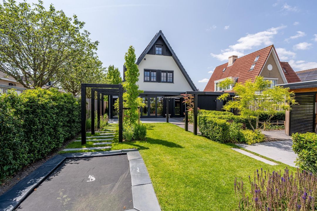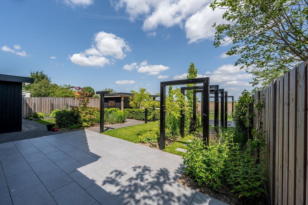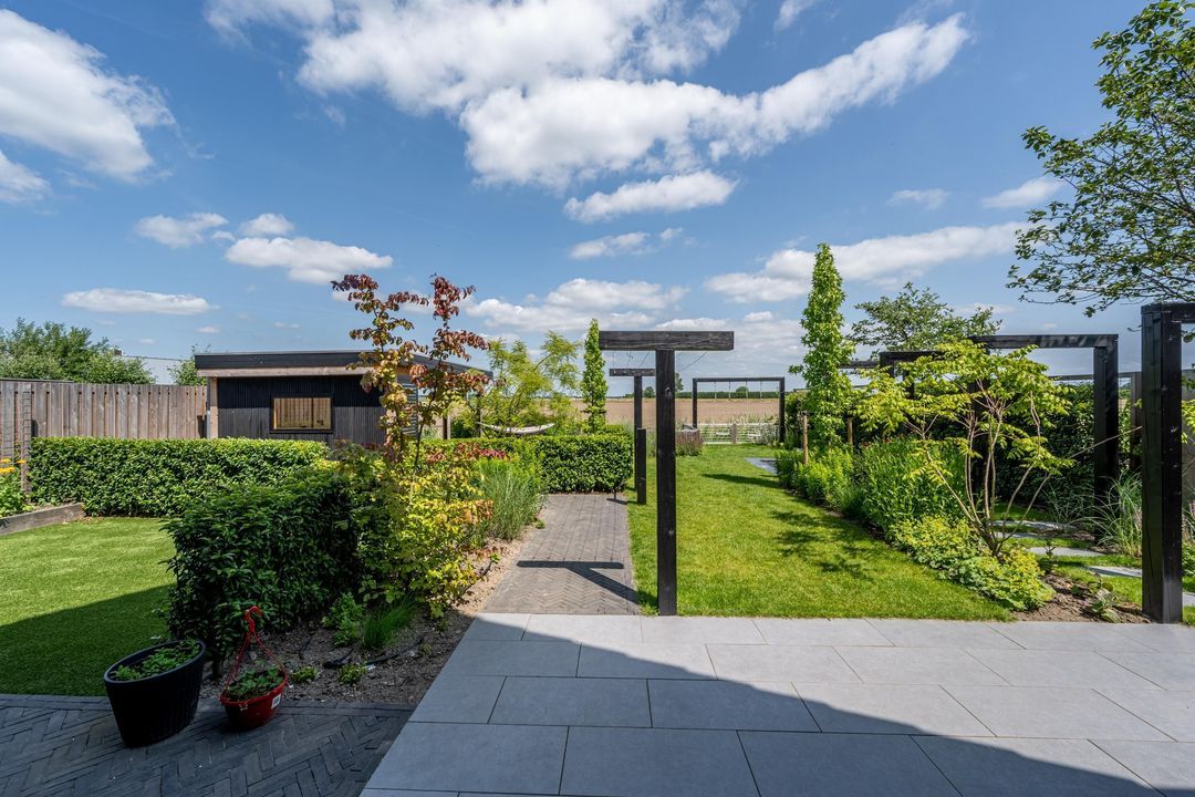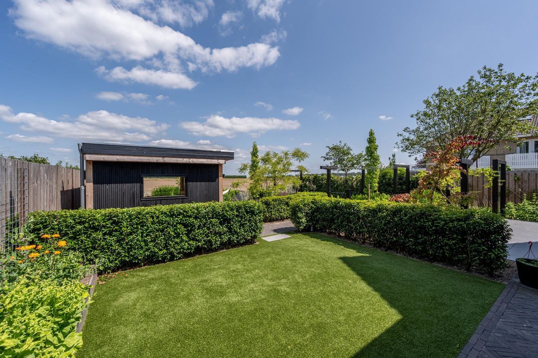 De fraai aangelegde tuin is ontworpen door een tuinarchitect en biedt een perfecte balans tussen stijl en comfort. Dankzij de combinatie van kunstgras en echt gras geniet je van een verzorgde uitstraling zonder in te leveren op gemak. De tuin is voorzien van een bewateringssysteem.