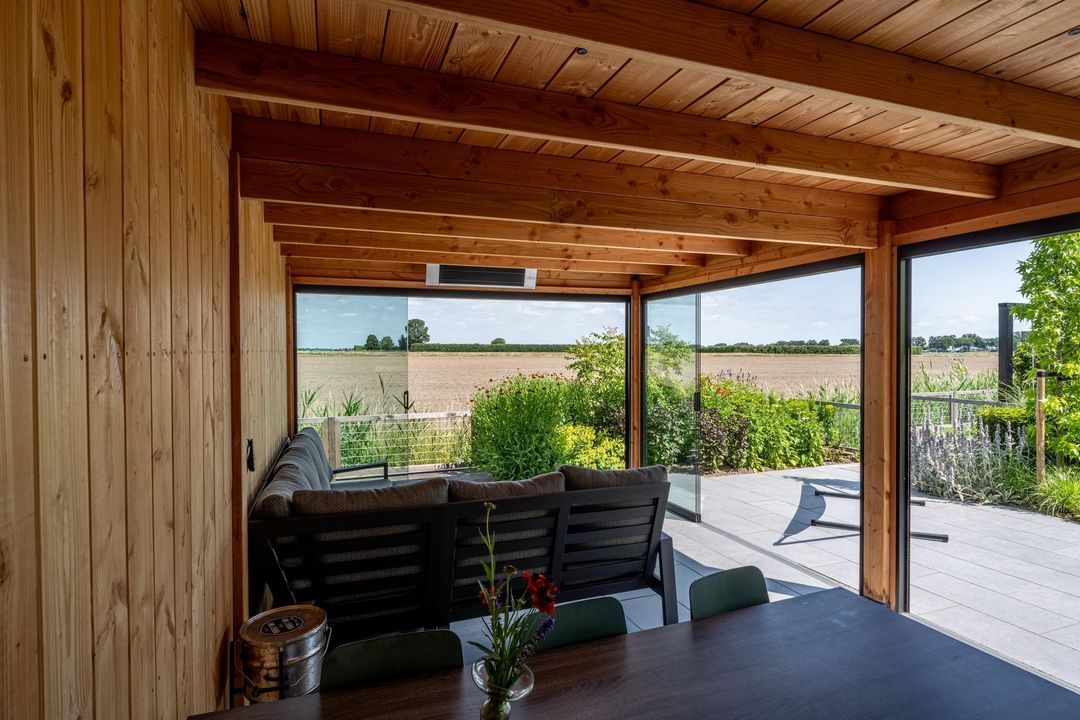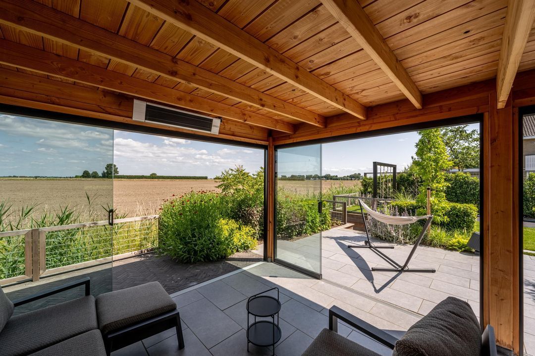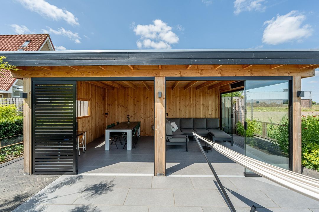 Daarnaast is er een royale veranda waar je dankzij glazen schuifdeuren het hele jaar door heerlijk buiten kunt zitten.
