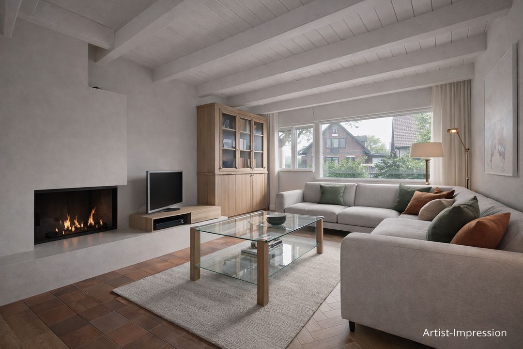 - Split level woonkamer met open haard