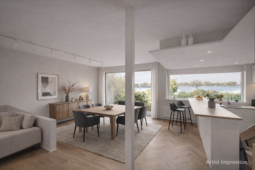De woonkamer is speels ingedeeld in twee niveaus. Aan de voorzijde ligt de zitkamer met sfeervolle open haard, balkenplafond en grote ramen. Een paar treden lager kom je in de eetkamer met schuifpui naar de tuin. De open keuken sluit hier mooi bij aan. Vanaf beide plekken kijk je fraai weg over de lange achtertuin en de Binnenmaas.