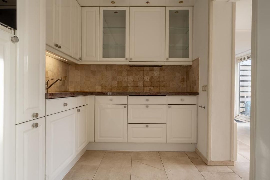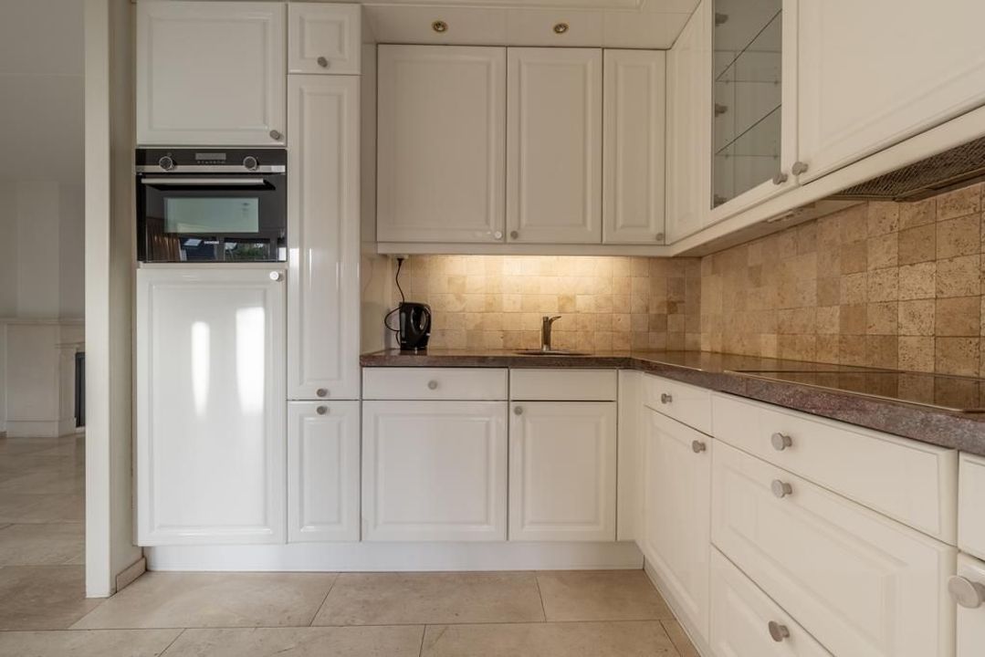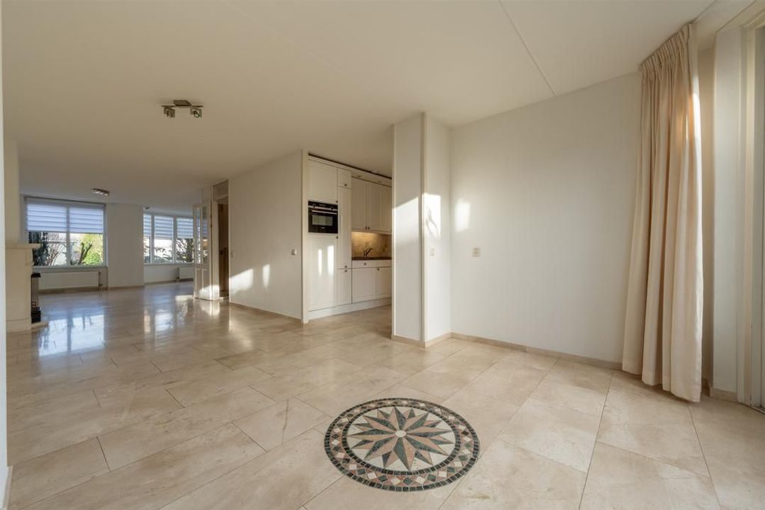 De woonkamer is een echte “living” er is ruimte voor 2 zitgedeelten met centraal een sfeerbepalende open haard. De half open keuken mag met recht rijk ingericht en passend bij het geheel worden genoemd. Het aanrecht in hoekopstelling heeft een granieten blad, witte hoogglans kasten en complete inbouwapparatuur. Zo zijn een apothekerskast, keramische kookplaat, afzuigkap, koelkast, hete-lucht oven en vaatwasmachine ingebouwd.