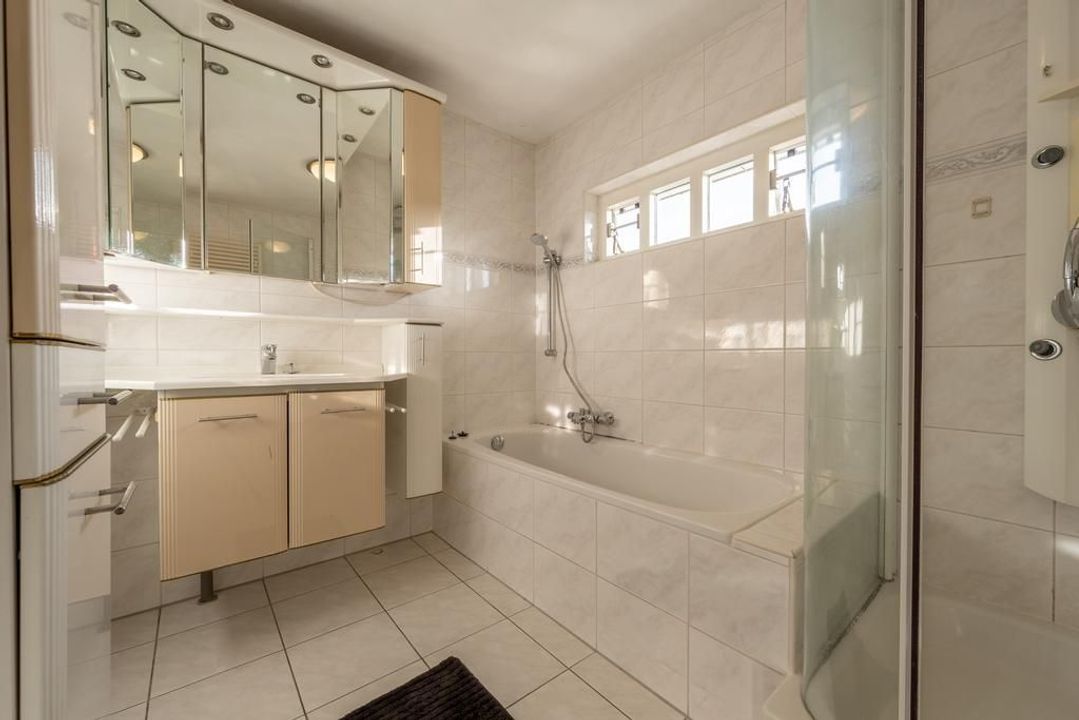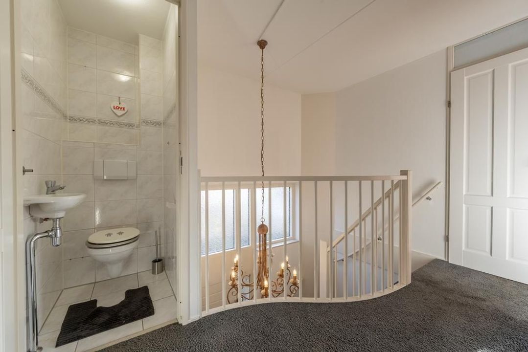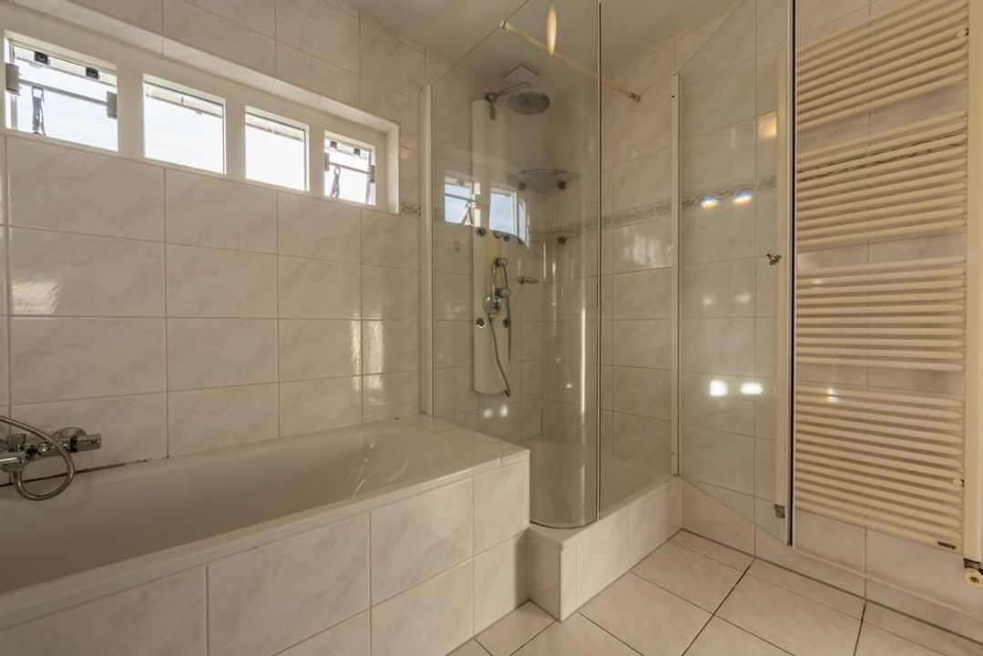 Er is een overloop met separaat toilet met wandcloset en fonteintje, 3 slaapkamers en een moderne badkamer ingericht met bad, douche en badkamermeubel met wastafel.