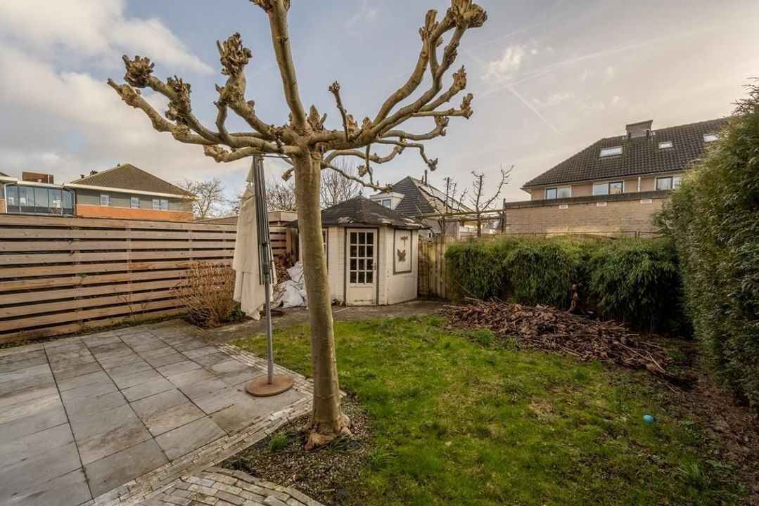 Heerlijk vrije achtertuin met groot zonneterras waar u in alle rust kunt loungen of barbecueën met vrienden. Voor tuinmeubelen en gereedschap is voldoende plek in het houten tuinhuisje.